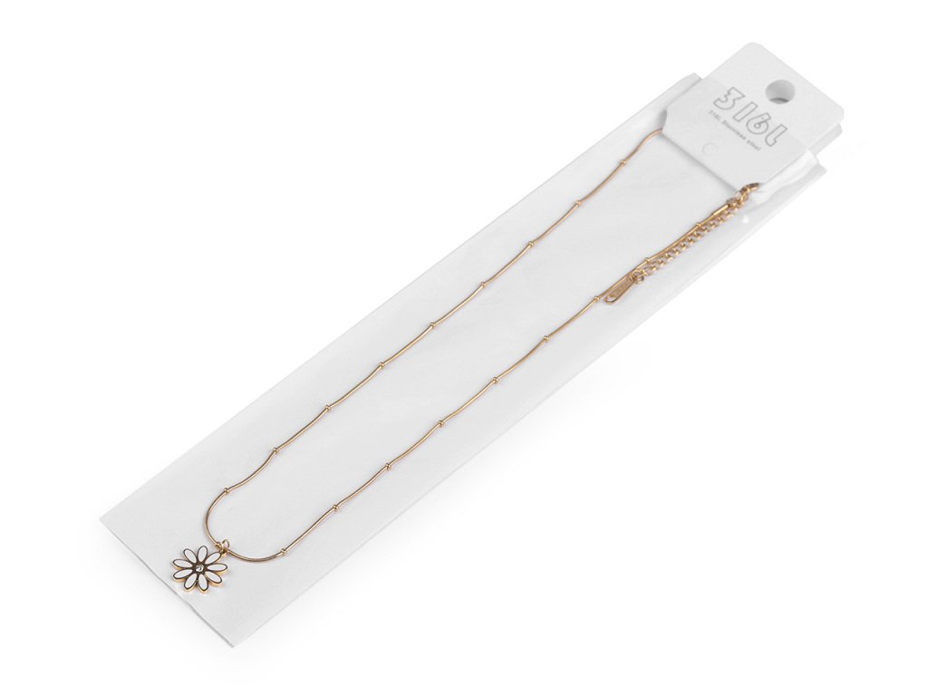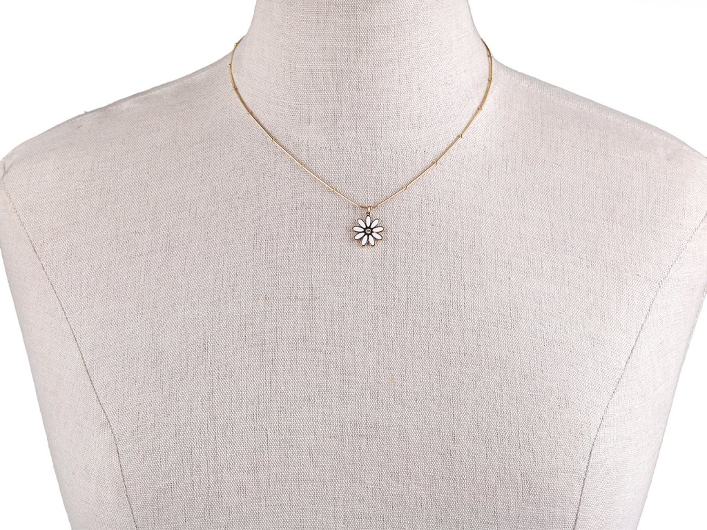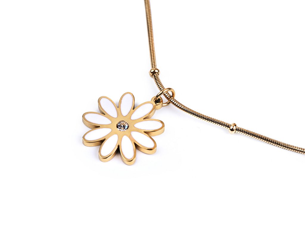 Náhrdelník s půvabným přívěskem květu je vyrobený z kvalitní nerezové oceli. Květ je kromě bílých smaltovaných lístků ozdobený broušeným kamínkem, který se poutavě třpytí. Je zavěšený na hadím řetízku s kuličkami. Náhrdelník decentně dozdobí většinu outfitů. Zapíná se na karabinku s prodlužovacím řetízkem. Přívěsek nejde z řetízku sundat.- Délka: 40 cm