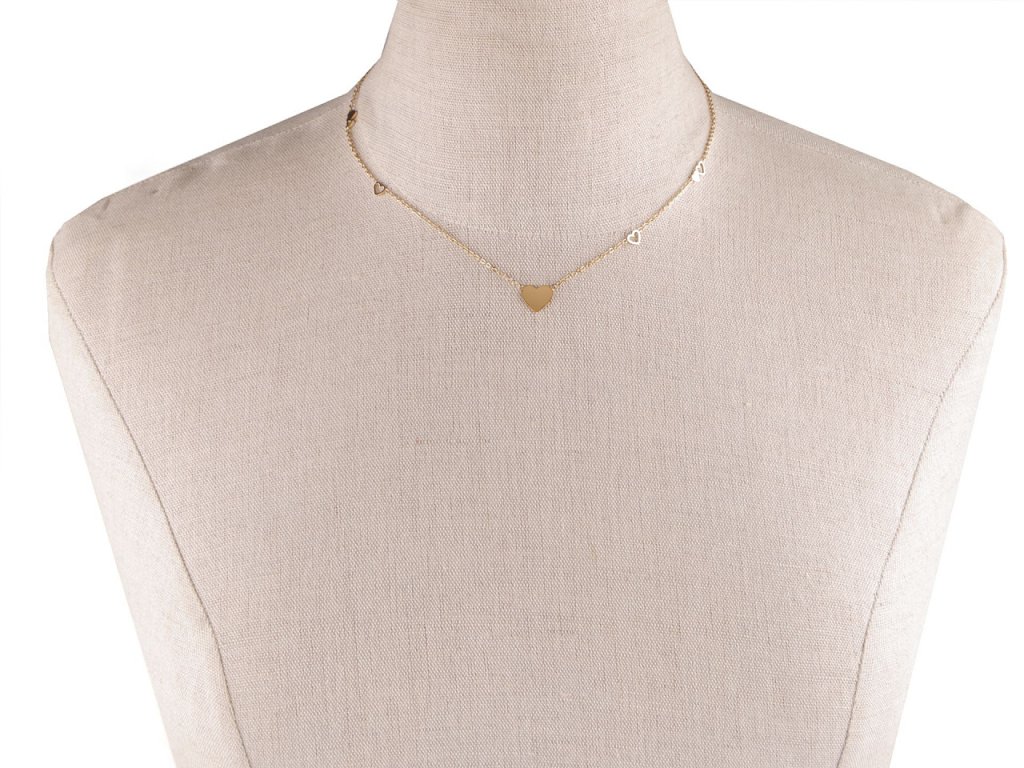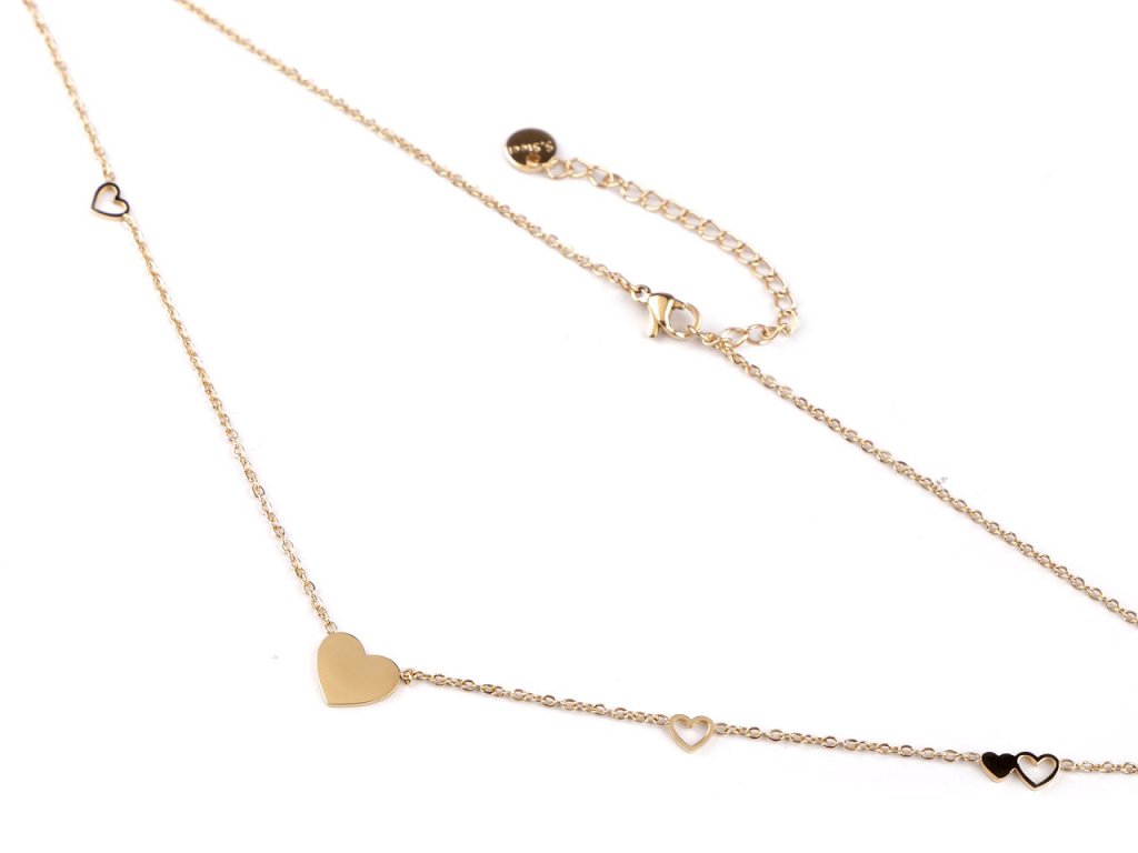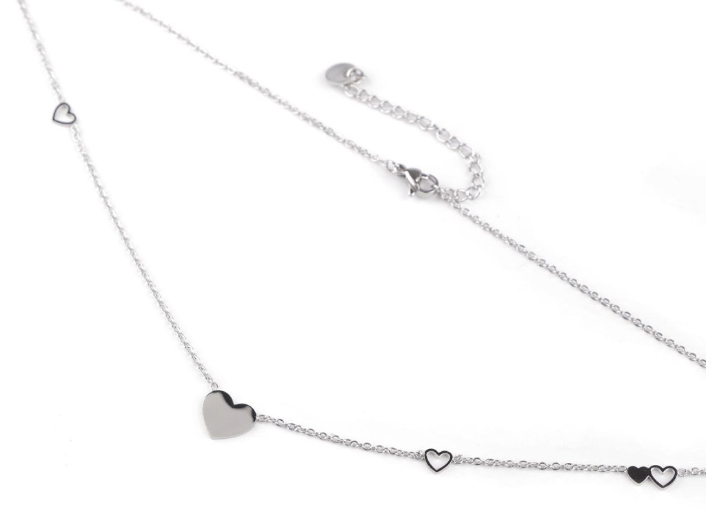 Náhrdelník se srdíčky je vyrobený z kvalitní nerezové oceli. Zajímavě a decentně dozdobí většinu outfitů. Ozdoby mají zrcadlový lesk, na řetízcích jsou pevně připojené. Náhrdelník se zapíná na karabinku s prodlužovacím řetízkem.- Délka: 40 cm