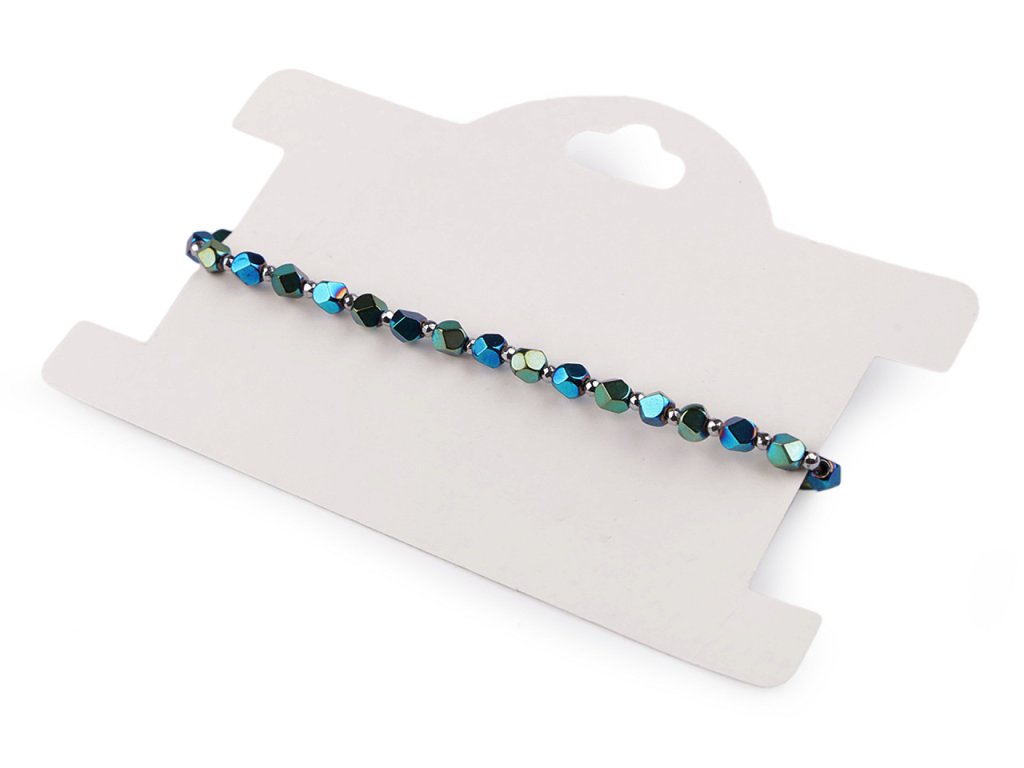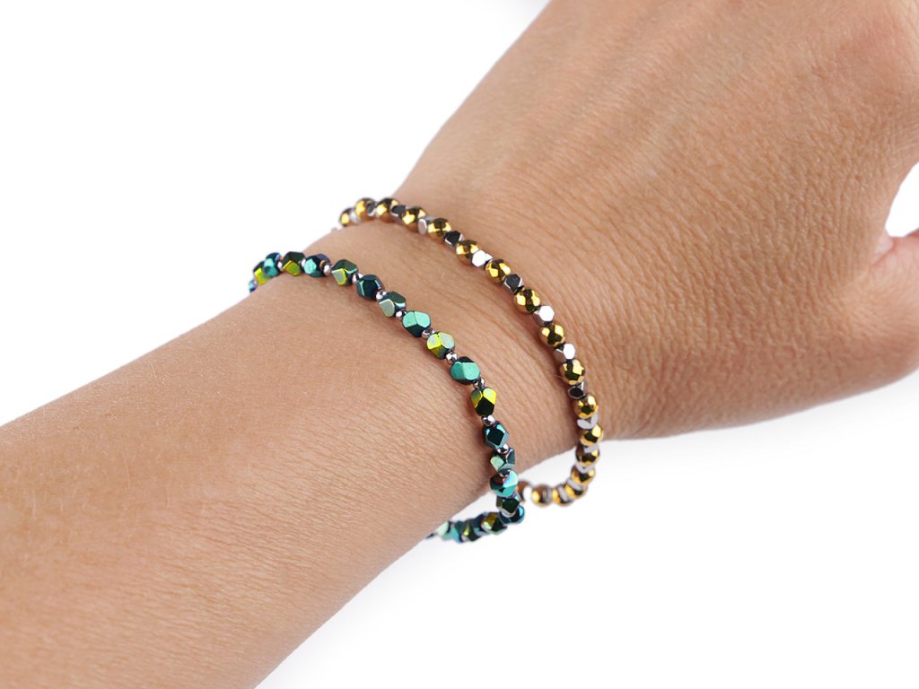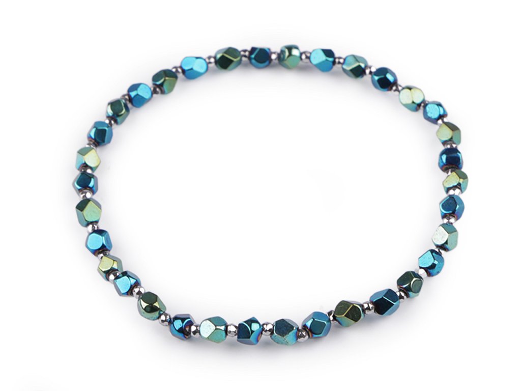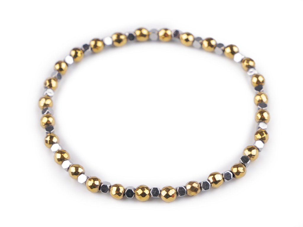 Náramek z broušených korálků pokoveného hematitu je velice elegantní. Díky pružence se náramek snadno natáhne na ruku, má univerzální velikost. Hematitový náramek patří mezi šperky, které díky své fascinující povrchové úpravě zaujmou na první pohled. Broušené plošky vytvářejí efektní světelné odlesky. Náramek potěší každou ženu, je dárkem, se kterým nešlápnete vedle. Hodí se ke slavnostním příležitostem, skvěle podtrhne i business styl oblékání.- Délka: 16 - 24 cm