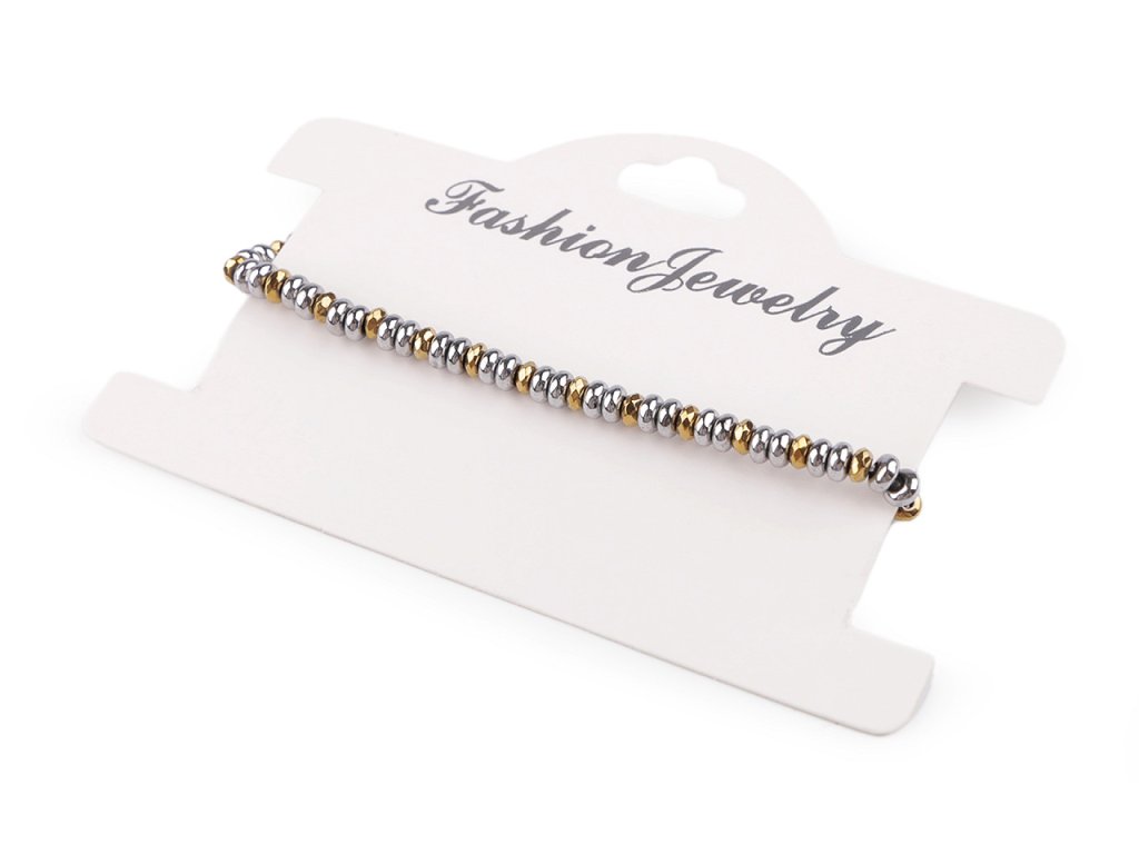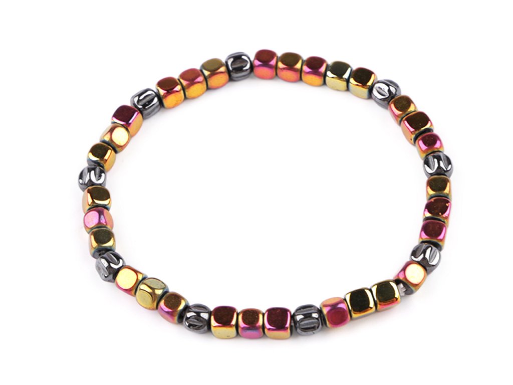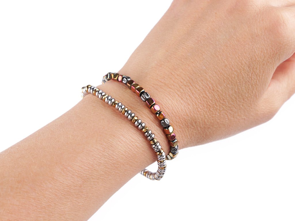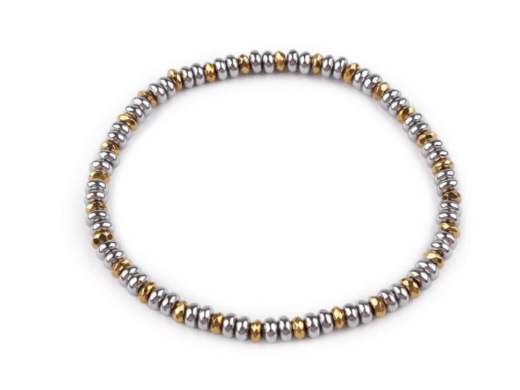 Elegantní náramek je vyrobený ze zajímavých korálků pokoveného hematitu. Díky pružence se náramek snadno natáhne na ruku, má univerzální velikost. Hematitový náramek patří mezi šperky, které díky své fascinující povrchové úpravě zaujmou na první pohled. Náramek potěší každou ženu, je dárkem, se kterým nešlápnete vedle. Hodí se ke slavnostním příležitostem, skvěle podtrhne i business styl oblékání.- Délka: 15 - 24 cm