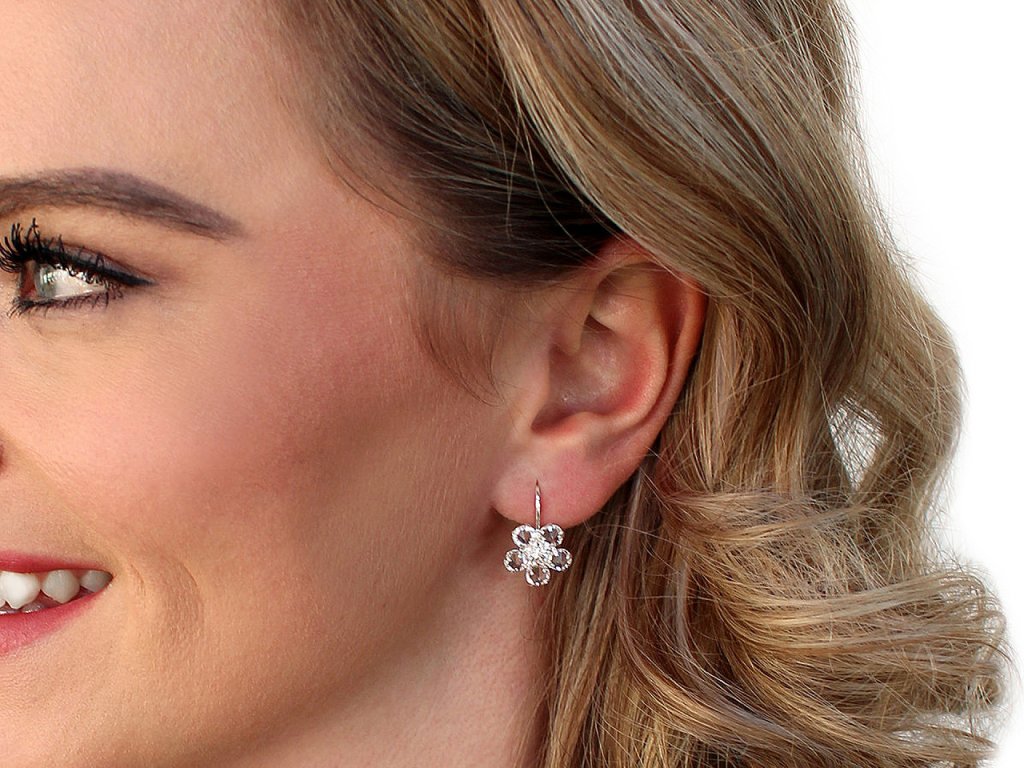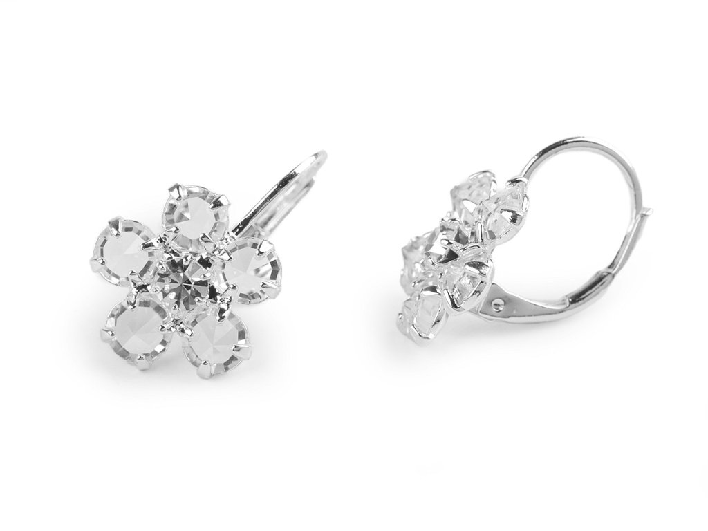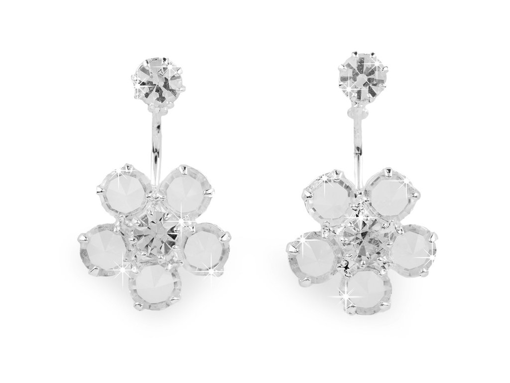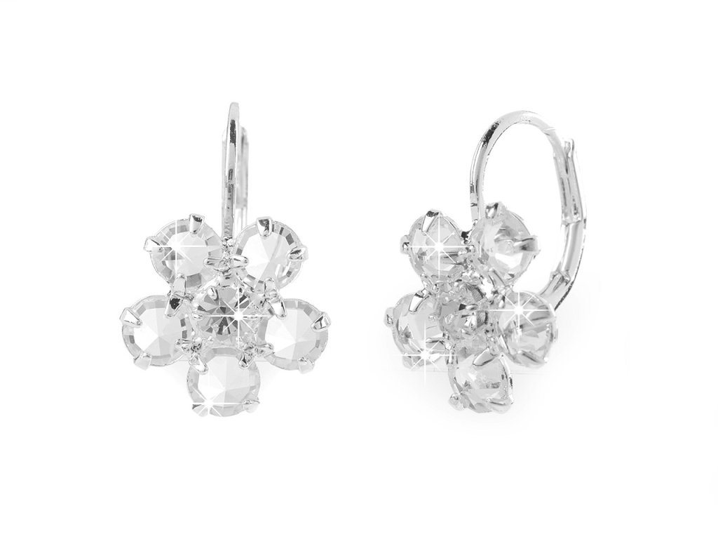 Elegantní náušnice s květem jsou ozdobené broušenými kamínky. Každá žena je ocení na běžné nošení i slavnostní události, jsou nepřehlédnutelné. Skleněné broušené kamínky mají prvotřídní českou kvalitu jsou pevně zasazené do kovového lůžka. Na slunci i umělém světle se náušnice zajímavě třpytí. Kov na náušnicích má povrchovou úpravu se stříbrnou galvanizací. Náušnice mají uzavřené mechanické zapínání.- Šířka: 13 mm