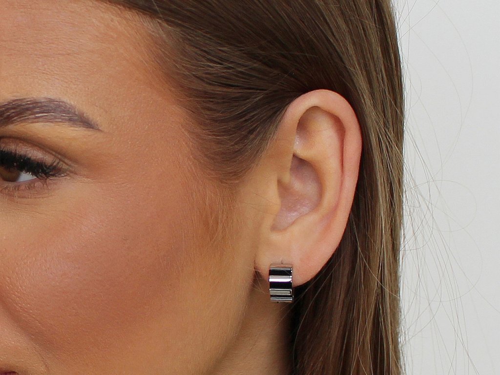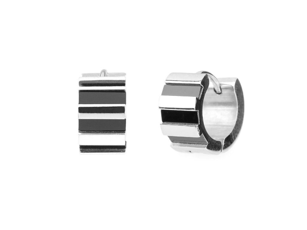 Náušnice kroužky z kvalitní nerezové oceli vkusně doplní jakýkoliv outfit, hodí se ke každodennímu nošení. Na přední straně je zdobí 3 vodorovné černé pruhy. Skvěle doplní byznys styl oblékání, jeansovou módu i ležérní outfity. Působí velice decentním dojmem, mají zrcadlový lesk. Dají se rozevřít, zapínají se zacvaknutím.- Vnější průměr: 13 mm