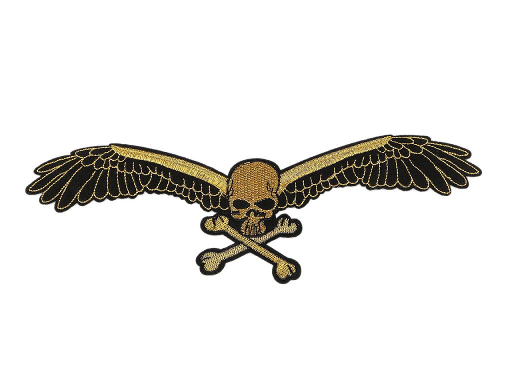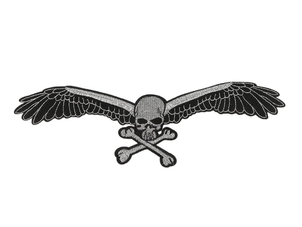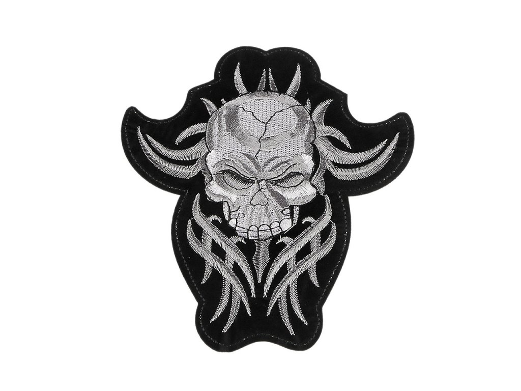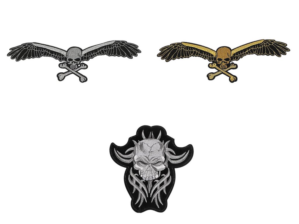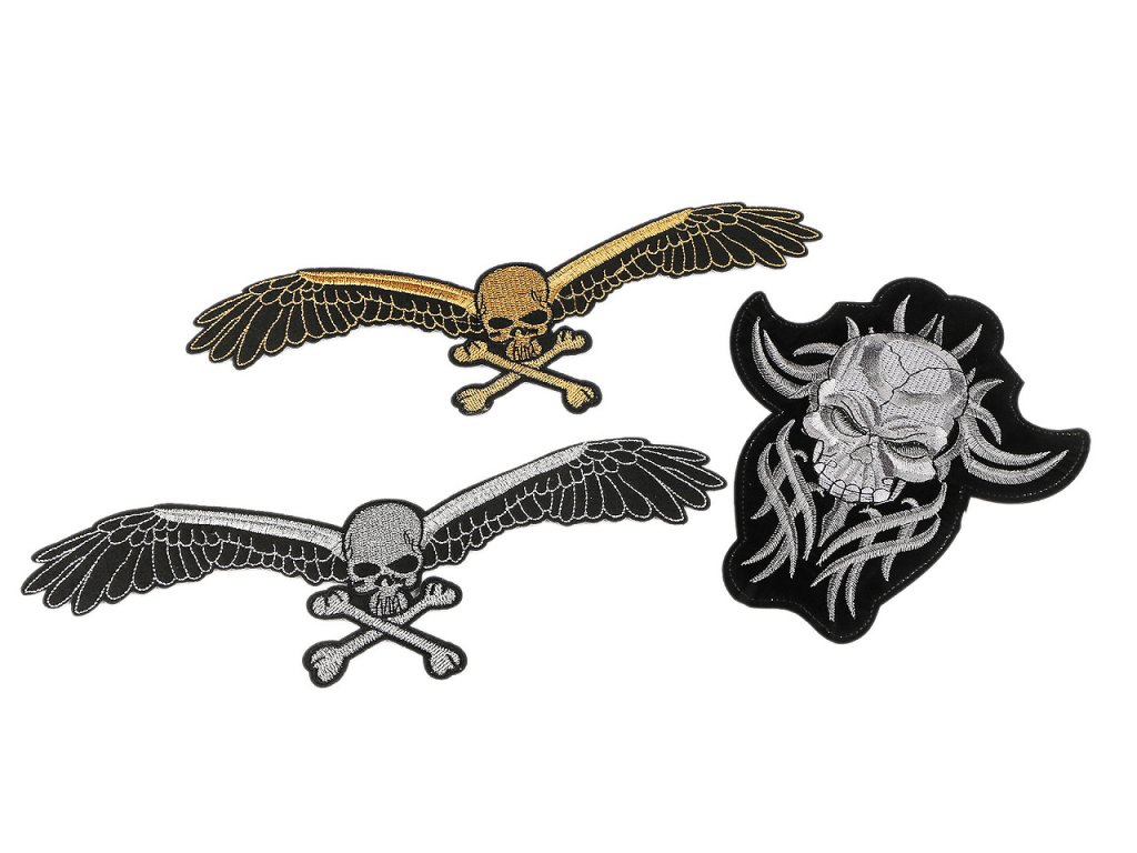 Velkou nažehlovačku s obrázkem lebky ocení každý, kdo se nebojí ukázat svůj životní postoj. Je velmi kvalitní, s detailně propracovanou výšivkou. Využijete ji k aplikaci na bundy, mikiny, trička i vlajky. Má mnohostranné využití, slouží nejen k opravě děravého oblečení, ale i k jeho ozdobení. Nažehlovačka č.1 a 2 má třpytivou lurexovou výšivku.- Rozměry: č. 1 a 2: 8,5 x 25,5 cm