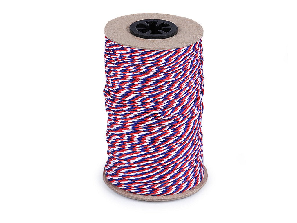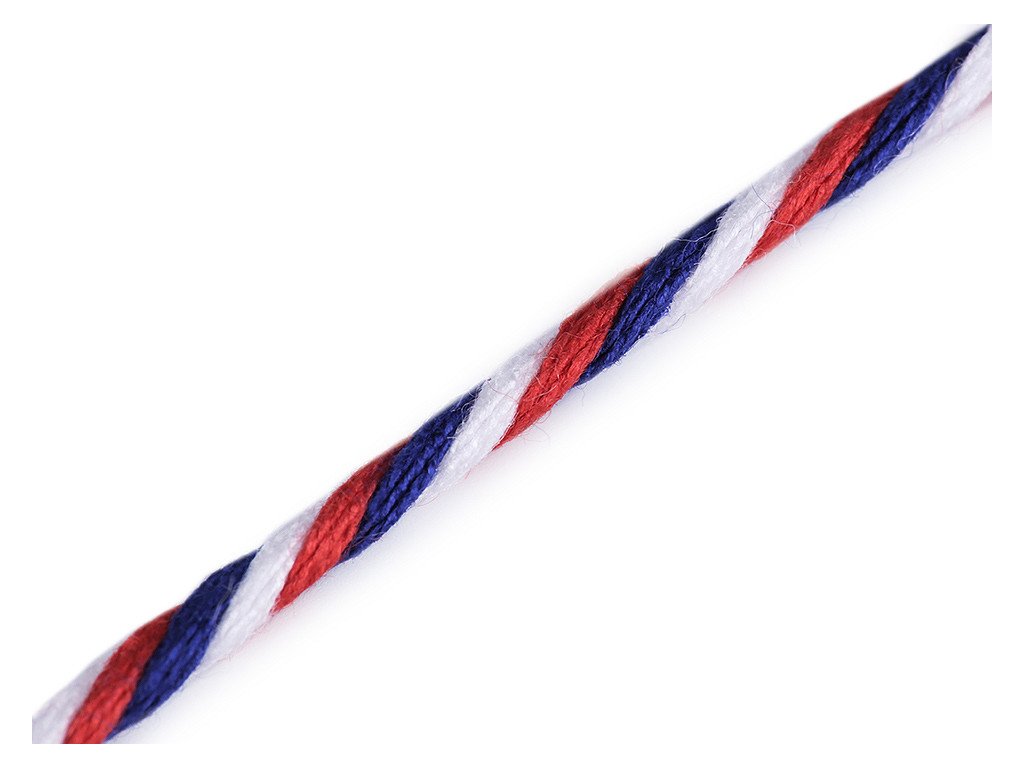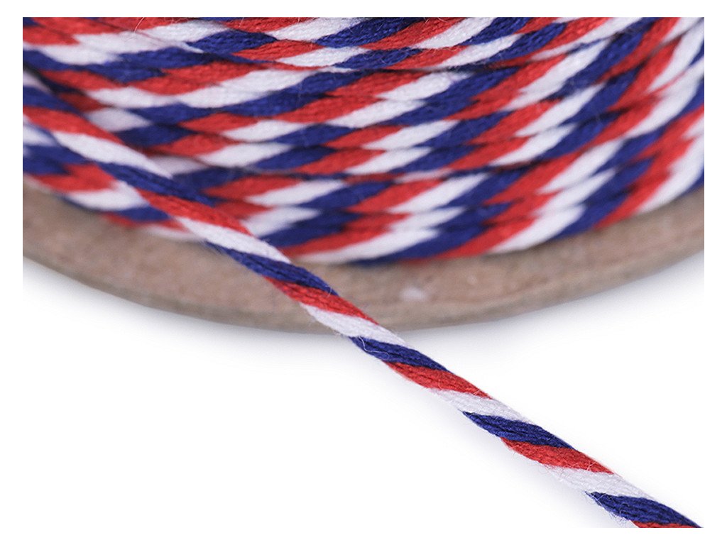 Stáčená šňůra v českých a slovenských národních barvách se hodí k výrobě různých dekorací nebo ke stylovému balení dárků. Často se používá k vázání úředních listin, znaleckých posudků nebo notářských zápisů.- Průměr: 2 mm
