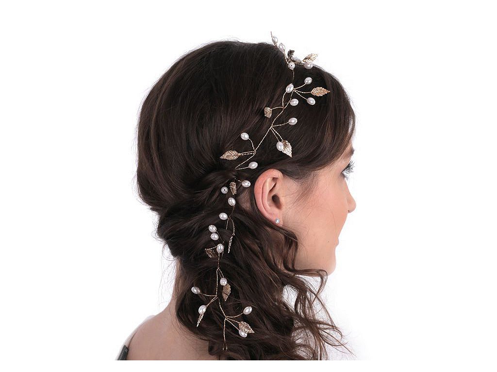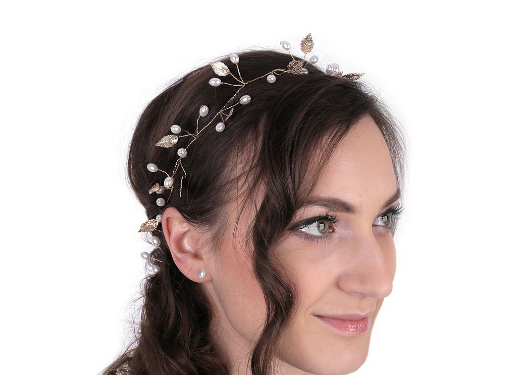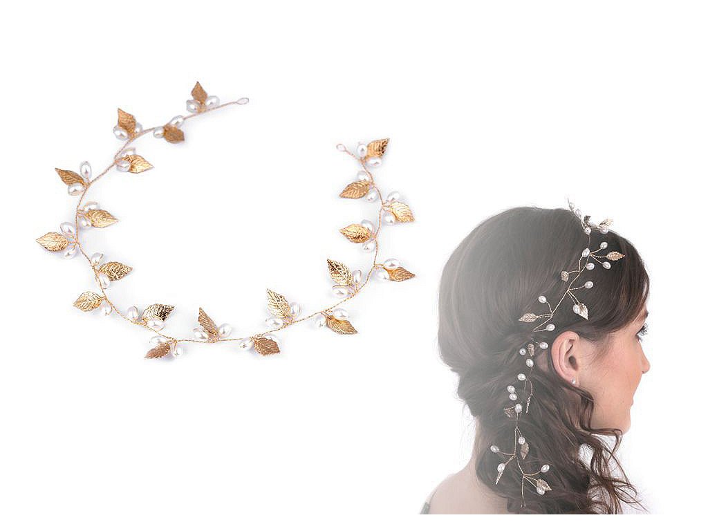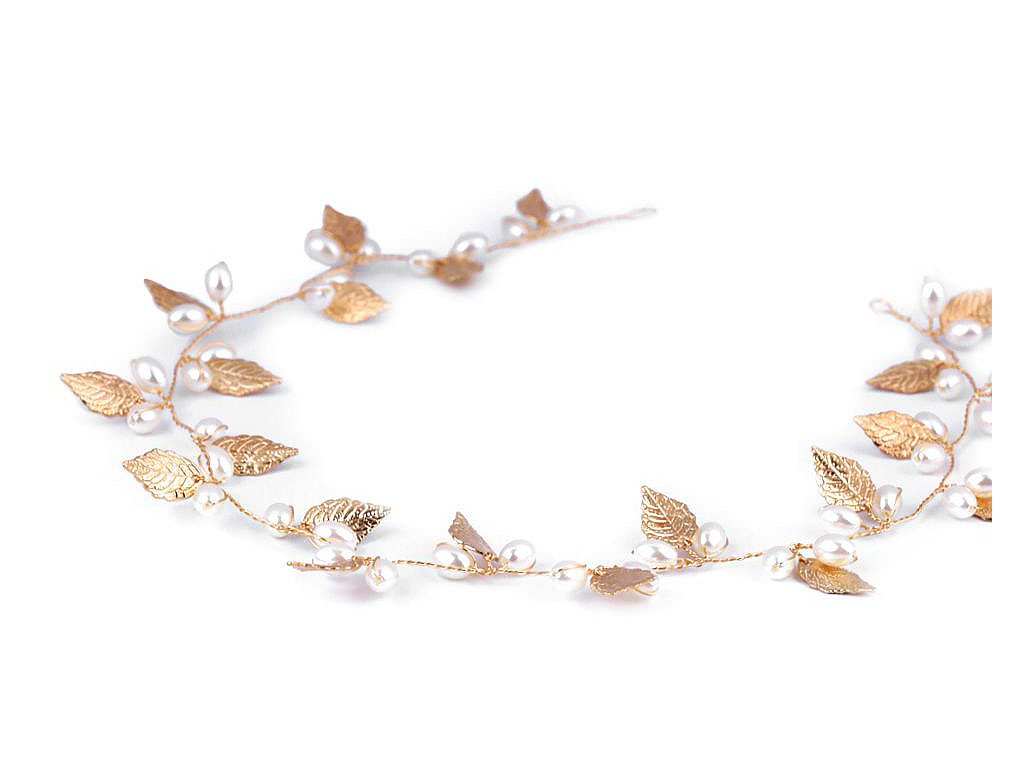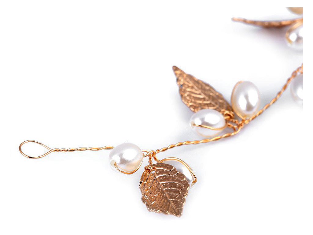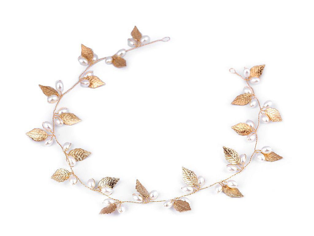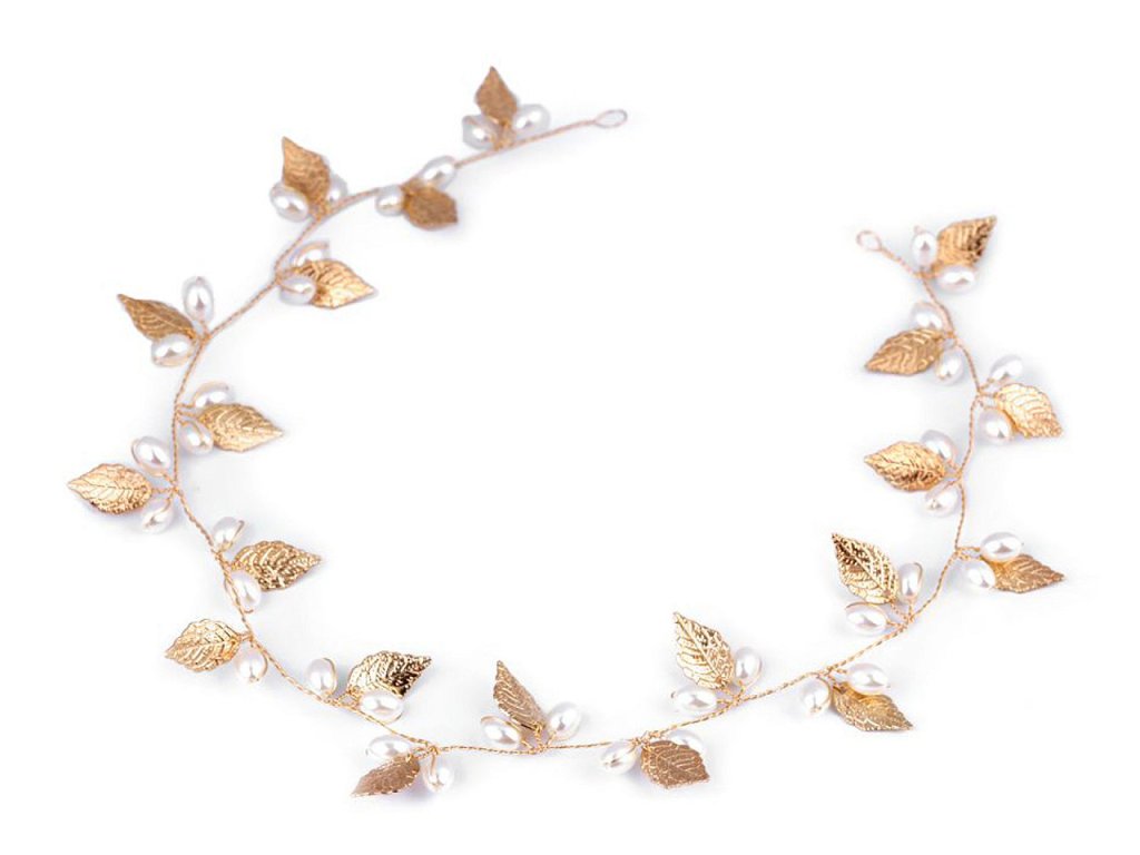 Romantická ozdoba s korálky bude jemným a elegantním doplňkem vašich vlasů. Je tvořená z dvou do sebe zapletených drátků, na které navazují zlaté lístky a voskové korálky připomínající perly. Díky drátkům je ozdoba lehce ohybatelná a lze ji prostorově tvarovat. Čelenku využijete jako nevšední doplněk na svatby, svaté přijímání či na plesy.Na vlasy ji upevníte pomocí vlasových sponek, stuhy nebo pruženky, kterou provléknete do oček (cca Ø7 mm) na koncích ozdoby.- Šířka: 7 cm