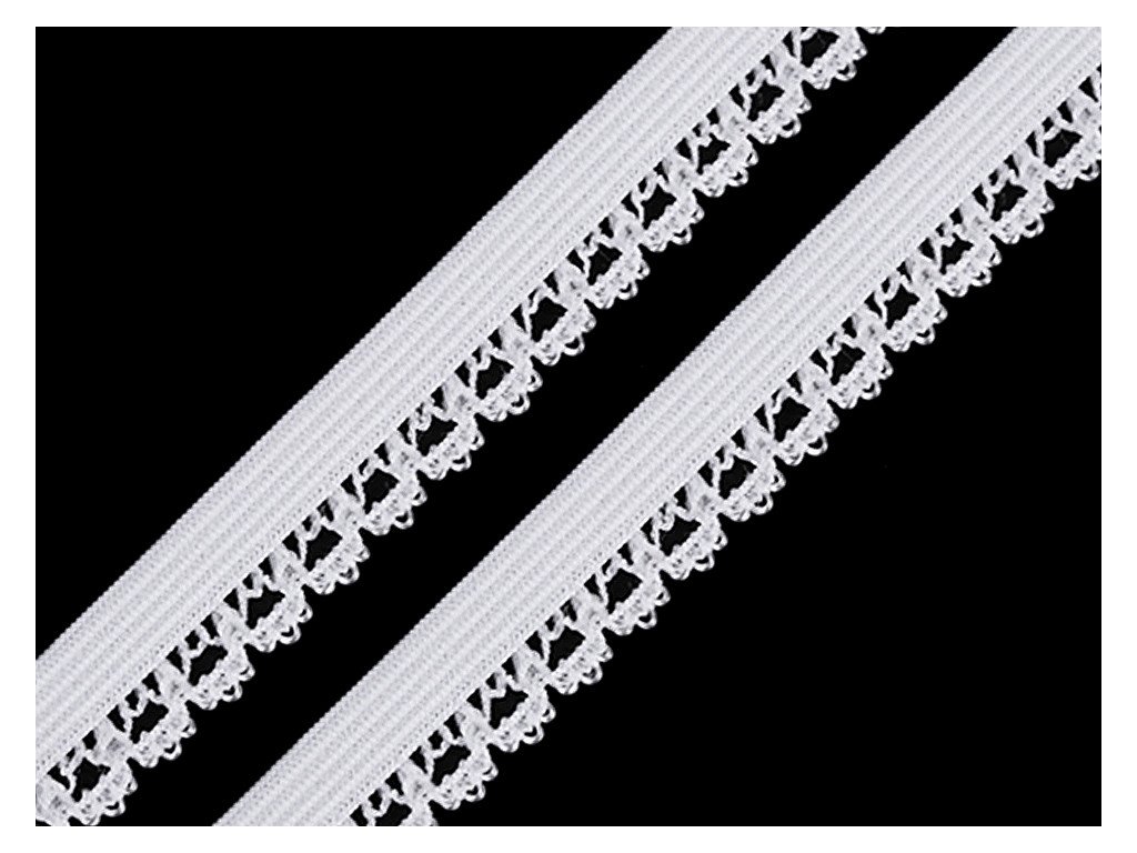 Ozdobnou pruženku zdobí okraj s malými očky z lesklé příze. Je jemná v tahu. Použití: Pruženku využijete k lemování spodního prádla, podvazků, halenek, šatů apod. Můžete ji také použít na výrobu ozdobných ramínek ke košilkám, tílkům nebo podprsenkám. Krajka má šíři 7 mm.- Šíře: 15 mm