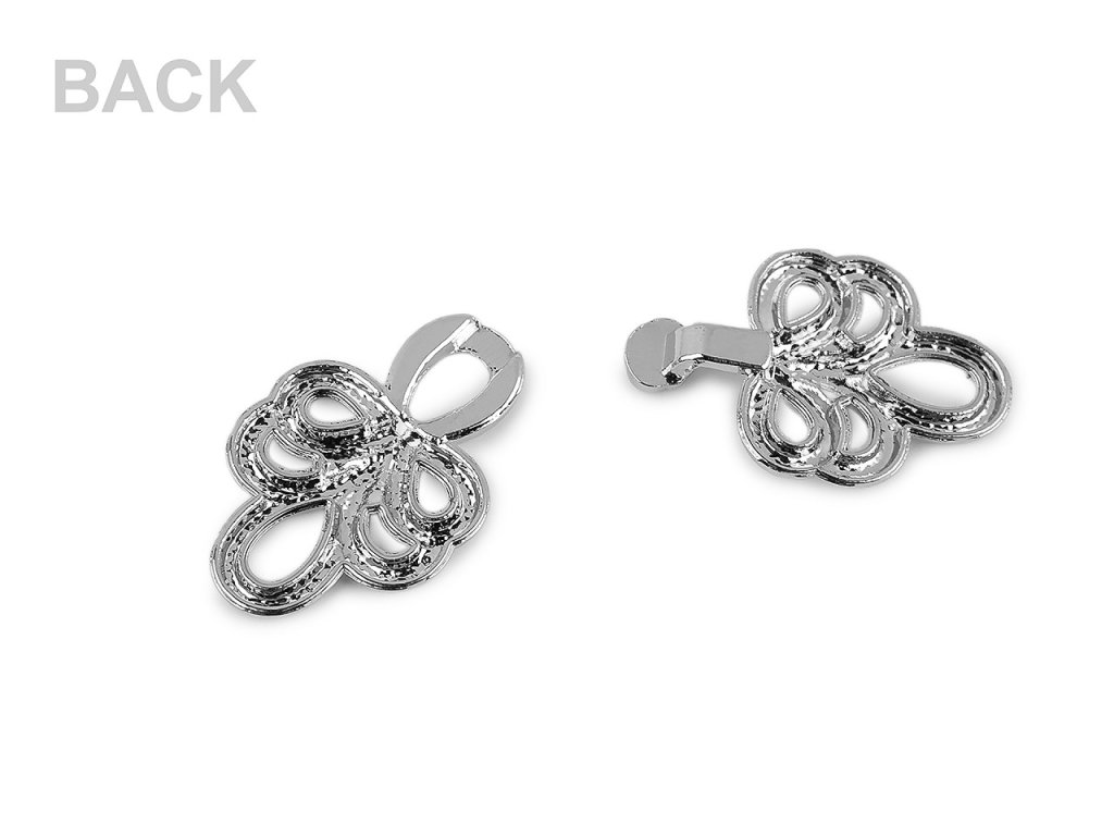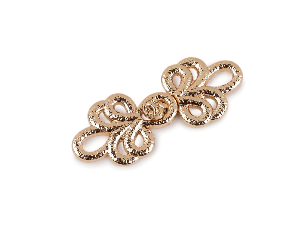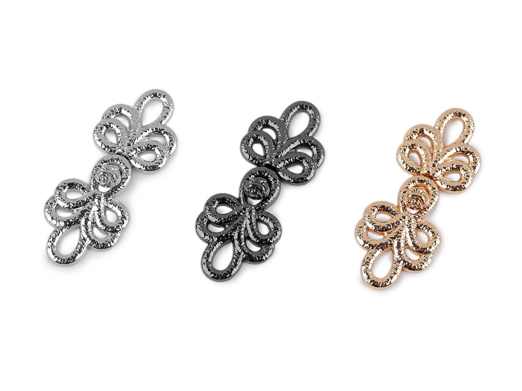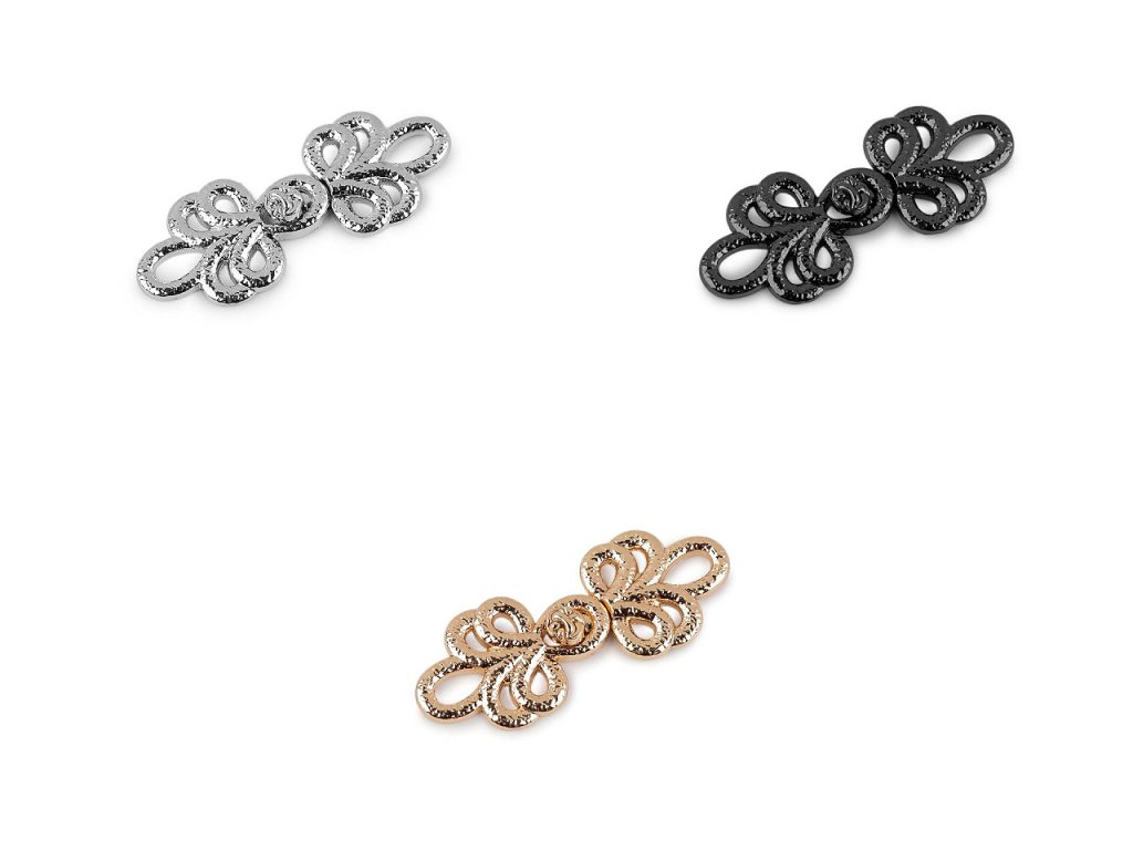 Ozdobné filigránové zapínání se skládá ze dvou částí, které do sebe provlečete a zacvaknete. Má tepaný povrch a působí elegantně. Vynikne na oděvech i doplňcích. K materiálu se přišívá. Celková délka po zapnutí je 40 mm.- Rozměry: 16 x 40 mm
