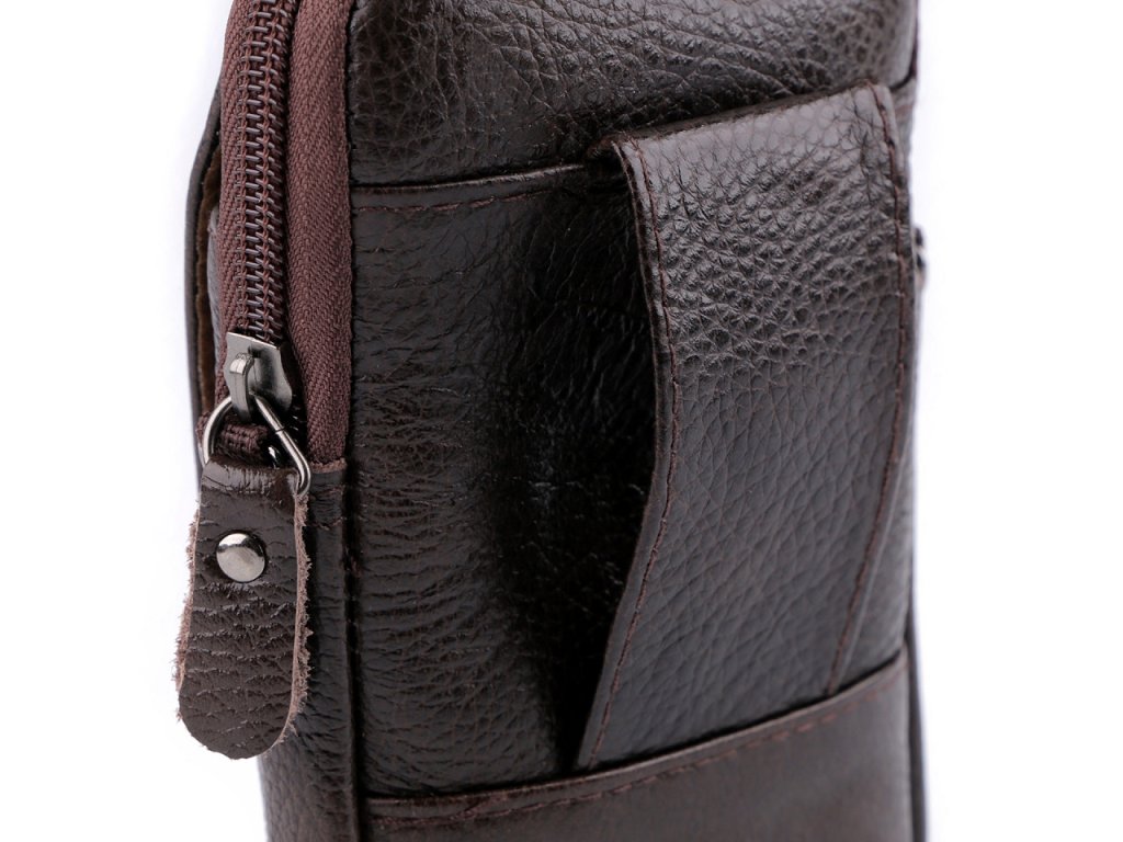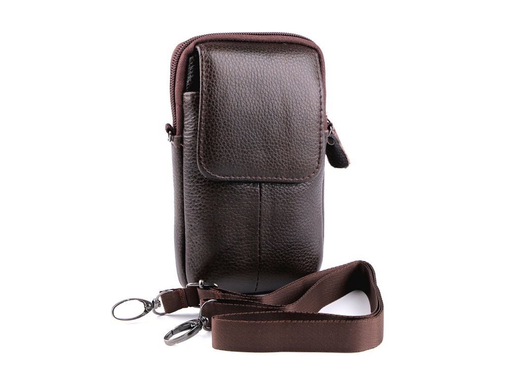 Pouzdro na opasek je vyrobené z eko kůže. Je stylovým doplňkem pro muže. Díky odepínacímu popruhu jej můžete nosit přes rameno, okolo krku nebo křížem jako crossbody tašku. Pouzdro je rozdělené na dvě velké kapsy, které se uzavírají na zip. Na přední straně má pouzdro ještě další dvě kapsy na zip. Na zadní straně je umístěné poutko na vložení opasku s maximální šířkou 6,5 cm. Součástí pouzdra je popruh s nastavitelnou regulací délky. Připíná se pomocí otočných karabin.- Rozměry: 10,5 x 17 x 4 cm