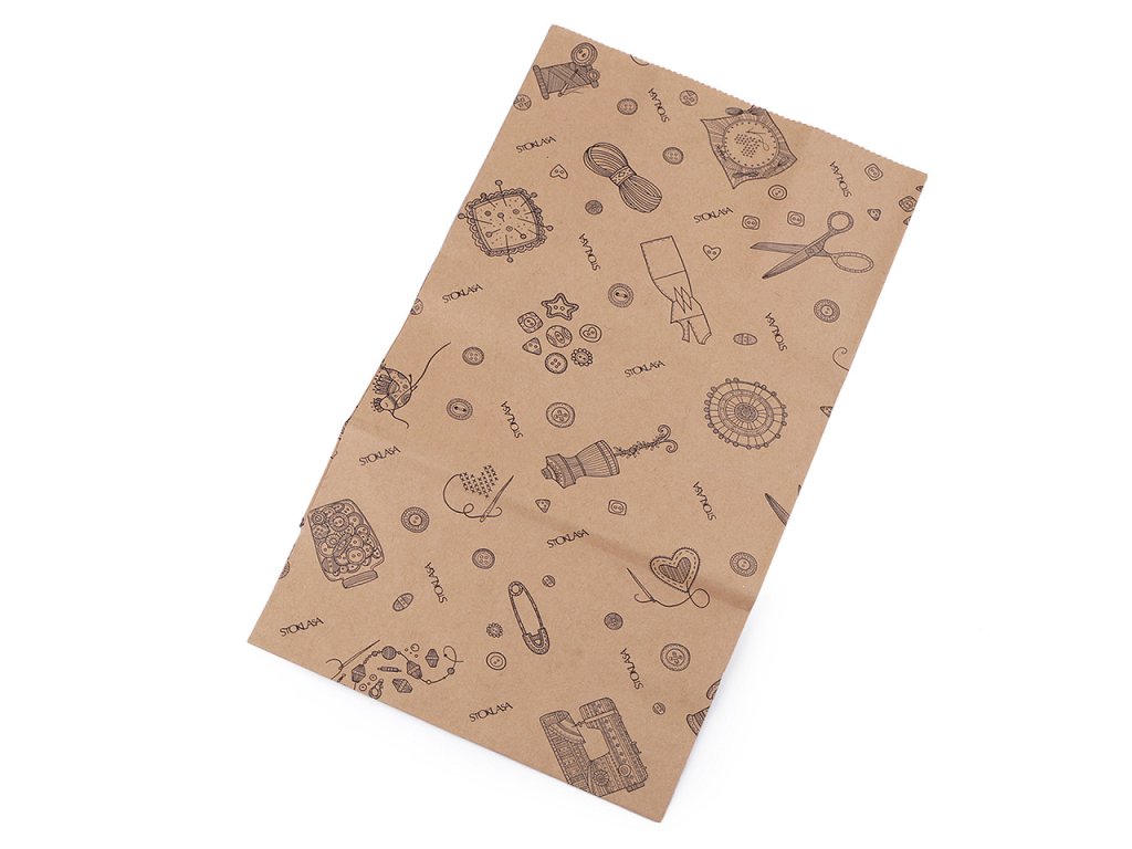 Papírový sáček v přírodní barvě je potištěný obrázky s kresbou krejčovských potřeb. Je kvalitní, vyrobený z pevnějšího papíru. Využijete ho při balení dárků nebo zboží v obchodě. Sáček nemá lepicí lištu. Sáček má dno velké 9 x 15 cm.- Rozměry: 15 x 28 x 9 cm