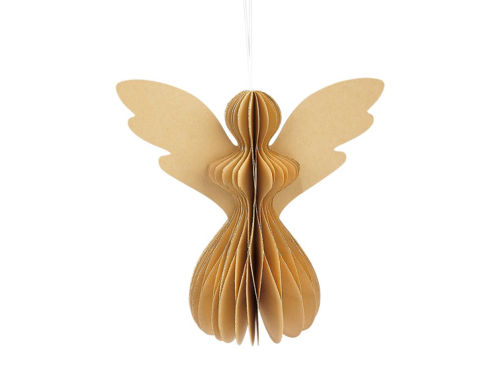 Závěsný anděl je vyrobený z plástvového papíru, který při roztažení vytváří efekt připomínající včelí plástve. Anděl má poutko na zavěšení, ale díky široké základně i výborně stojí. Tvar anděla skvěle drží díky magnetům, které jsou uvnitř. Hrany papíru zdobí třpytivé glitry.- Průměr: 9,5 cm