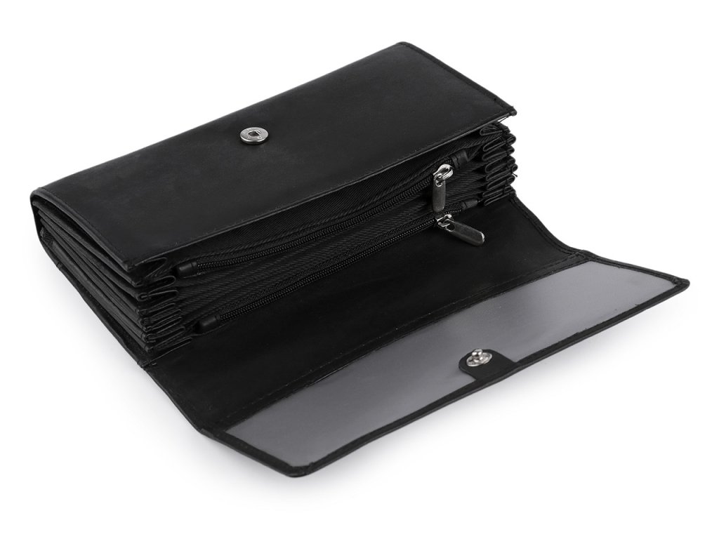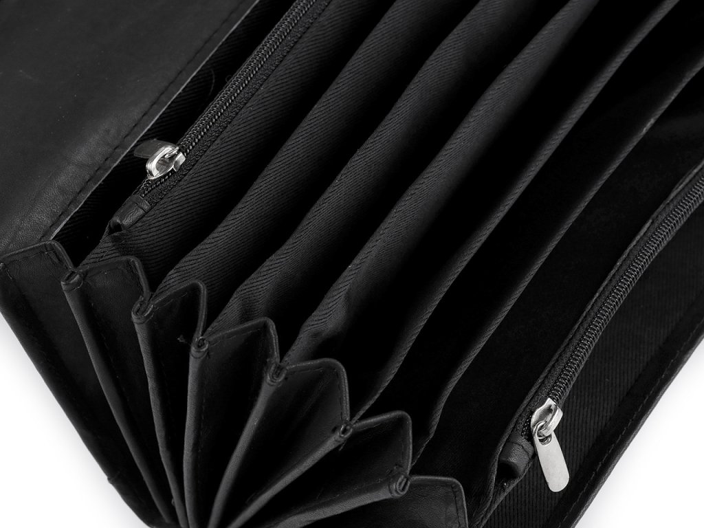 Peněženka z kůže má velice kvalitní provedení. Znáte ji od číšníků z restaurací, kteří jí přezdívají kasírka. Je přehledně uspořádaná, lehká a příjemná na dotek. Má klopu se zapínáním na patent. Povrch kůže je polomatný. Má 8 přihrádek na papírové bankovky a 2 uzavíratelné přihrádky na kovové mince. Na vnitřní straně klopy je průhledné okénko. Na zadní straně je plochá kapsa. Kasírka č.1 je bez druku - nemá zapínání.- Rozměry: 10 x 19 x 4 cm