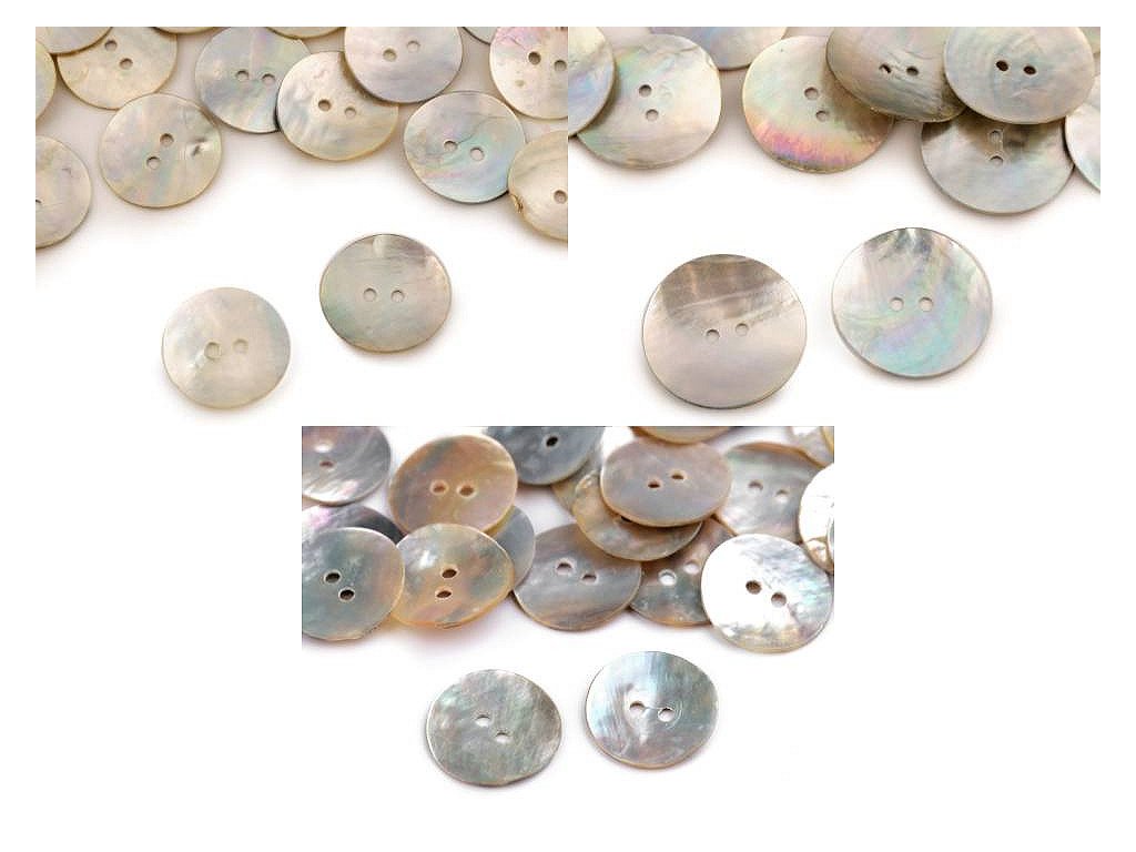 Knoflíky zaujmou na první pohled svým netradičním vzhledem s perletí. Každý knoflík je unikátní díky přírodnímu materiálu, ze kterého jsou vyrobeny. Knoflíky jsou křehké a je nutné s nimi opatrněji zacházet. Hodí se na lehčí materiály, letní šaty, vzdušné halenky a košile. Knoflíky jsou baleny v sáčku. Velikost knoflíků naleznete v této tabulce.- Průměr: č. 1: 20 mm