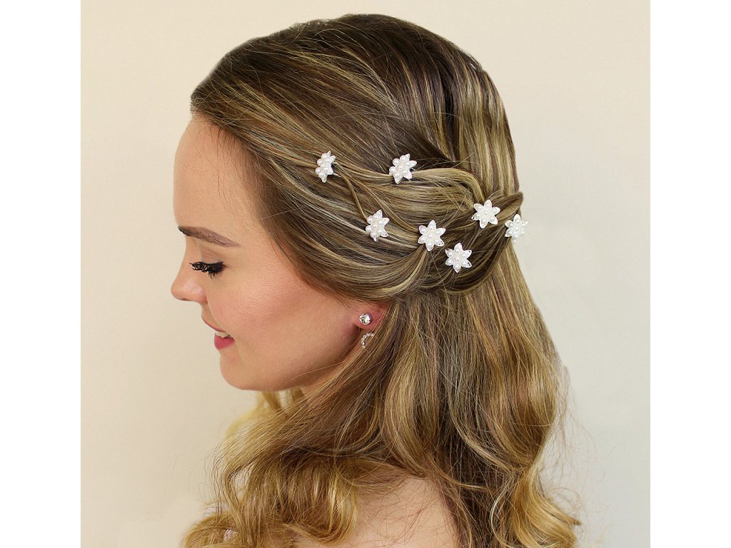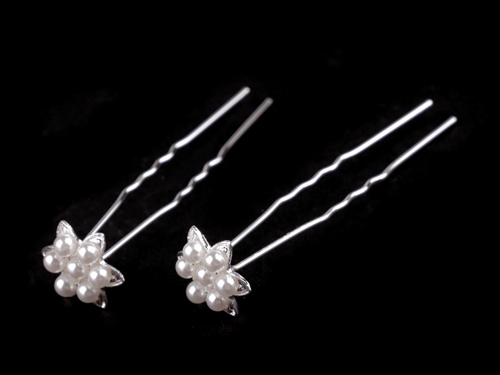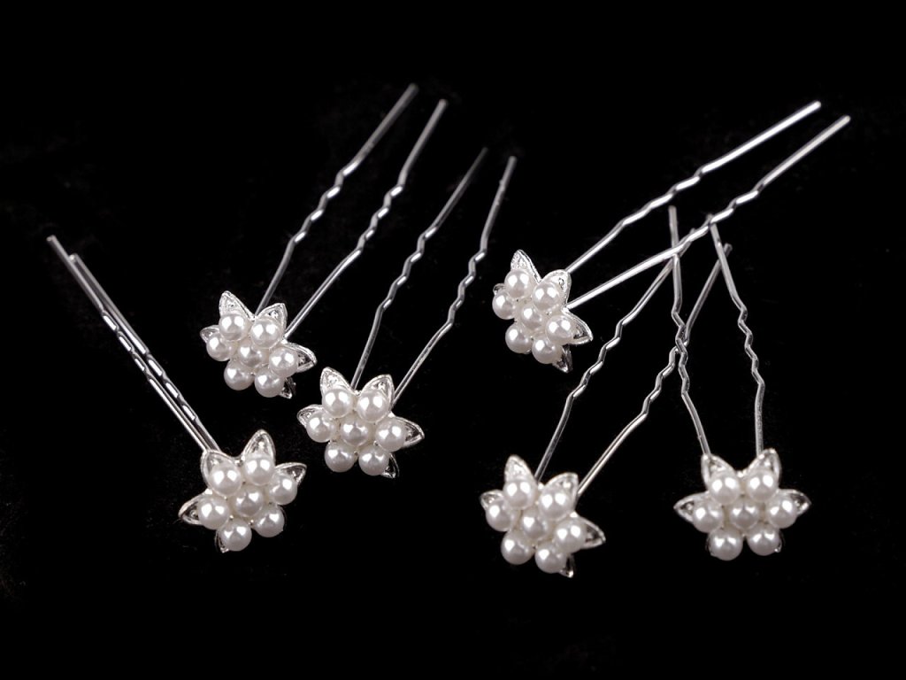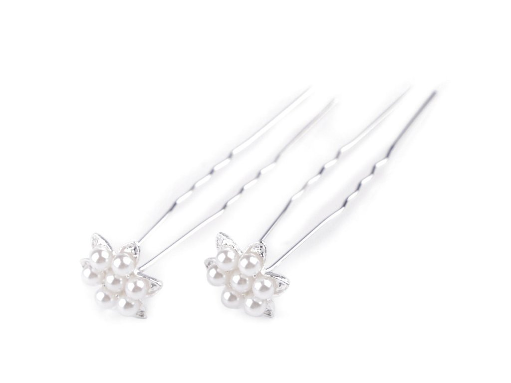 Elegantní perlové vlásenky ve tvaru květu každý účes vyzdvihnou nejméně o dvě třídy výš. Korálky se jemně lesknou, jsou zasazené do kovového lůžka. Vlásenky jsou z kvalitního, pevného kovu, ozdobí nejen společenské účesy, ale i nevěsty v jejich velký den.- Průměr: 17 mm