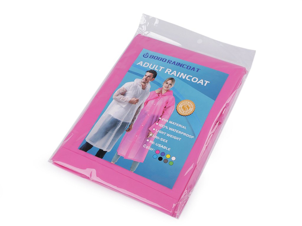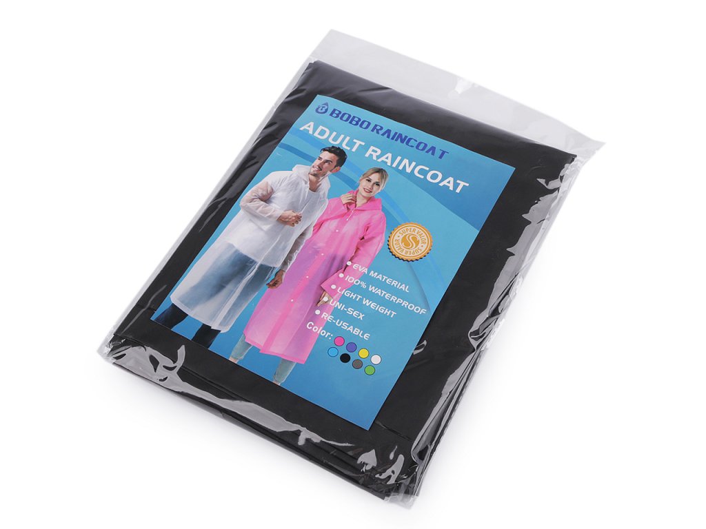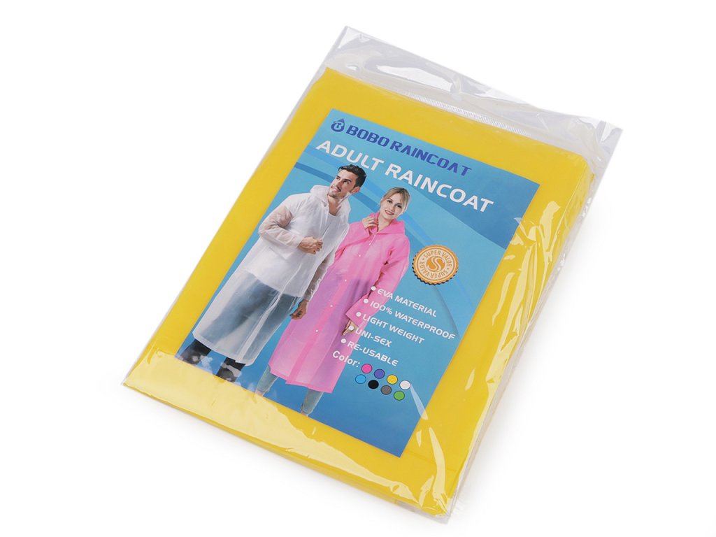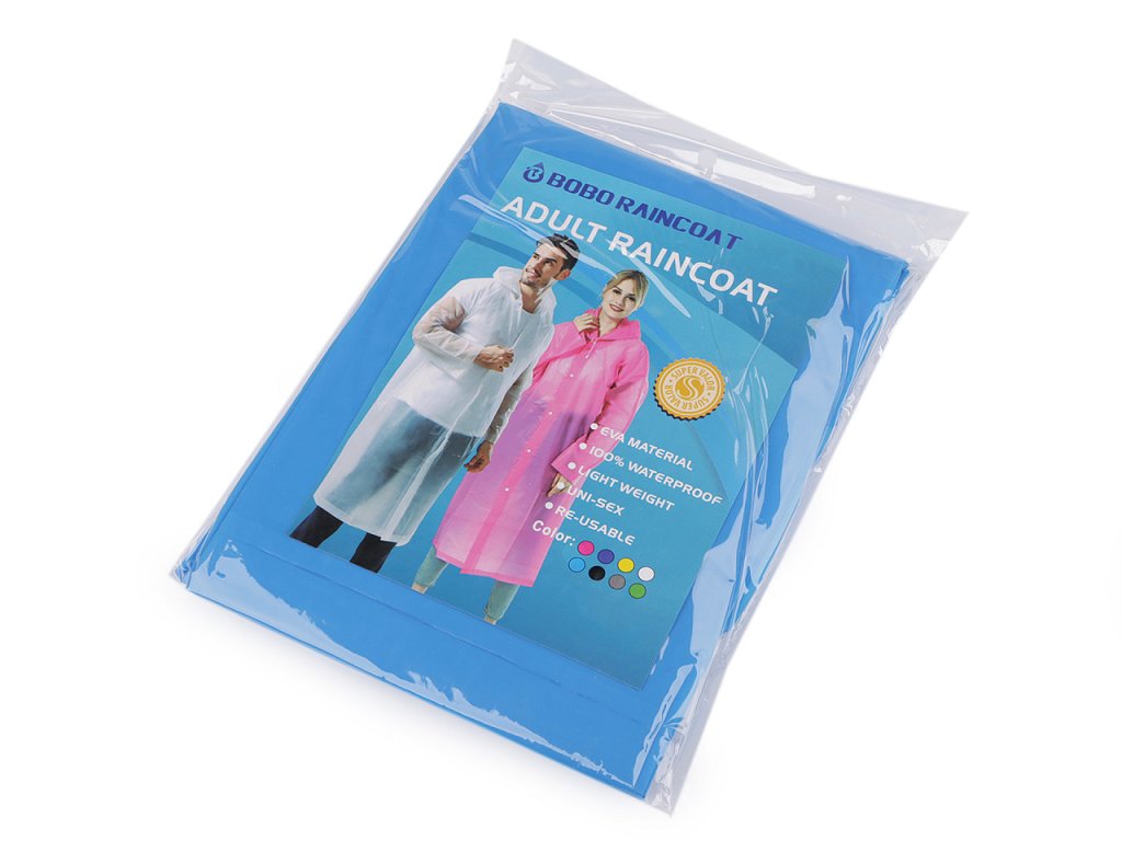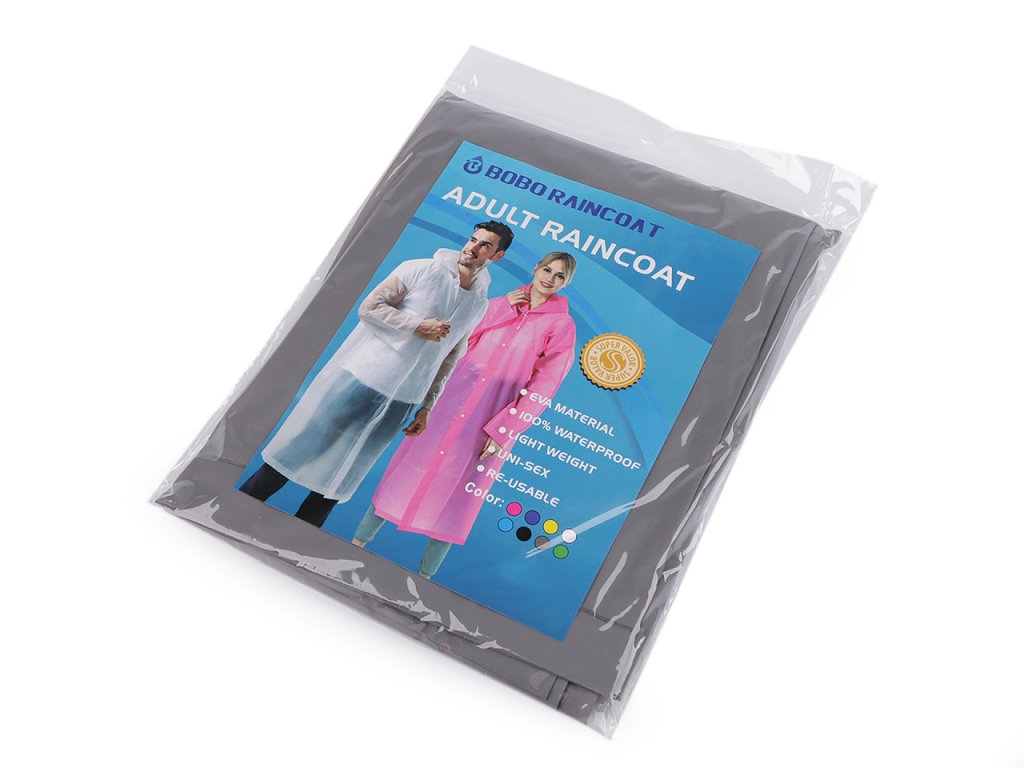 Pláštěnku využijete kdekoli, kde vás přepadne déšť. Je vyrobená z pevného materiálu, kapuce má stahovací šňůrku. Pláštěnka se zapíná na druky, je vložená do plochého sáčku. Pláštěnka měří: zadní délka cca 113 cm, délka rukávu (měřeno od kapuce po konec rukávu) 75 cm, obvod hrudi 130 cm.- Délka: 113 cm