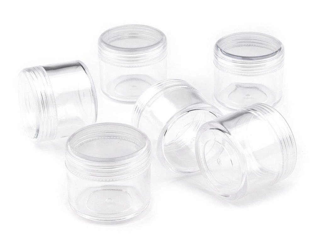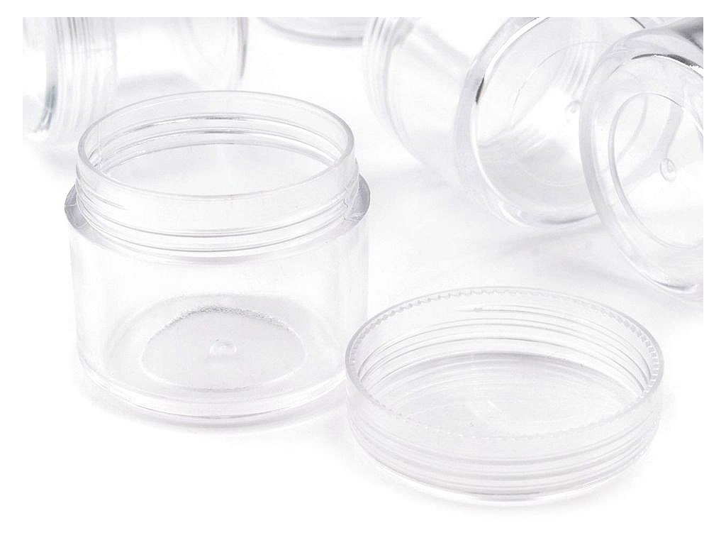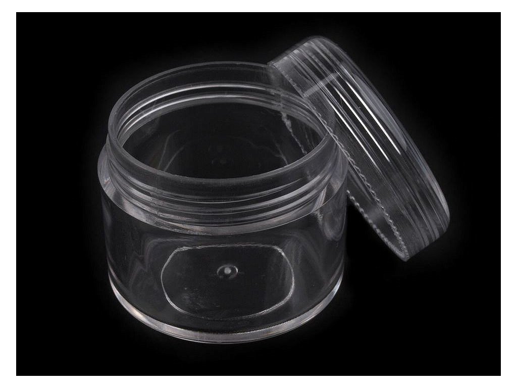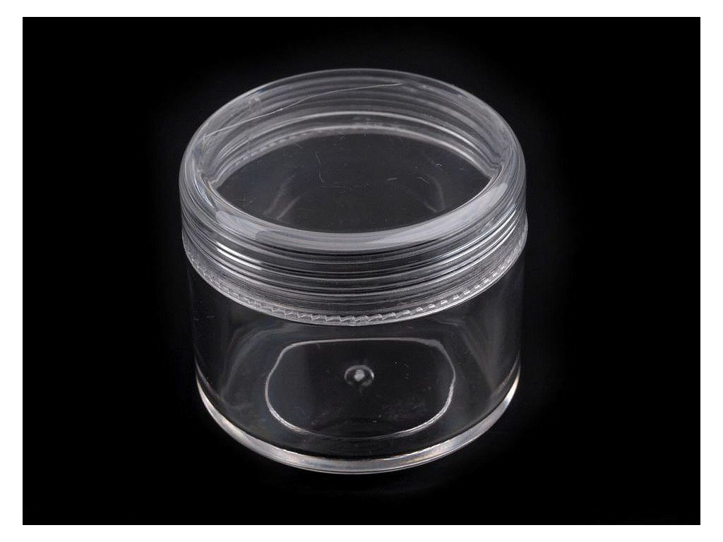 Plastová dóza je vyrobená z průhledného materiálu. Má šroubovací víko, vložené předměty se nerozsypou. Je vhodná pro praktické uložení rokajlu či jiných korálků, hodí se na flitry, glitry a další drobnosti potřebné nejen pro výrobu bižuterie. Dóza má objem po okraj 22 ml, těsně pod závit 15 ml.- Průměr: 38 mm