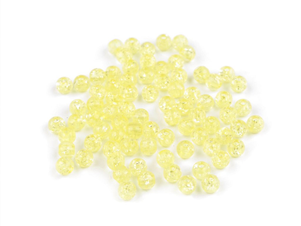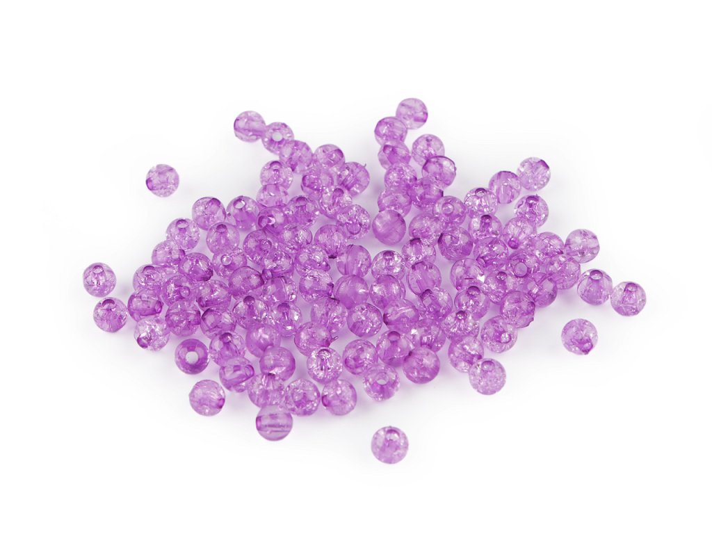 Plastové korálky s efektem kraklé - prasklin lidově nazývaných práskačky, jsou velice variabilní. Mají všechny výhody plastových korálků - jsou lehoučké, mají dostatečně velký průvlek, aby jimi prošly i stužky nebo voskované šňůry. Našim fotografkám se fotografie velmi povedly, ale věřte, že ve skutečnosti jsou korálky ještě zajímavější. Vzhledem ke způsobu zpracování plastů upozorňujeme, že na některých korálcích mohou být na pohled či na dotek patrné zbytky spojů. V balení 30 g je cca 270 ks korálků.- Průměr: 6 mm
