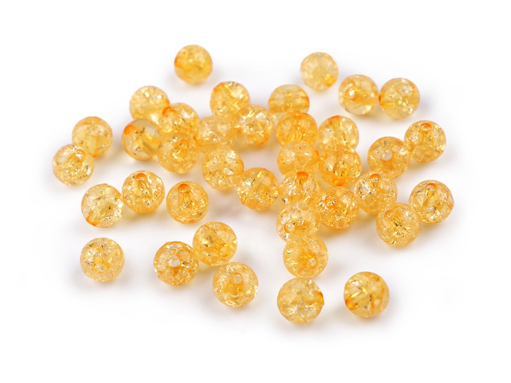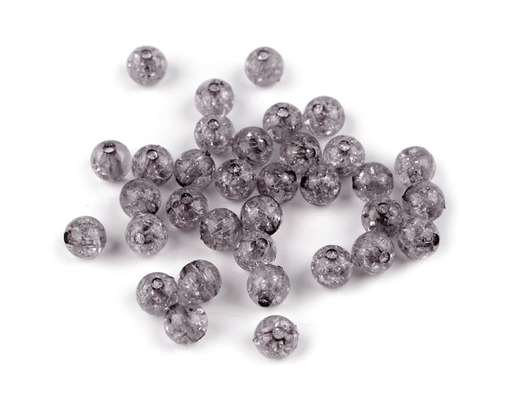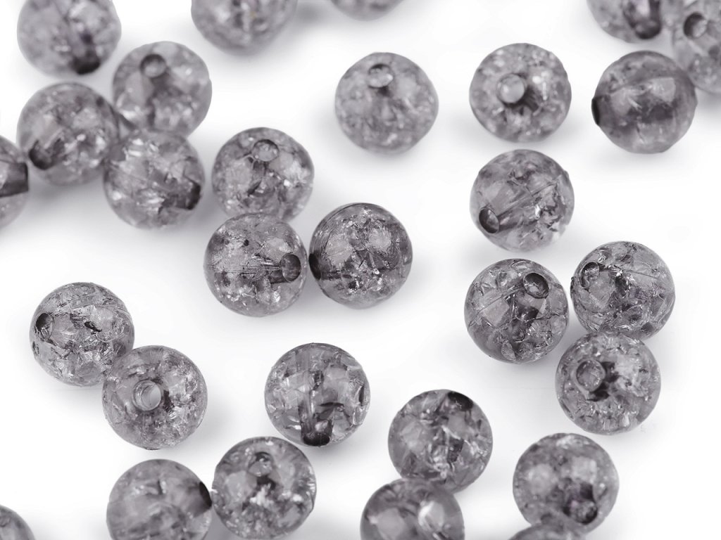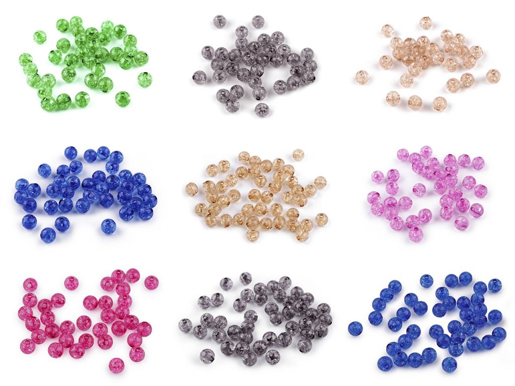 Plastové korálky s efektem kraklé, tedy prasklin, lidově nazývaných práskačky, jsou velice variabilní. Mají všechny výhody plastových korálků - jsou lehoučké, mají dostatečně velký průvlek, aby jimi prošly i stužky nebo voskované šňůry. Našim fotografkám se fotografie velmi povedly, ale věřte, že ve skutečnosti jsou korálky ještě zajímavější. Vzhledem ke způsobu zpracování plastů upozorňujeme, že na některých korálcích mohou být na pohled či na dotek patrné zbytky spojů. V balení 30 g je cca 106-110 ks korálků.- Průměr: 8 mm