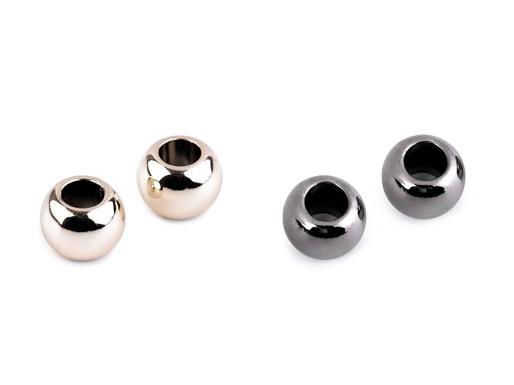 Plastové korálky s velkým průvlekem s vysokým leskem věrně imitují opravdový kov. Oceníte jejich nízkou hmotnost. Využijete je do krátkých i dlouhých náhrdelníků nebo náramků. Jako návlekový materiál jsou vhodné šperkové šňůrky nebo hadí řetízky. Korálky můžete navlékat na větší množství tenkých šňůrek, které se mezi sebou různě uzlují a svazují a tvoří tak zajímavý celek. Korálky využijete nejen k výrobě bižuterie, ale i ke zdobení oděvů, tašek nebo plavek. Jsou oblíbené i na techniku macrame nebo na výrobu lapačů snů. Korálky jsou vhodné pouze pro šetrné ruční praní.- Průměr: 15 mm