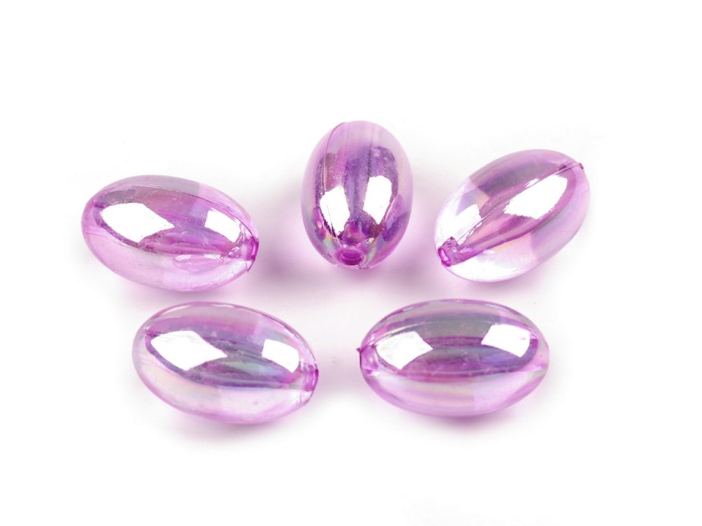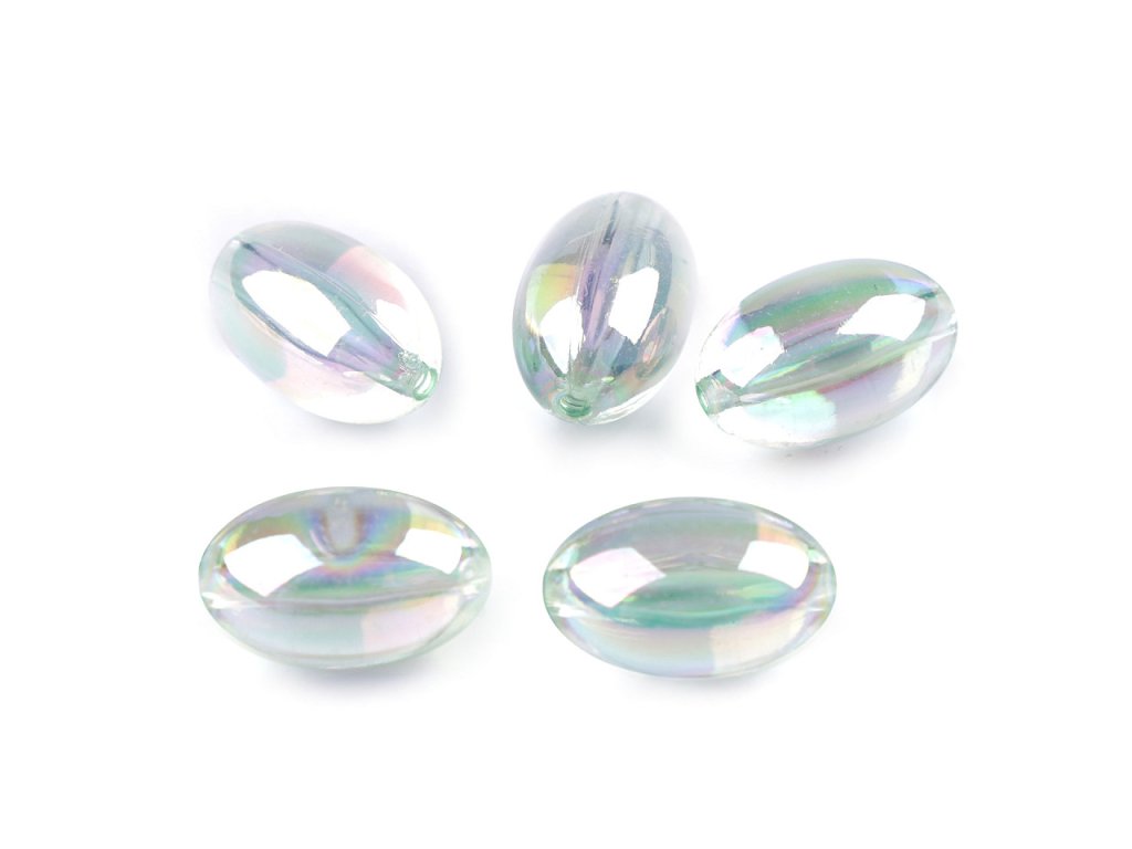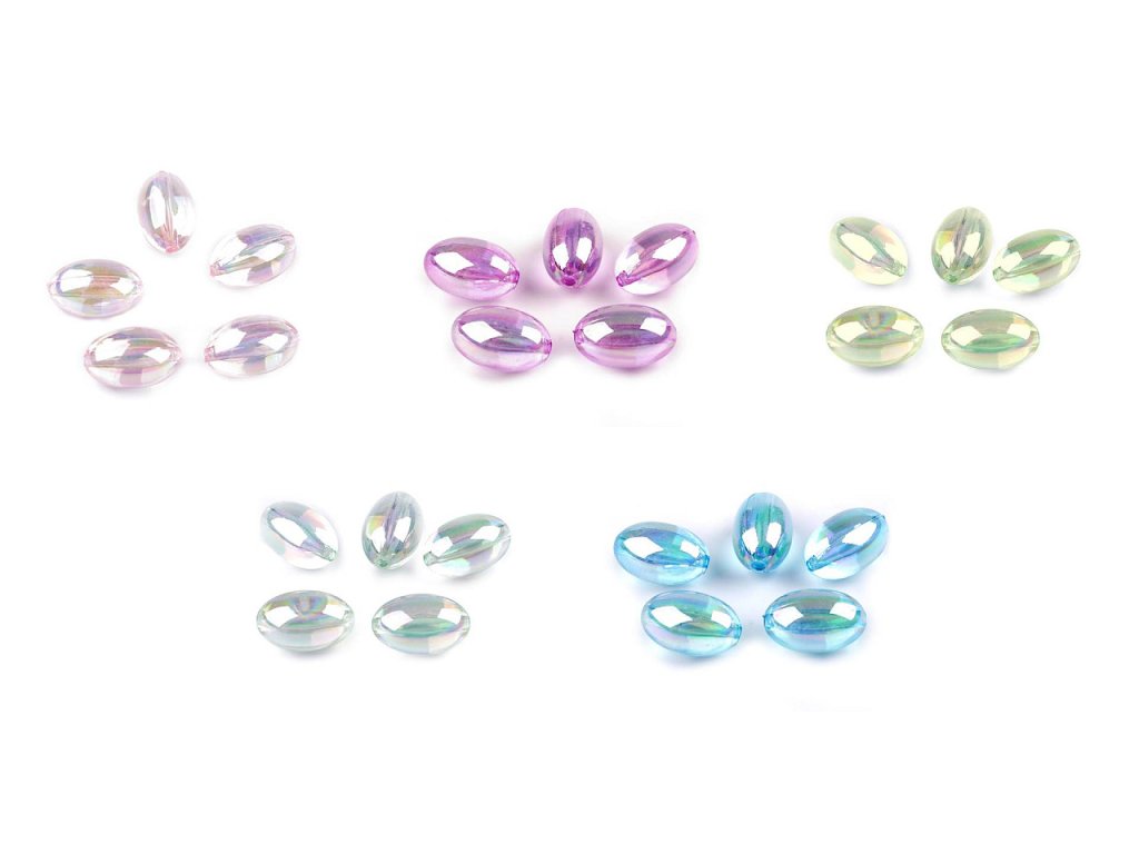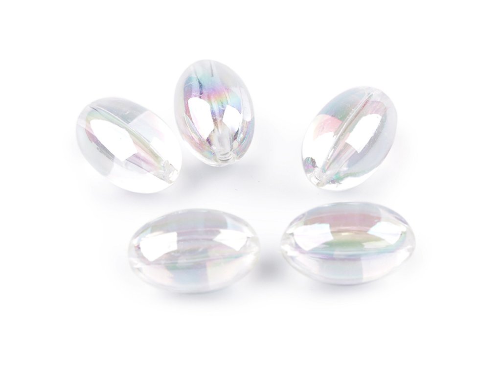 Plastové korálky ve tvaru olivy nadchnou děti i dospělé. Jsou doslova magické, protože jsou transparentní, ale povrch má vysoký lesk s AB efektem. Korálky můžete použít na výrobu náhrdelníků, přívěsků ke klíčům, hodí se i k ozdobení tašek apod. Jejich velikou výhodou je nízká hmotnost. Balení 10 g obsahuje 5 ks korálků.- Průměr: 13 mm