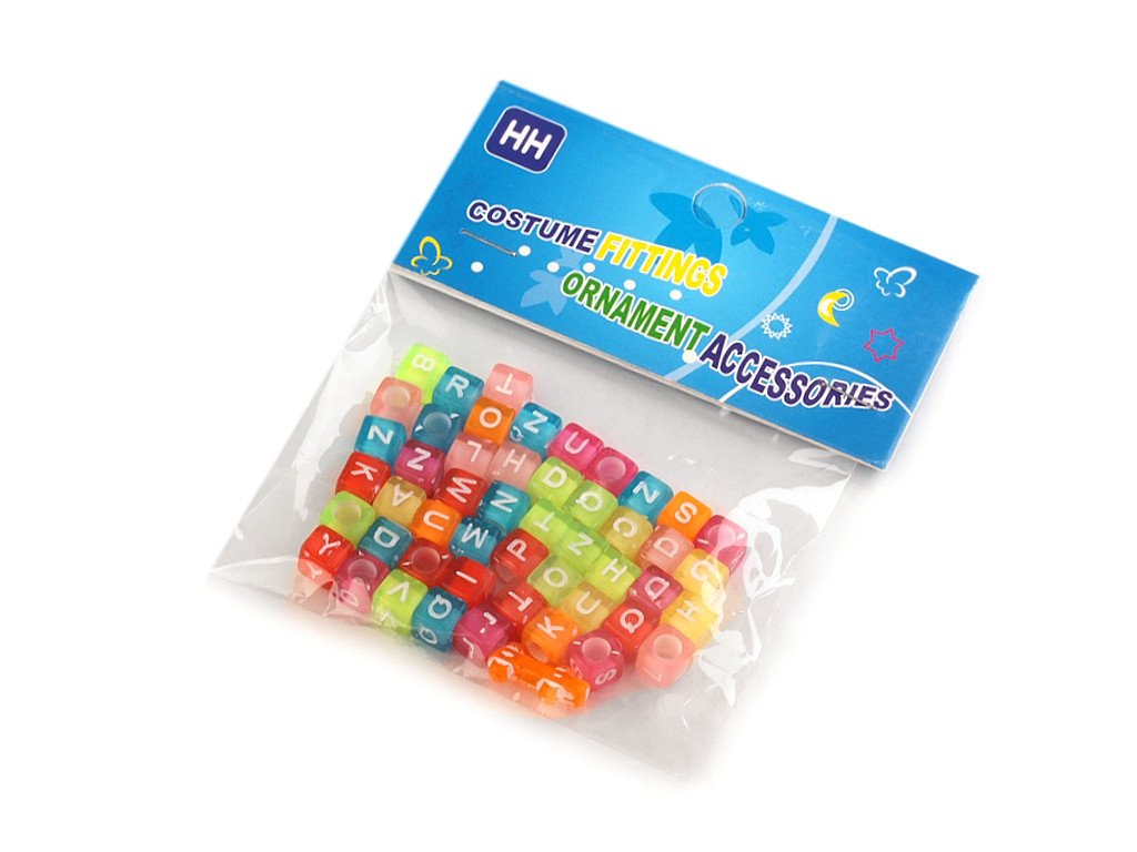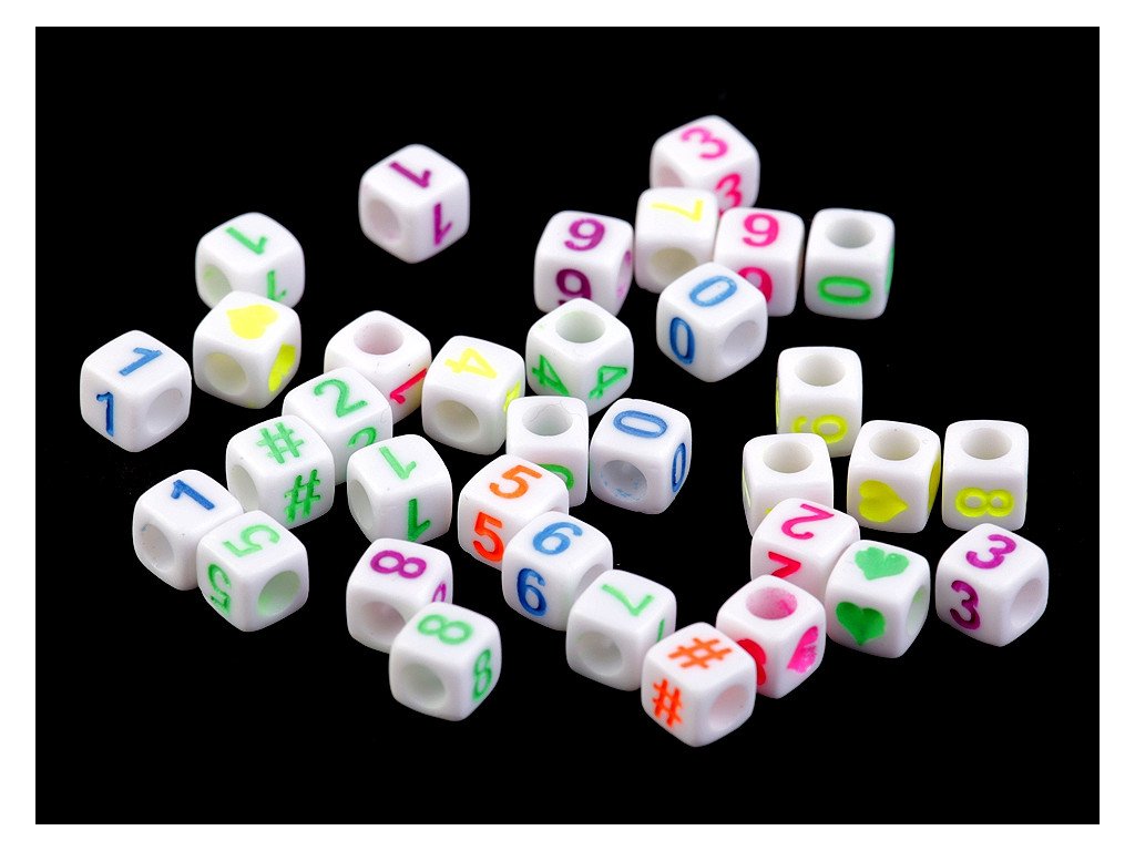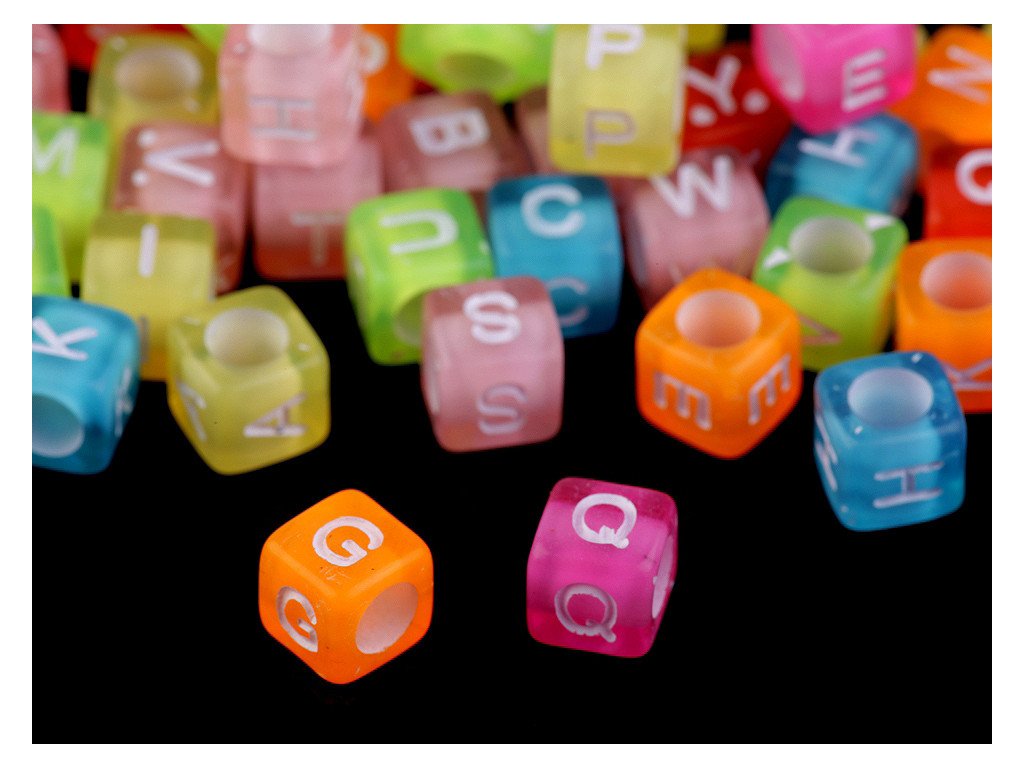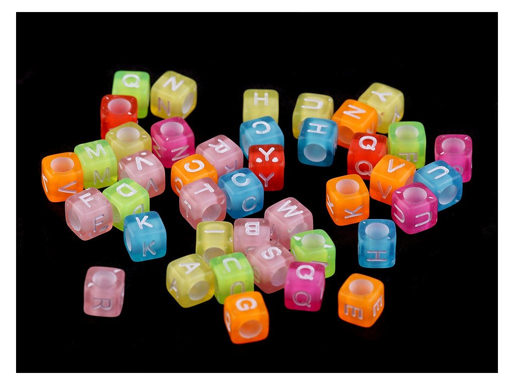 Korálky s písmenky nebo čísly potěší především školní děti. Mohou vyrábět populární náramky přátelství s nápisy. Korálky mají tvar kostky. Písmena jsou na všech ploškách, chybí pouze na stranách s průvleky. Horizontálně umístěný průvlek umožňuje skládat z písmen slova, jména apod. Díky velkému průvleku se korálky hodí i na gumičkové náramky. Jako návlekový materiál můžete použít pruženky a silony, různé šňůrky, gumičky apod. V sáčku je mix různých písmen nebo čísel. Sáček nemusí obsahovat všechny kombinace písmen z abecedy nebo čísel, jednotlivá balení se od sebe mohou lišit. Písmenka jsou z anglické abecedy, tudíž bez diakritických znamének.- Rozměry: 6 x 6 x 6 mm