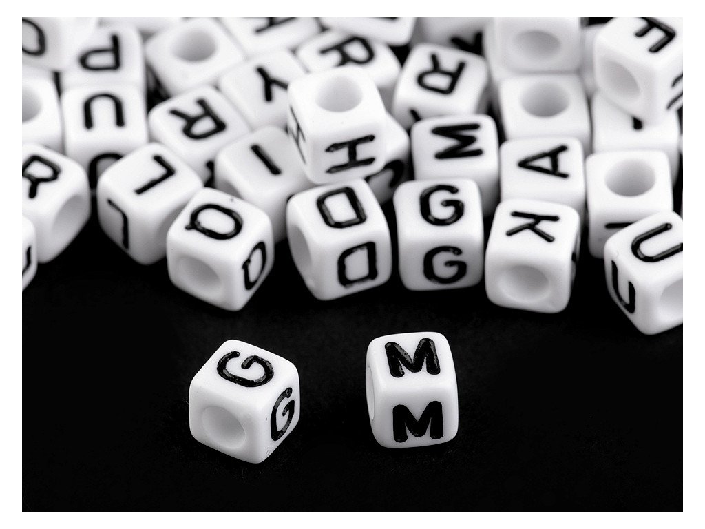 Korálky s písmenky potěší především školní děti. Mohou vyrábět populární náramky přátelství se jménem obdarovaného. Korálky mají tvar kostky. Písmena jsou na všech ploškách, chybí pouze na stranách s průvleky. Horizontálně umístěný průvlek umožňuje skládat z písmen slova, jména apod. Díky velkému průvleku se korálky hodí i na gumičkové náramky. Tělo korálku má bílou barvu, písmena jsou černá. Jako návlekový materiál můžete použít pruženky a silony, různé šňůrky, gumičky apod. V sáčku je mix různých písmen. Sáček nemusí obsahovat všechny kombinace písmen z abecedy, jednotlivá balení se od sebe mohou lišit. Písmenka jsou z anglické abecedy, tudíž bez diakritických znamének. V jednom sáčku je 47 - 50 ks korálků.- Rozměry: 6 x 6 x 6 mm