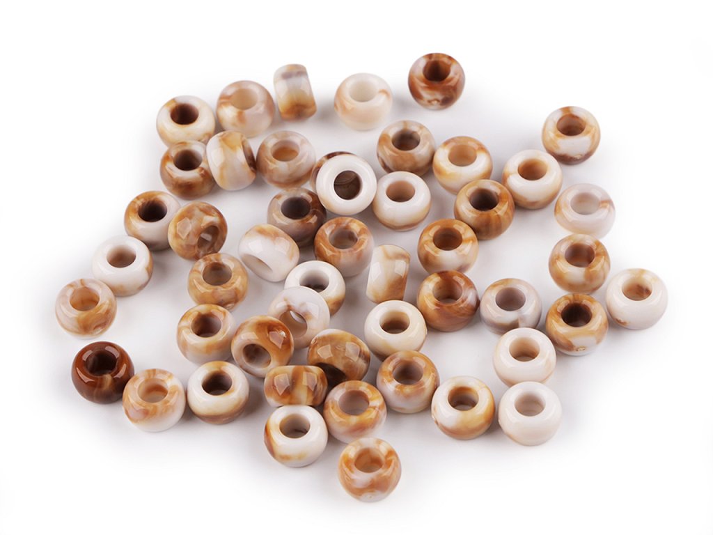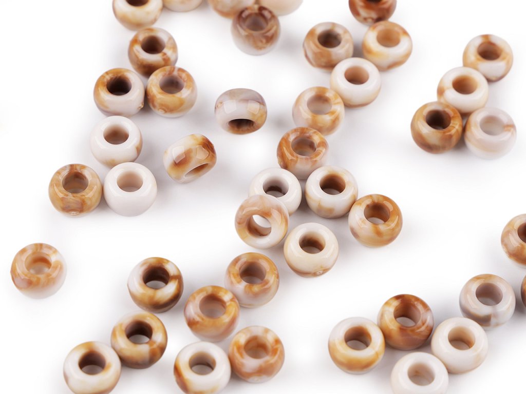 Žíhané plastové korálky s velkým zaobleným průvlekem jsou zajímavé svým probarvením imitujícím mramor, kdy každý korálek je jiný. Jemně se lesknou, jsou velice příjemné na pohled, působí přírodním dojmem. Jsou velice kvalitní, všude hladké, nemají žádné otřepení nebo viditelné švy. Využijete je na výrobu bižuterie i různých dekorací, např. lapačů snů. Skvěle se kombinují s dalšími korálky různých tvarů a materiálů. Korálky využijete i ke zdobení oděvů, tašek nebo plavek. Korálky jsou vhodné pouze pro šetrné ruční praní. Balení 20 g obsahuje cca 73 ks korálků.- Průměr: 9 mm