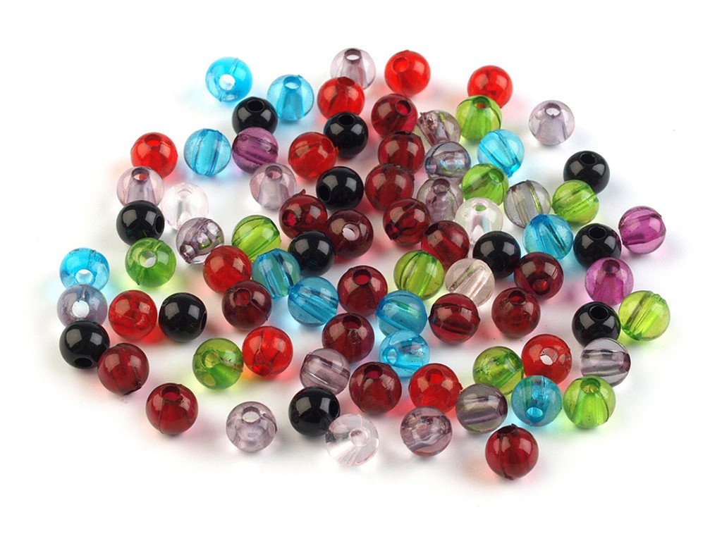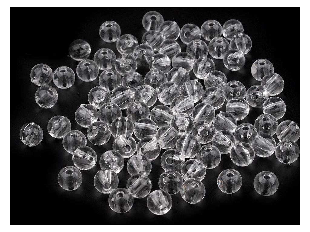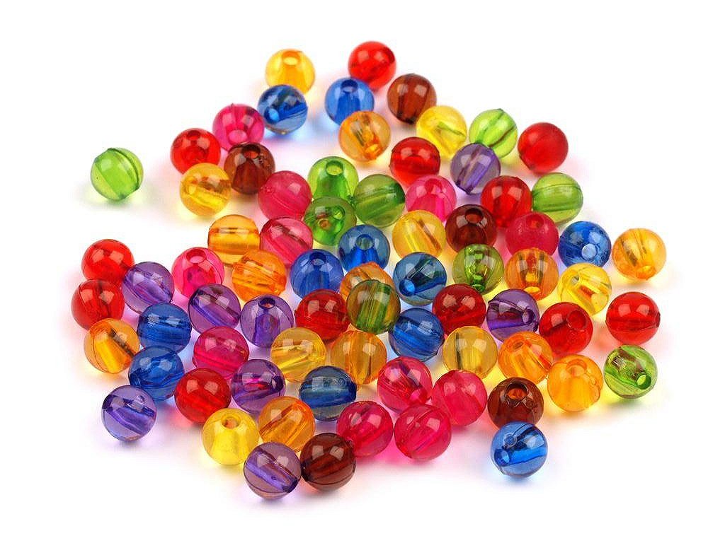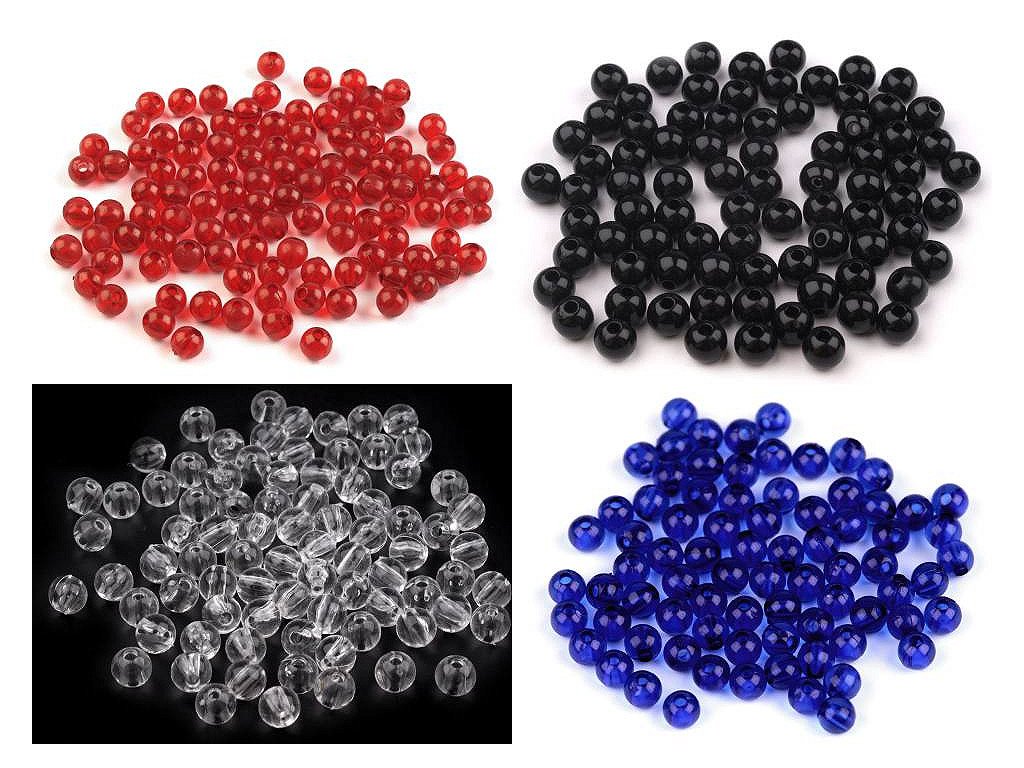 Transparentní plastové korálky se líbí dětem i dospělým. Dají se použít na výrobu náhrdelníků, náramků, přívěsků ke klíčům apod. V balení 20 g je cca 150 ks korálků. Korálky černé barvy jsou neprůhledné. Časem mohou korálky pouštět barvu.- Průměr: 6 mm