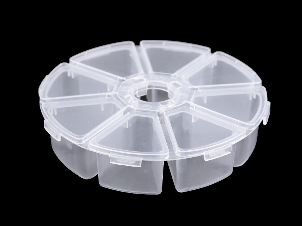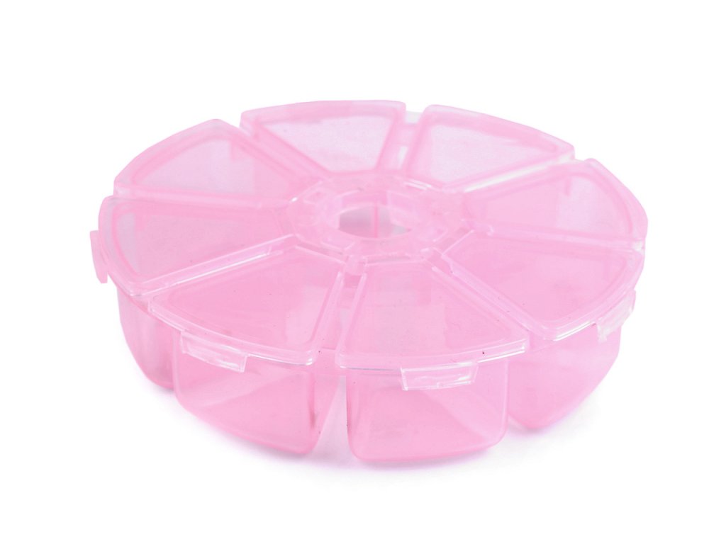 Zásobník ve tvaru osmihranu má 8 dílků o rozměrech 8 x 28 x 30 mm, každý se dá otevírat zvlášť. Zásobník se dá použít na uskladnění korálků, flitrů či bižuterních komponentů. Je vhodný i na uskladnění bižuterie. U té doporučujeme zásobník přechovávat na tmavém místě, jelikož bižuterie na světle časem koroduje.- Průměr: 10 cm