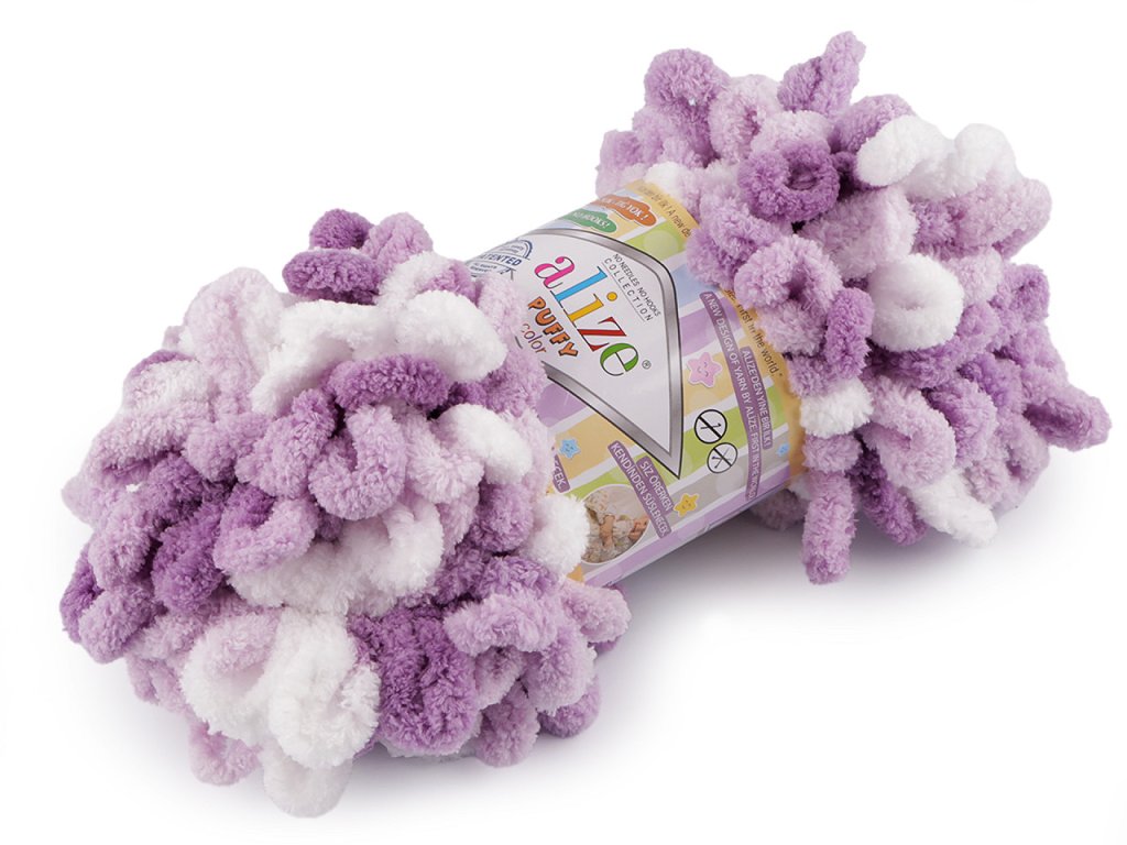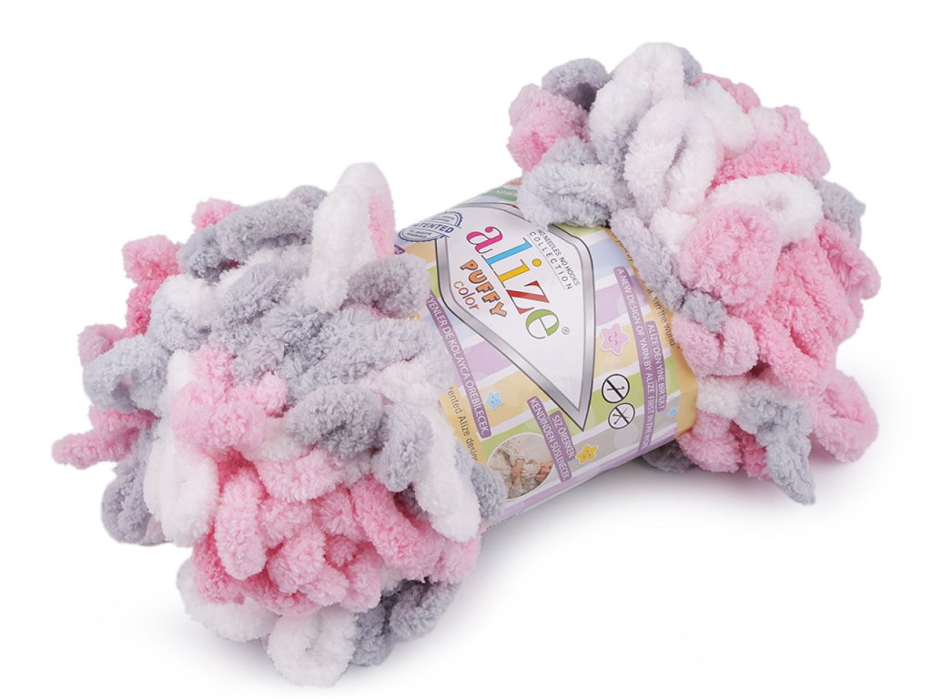 Příze Alize Puffy color je měkká, chlupatá žinylková příze s velkými očky. Tvoří nádherné barevné přechody. Na pletení nepotřebujete jehlice ani háček - proplétají se jednotlivá očka. Je vhodná na pletení dek, šálů apod. Přibližná spotřeba na deku o rozměrech 100 x 100 cm je cca 5 klubíček.- Hmotnost: 100 g