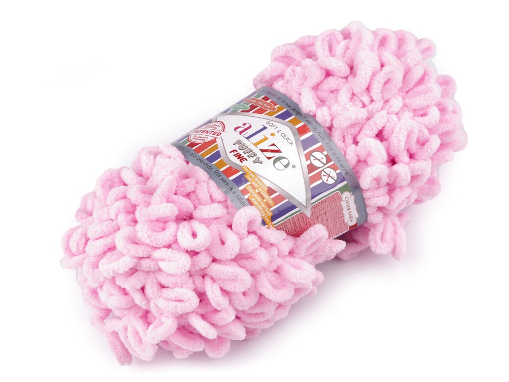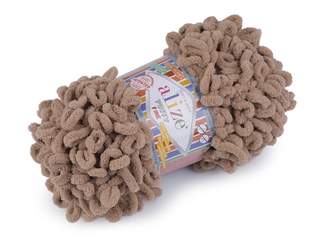 Příze Alize Puffy Fine je měkká, chlupatá žinylková příze s velkými očky. Na pletení nepotřebujete jehlice ani háček - proplétají se jednotlivá očka. Je vhodná na pletení dek, šálů apod. Přibližná spotřeba na deku o rozměrech 100 x 100 cm jsou 3 klubíčka. Přibližná spotřeba na šálu je 1 klubíčko. Vzorek na fotografii byl upleten rukama z 1 klubíčka.- Hmotnost: 100 g