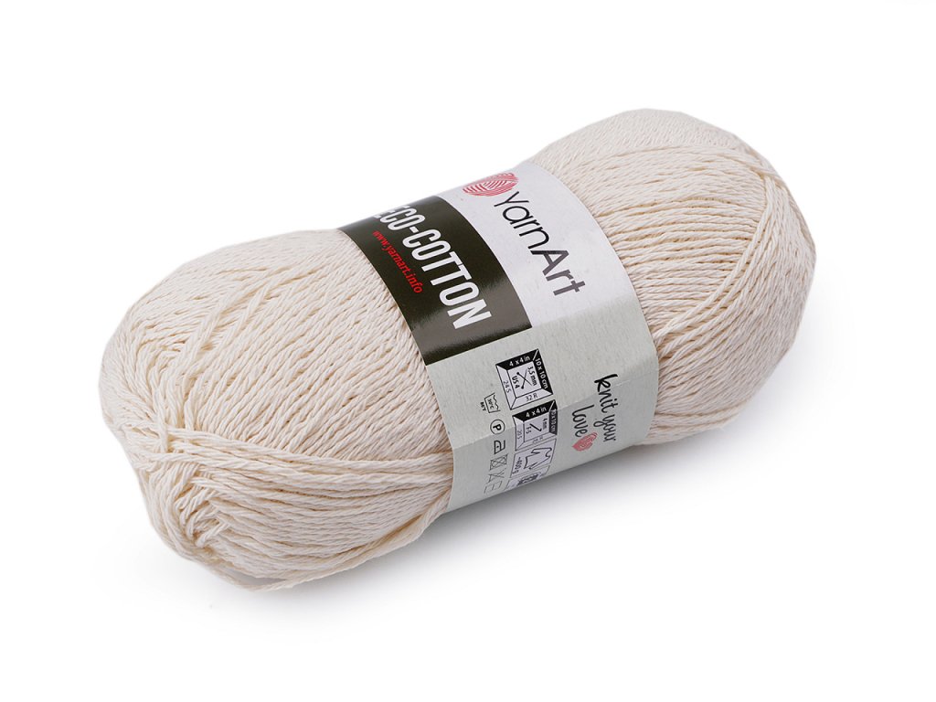 Bavlněná pletací příze Eco-cotton připomíná provázek. Je vhodná na pletení či háčkování halenek, vestiček, dekorací, sedáků, polštářů, tašek apod. Zpracování vláken této příze dodává úpletům přirozený přírodní vzhled, stejně působí i na dotek. Velikost jehlic: 3,5 Velikost háčku: 4- Hmotnost: 100 g