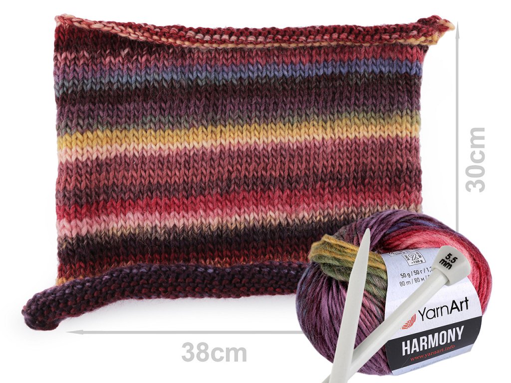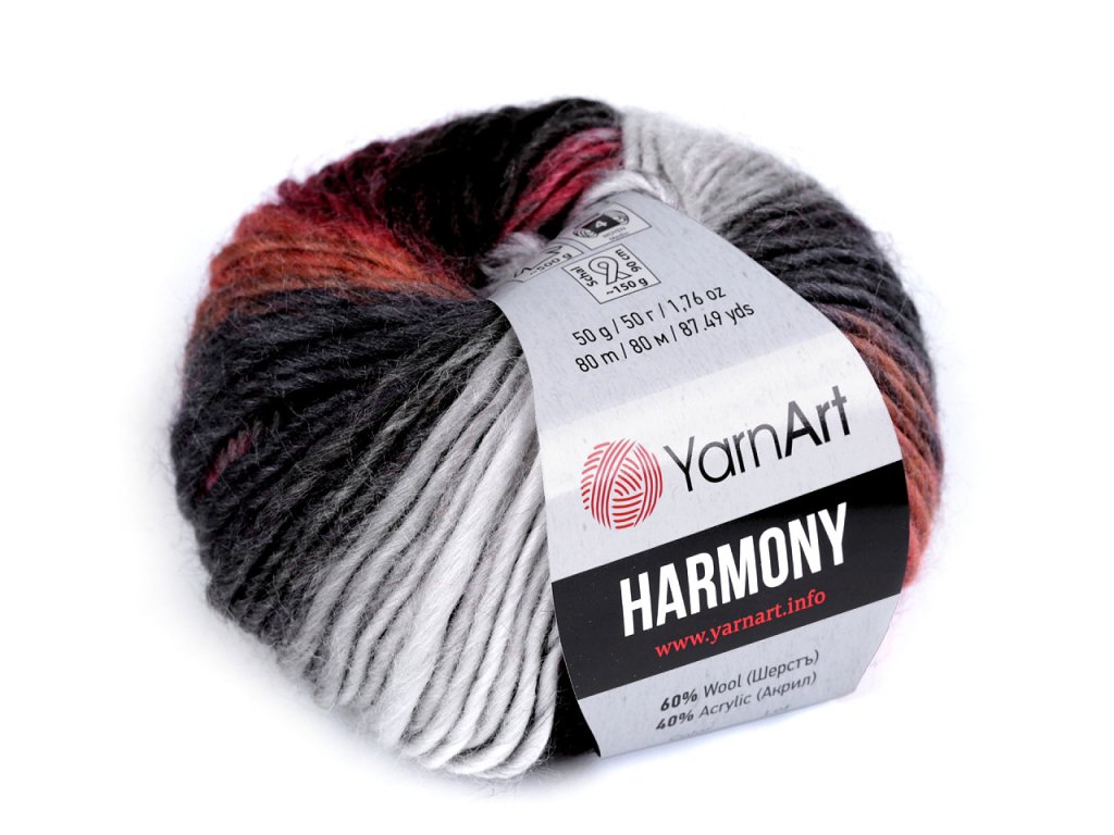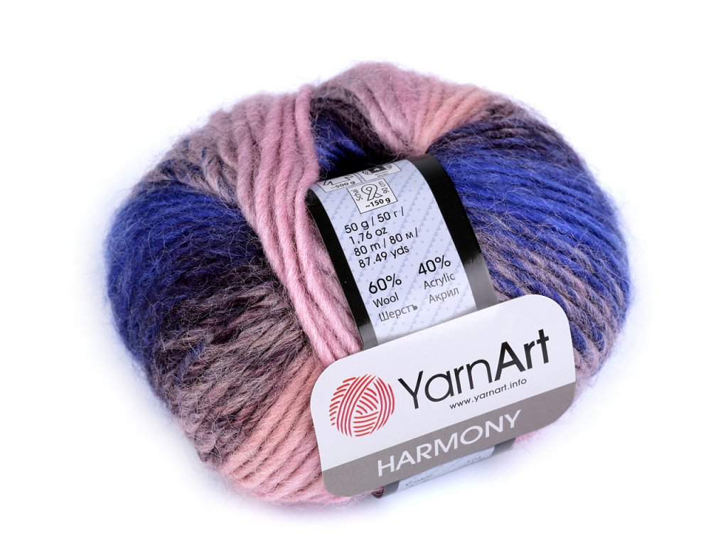 Pletací příze Harmony, s vyšším podílem vlny, má efektní melírované zabarvení. Je vhodná na pletení i háčkování čepic, čelenek, šálů, svetříků apod. Velikost jehlic: 5,5 Velikost háčku: 6,5 Vzorek na fotografii (38 x 30 cm) byl upleten z 1 klubíčka, jehlicemi č. 5,5.- Hmotnost: 50 g