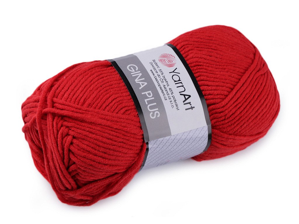 Pletací příze Gina Plus je díky vysokému podílu bavlny velmi příjemná na dotek. Použití: Přízi využijete k háčkování či pletení svetrů, čepic, vest, tašek, síťovek apod. Oblíbíte si ji také na výrobu zvířátek a různých figurek. Velikost jehlic: 5 Velikost háčku: 5 Údaje o spotřebě příze najdete na poslední fotografii. Vzorek na fotografii (40 x 40 cm) byl uháčkován z 1 klubíčka, háčkem č. 5.- Hmotnost: 100 g
