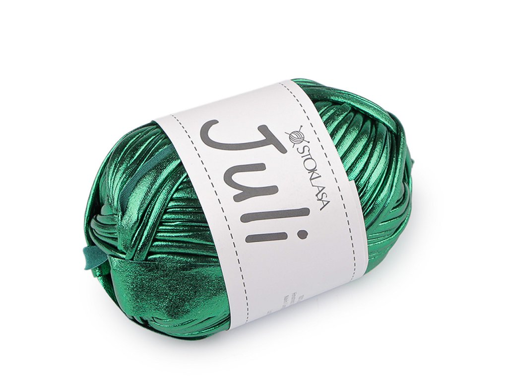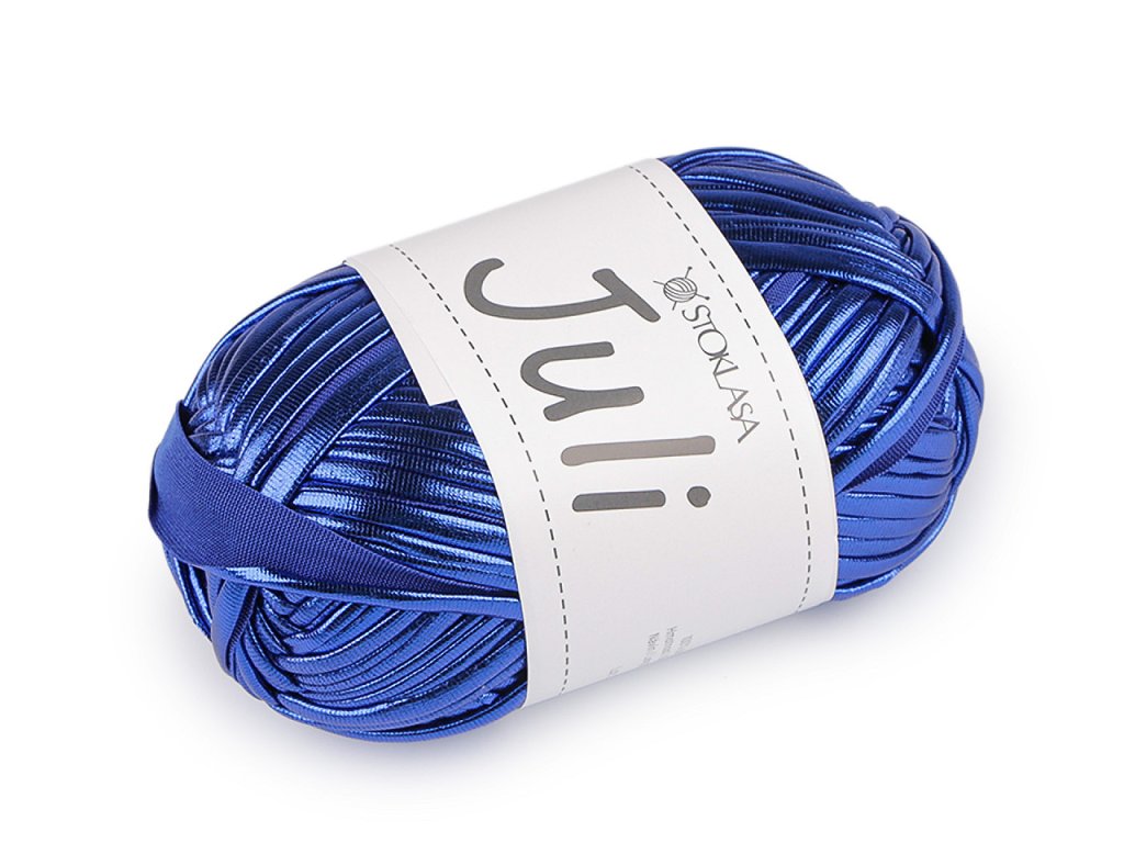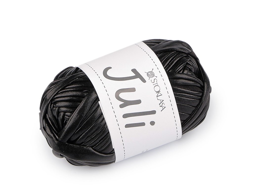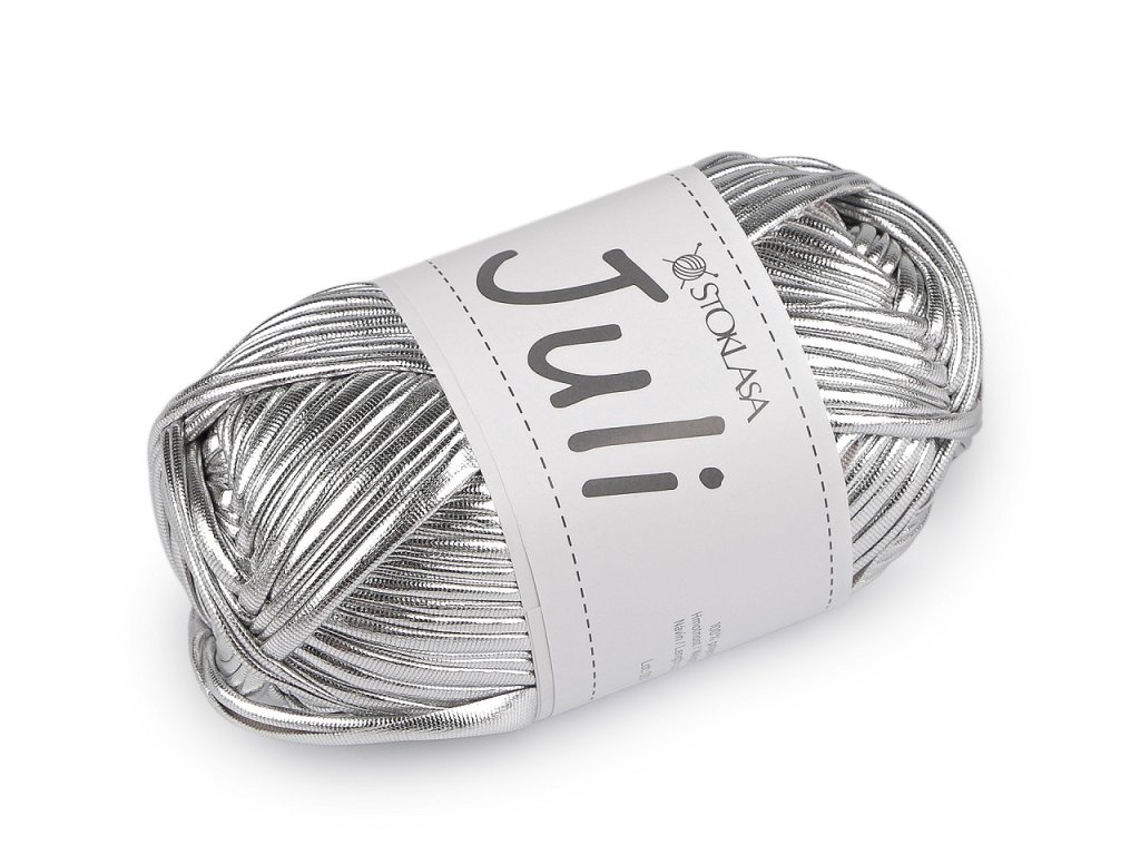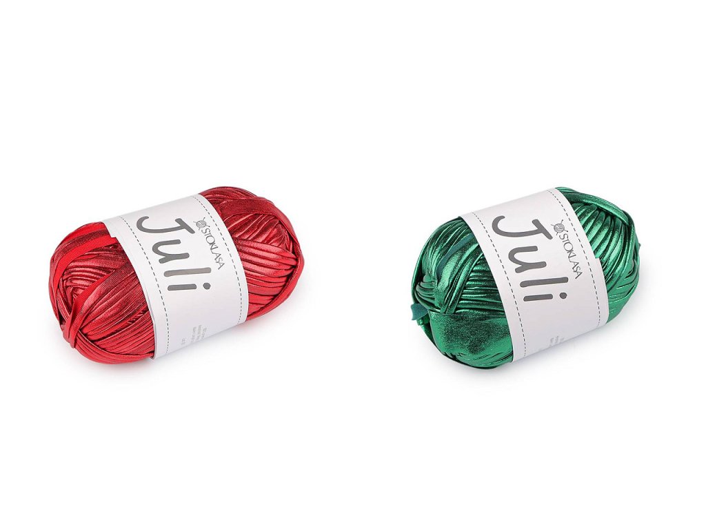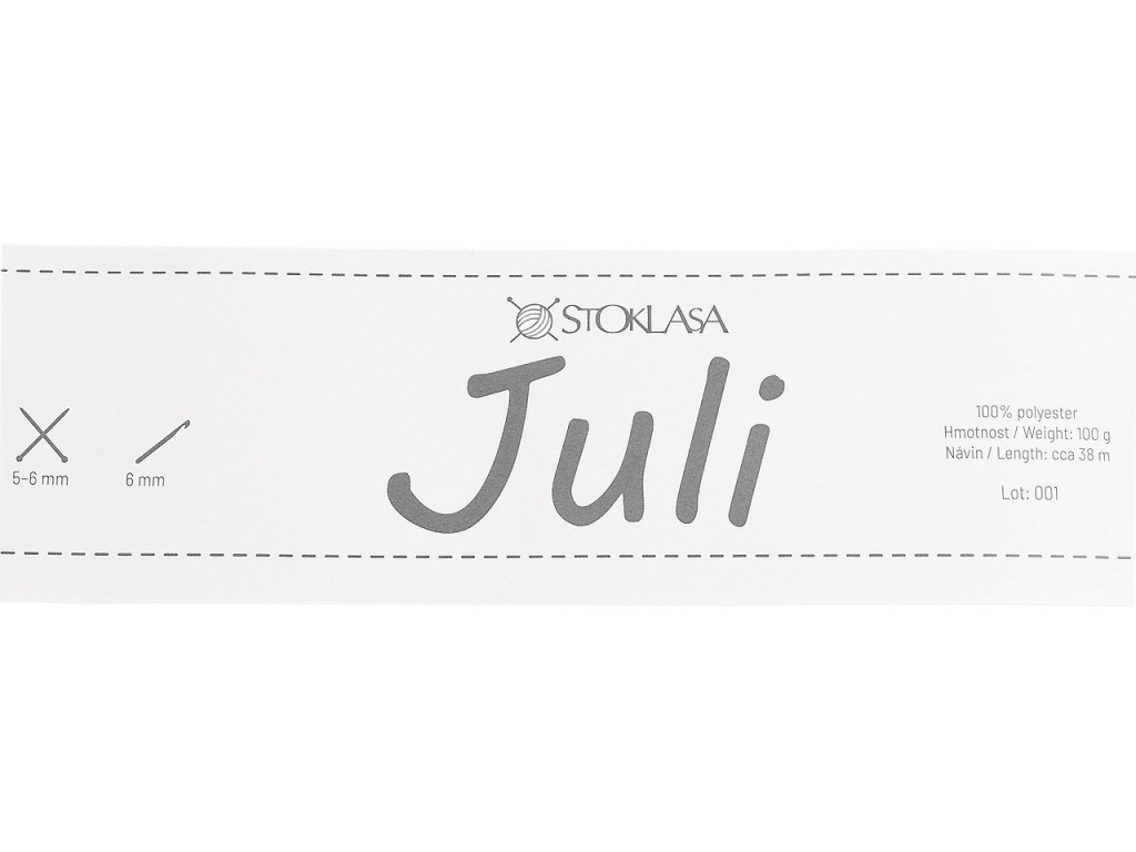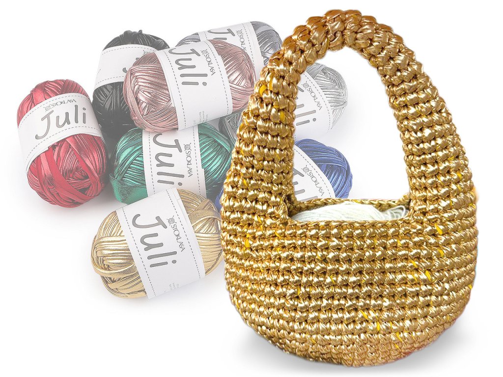 Příze Juli má efektní metalický lesk, který dodá exkluzivitu každému výrobku. Příze je elastická a měkká a dobře se s ní pracuje. Můžete z ní uplést či uháčkovat kabelky, batůžky, košíčky, peněženky, ale dají se z ní tvořit i zajímavé šperky. Šíře příze v nataženém stavu je cca 17 - 20 mm. Velikost jehlic: 5 - 6 Velikost háčku: 6- Design Stoklasa