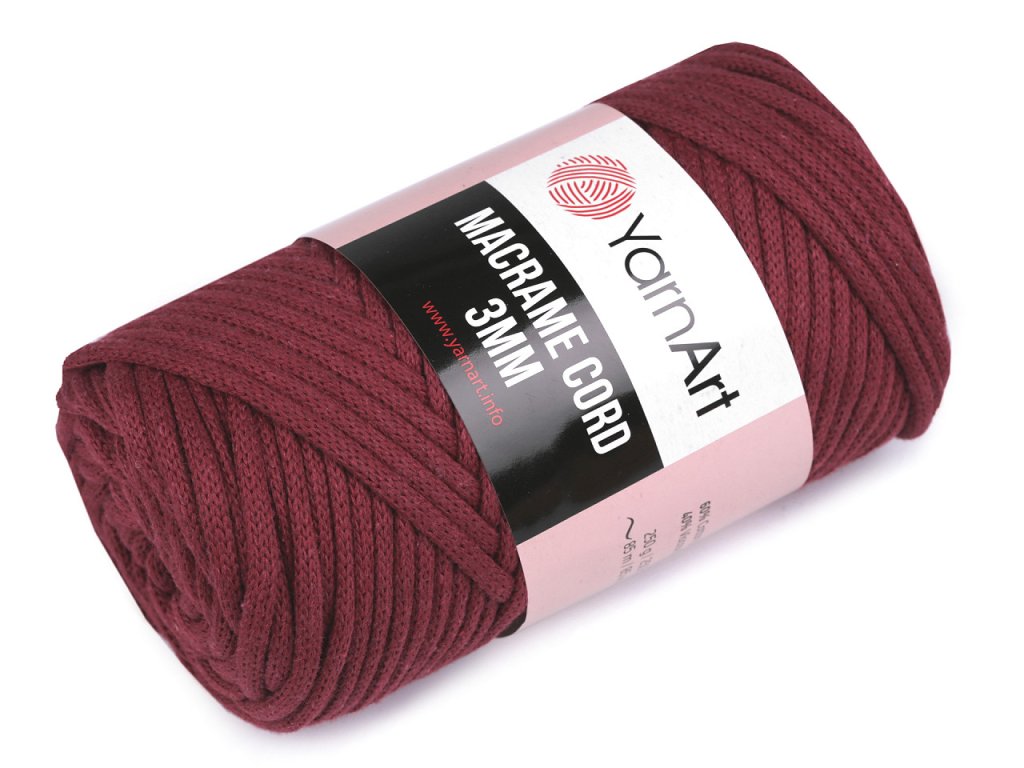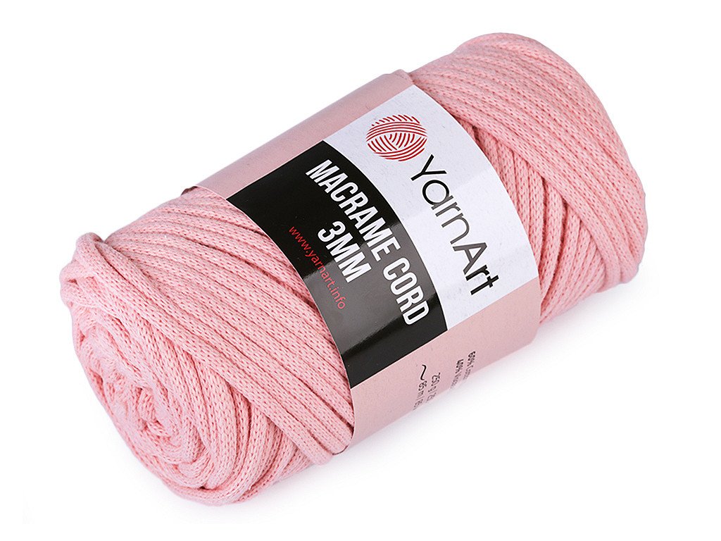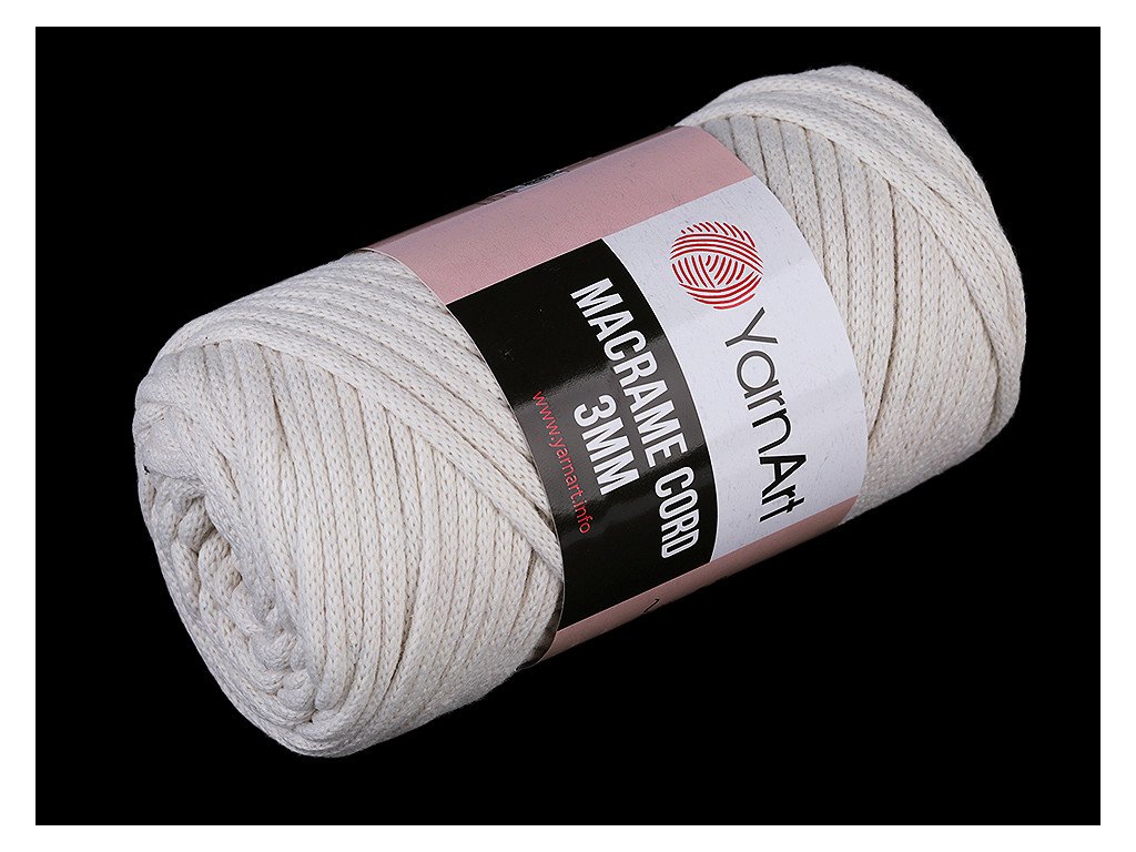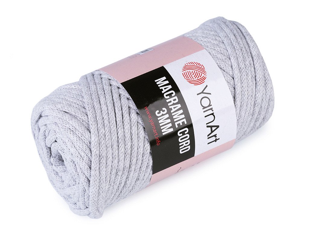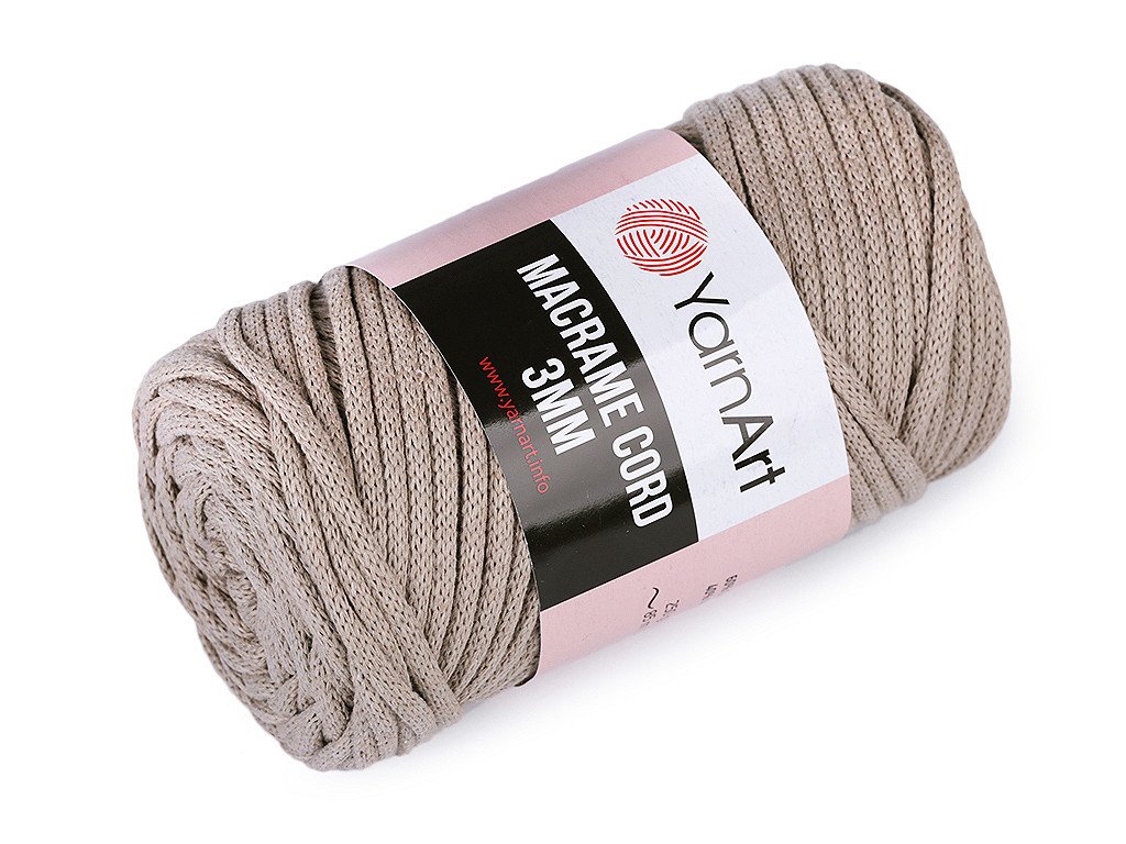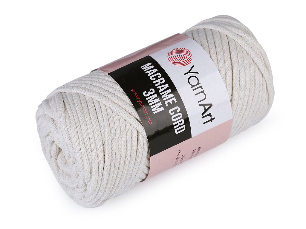 Příze Macrame Cord připomíná provázek. Využijete ji na pletení nebo háčkování pufů, košíků, koberečků i tašek. Velikost jehlic: 7 Velikost háčku: 8 Vzorek na fotografii (29 x 26 cm) byl uháčkován z 1 klubíčka, háčkem č. 8.- Průměr: 3 mm
