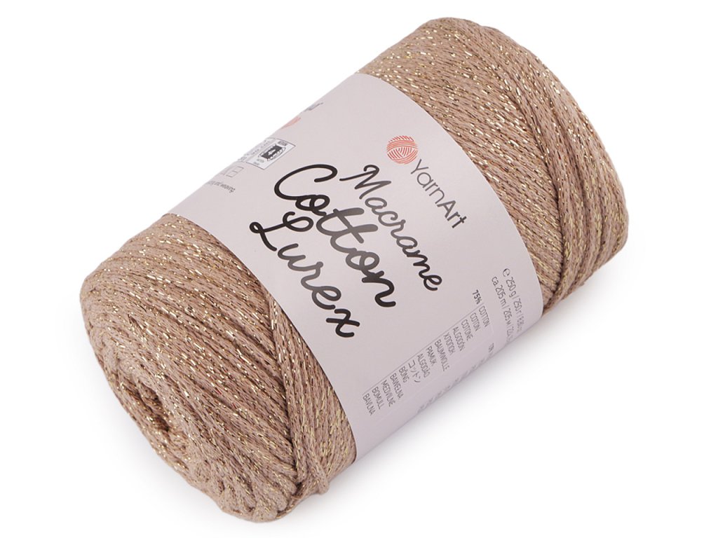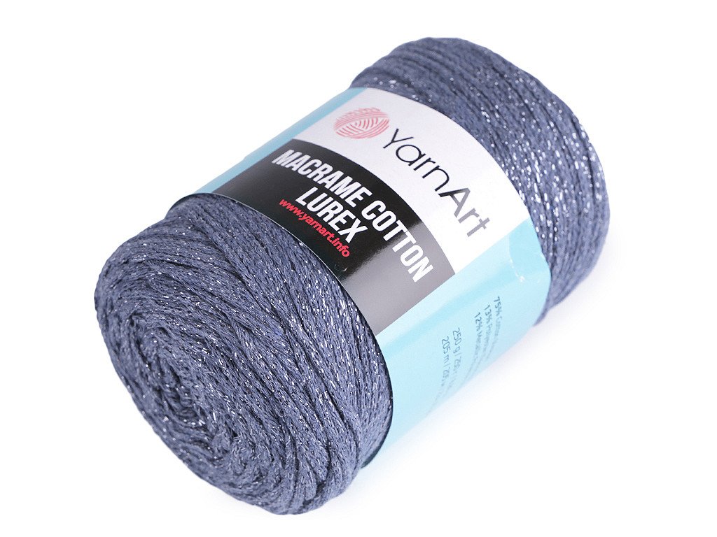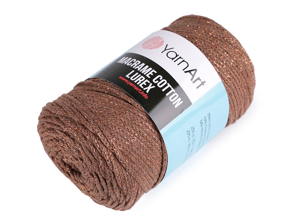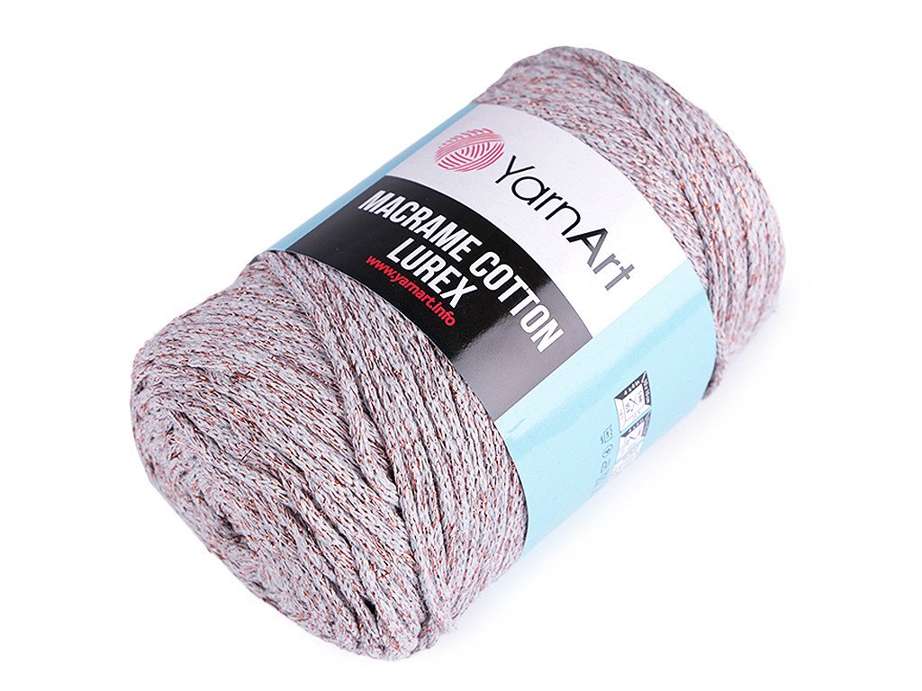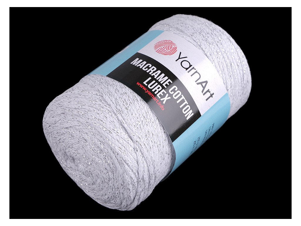 Příze Macrame Cotton připomíná provázek a je doplněna třpytivým lurexem. Využijete ji na pletení nebo háčkování pufů, košíků, koberečků i tašek. Velikost jehlic: 5 Velikost háčku: 5- Průměr: cca 2 mm