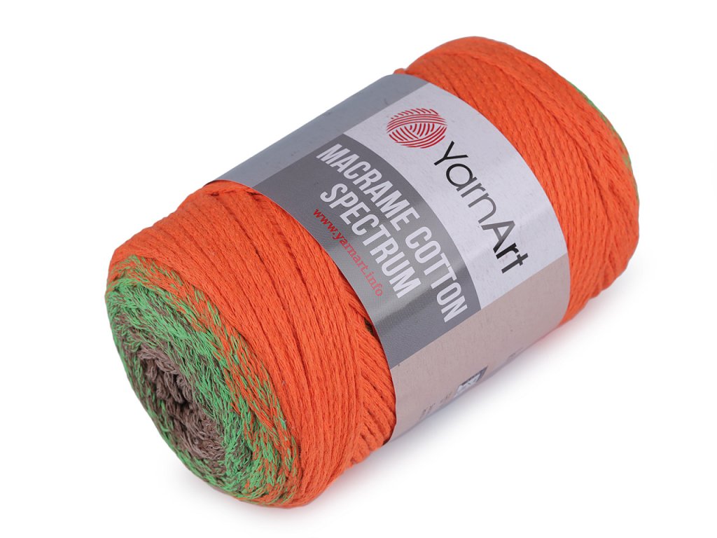 Příze Macrame Cotton Spectrum připomíná provázek. Je zajímavá svými barevnými přechody, se kterými budou všechny výrobky vypadat originálně. Využijete ji na pletení nebo háčkování pufů, košíků, koberečků i tašek, kde úžasně vyniknou její duhové přechody barev. Velikost jehlic: 5 Velikost háčku: 5- Průměr: cca 2 mm