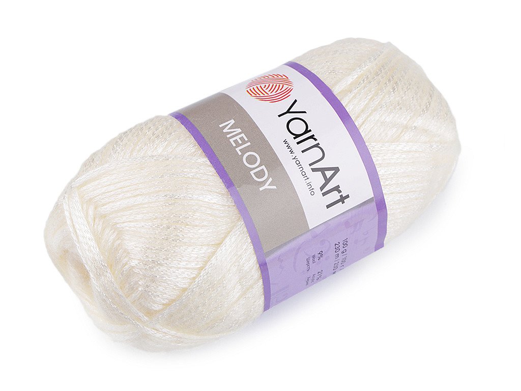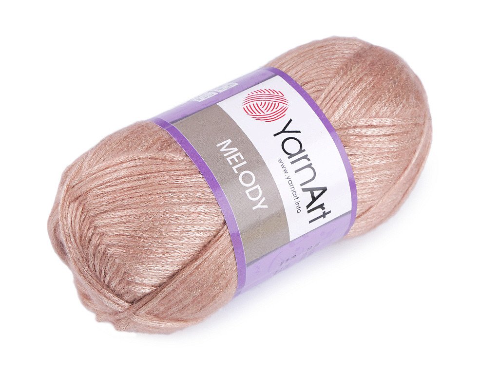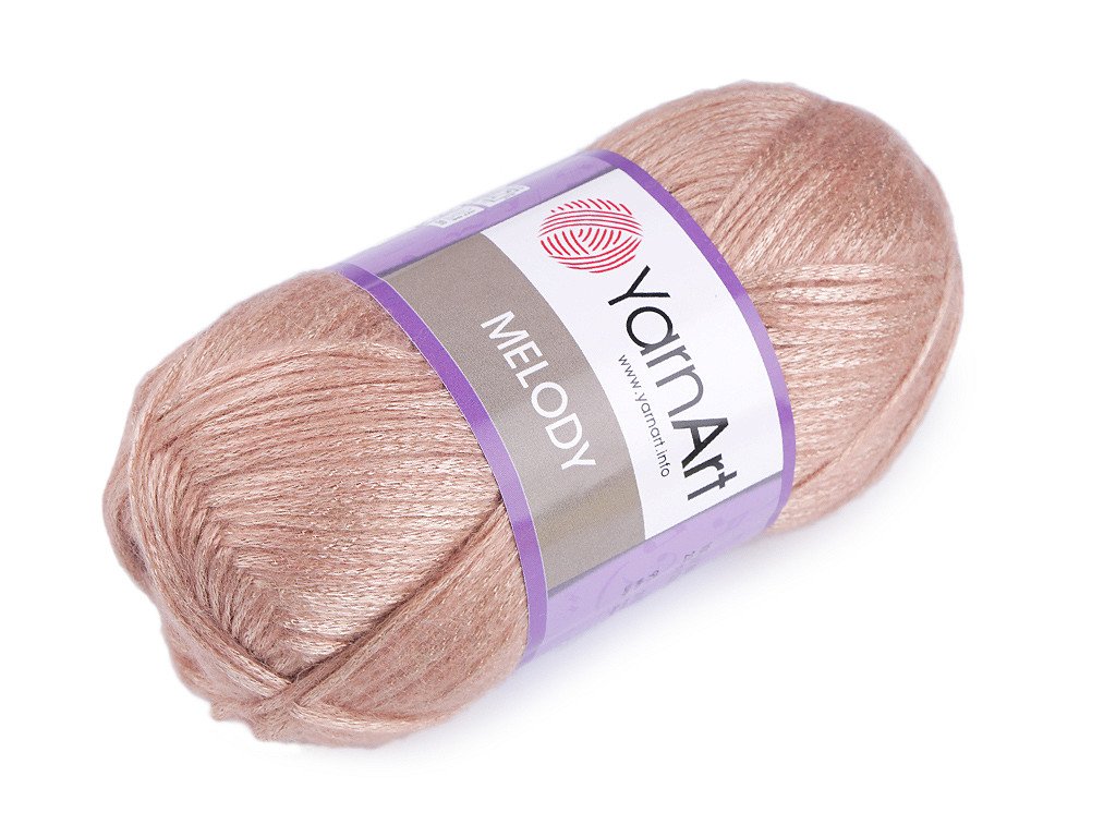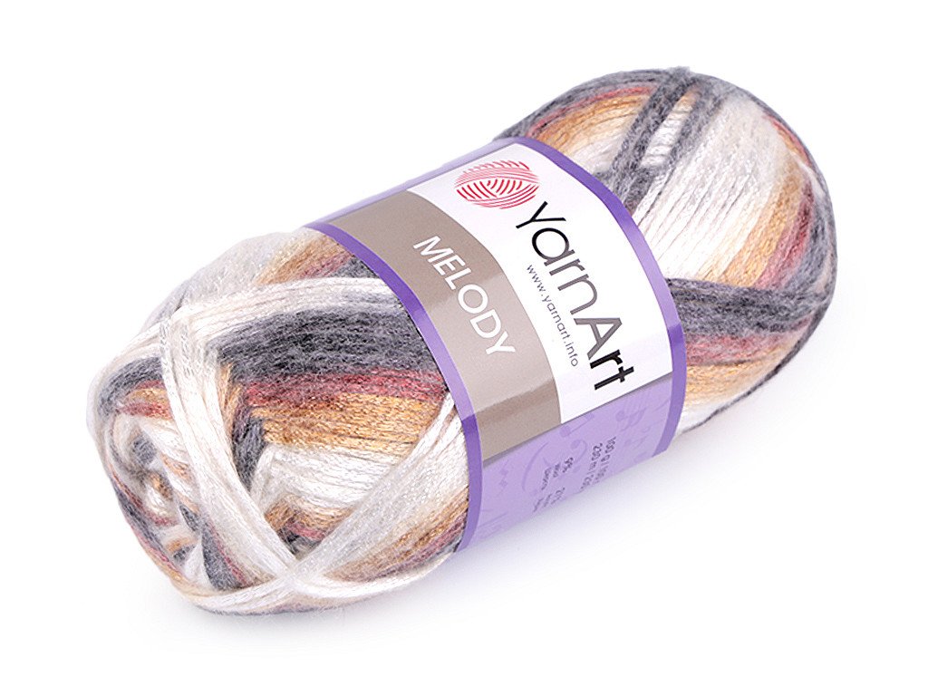 Pletací příze Melody zaujme svým jemným metalickým efektem. Použití: Přízi využijete k háčkování či pletení svetrů, čepic, vest apod. Velikost jehlic: 5 Velikost háčku: 5 Údaje o spotřebě příze najdete na poslední fotografii. Pokud přízi budete párat, je nutné postupovat velice opatrně, aby se nepoškodila. Před pletením / háčkováním doporučujeme udělat zkušební vzorek.- Hmotnost: 100 g