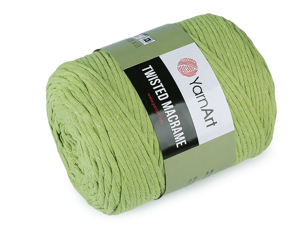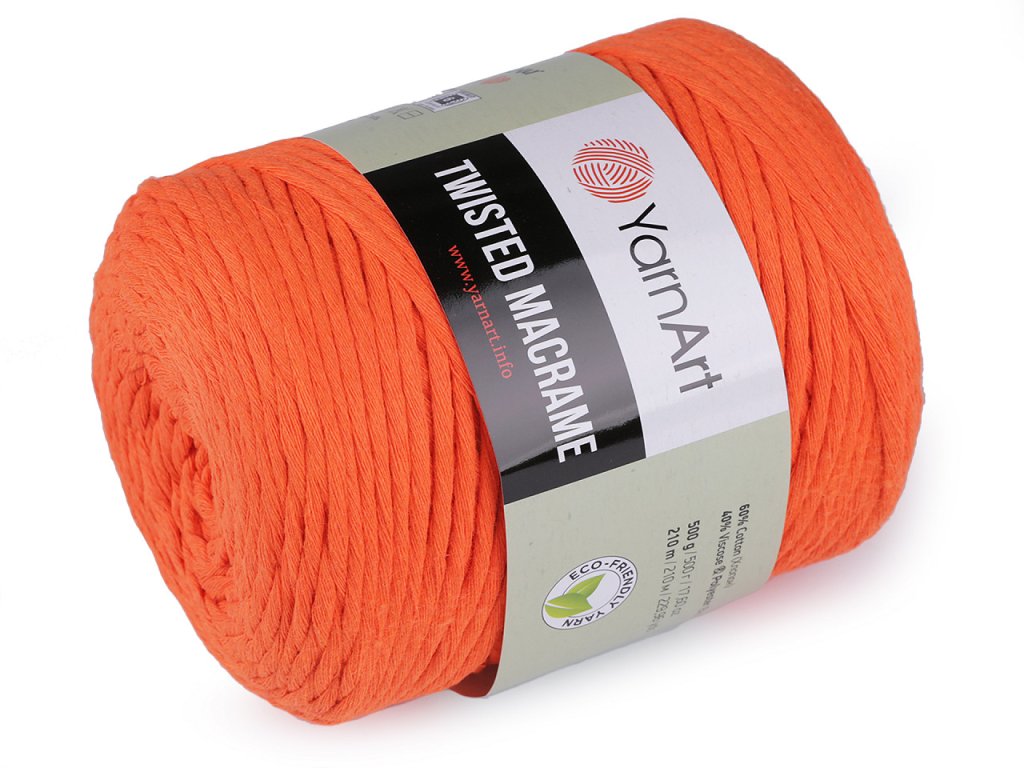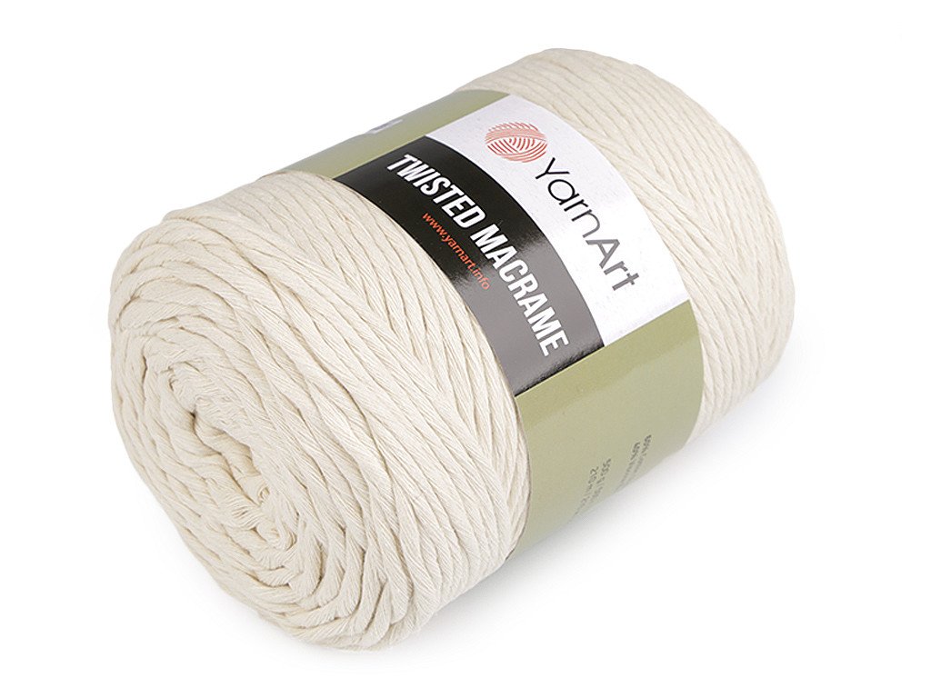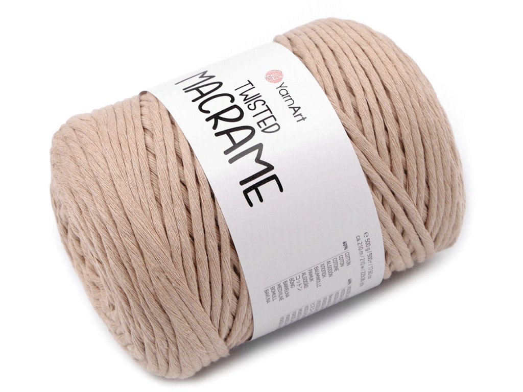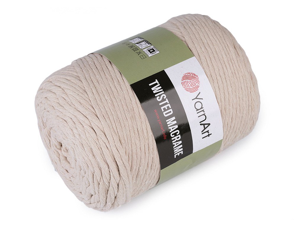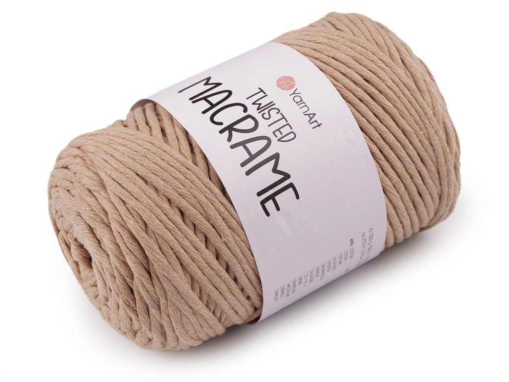 Příze Twisted Macrame je kroucená a připomíná provázek. Využijete ji na pletení nebo háčkování pufů, košíků, koberečků i tašek. Je vhodná také na výrobu macramé dekorací. Velikost jehlic: 9 Velikost háčku: 10 Vzorek na fotografii (88 x 27 cm) byl uháčkován z 1 klubíčka, háčkem č. 10.- Průměr: cca 3 mm