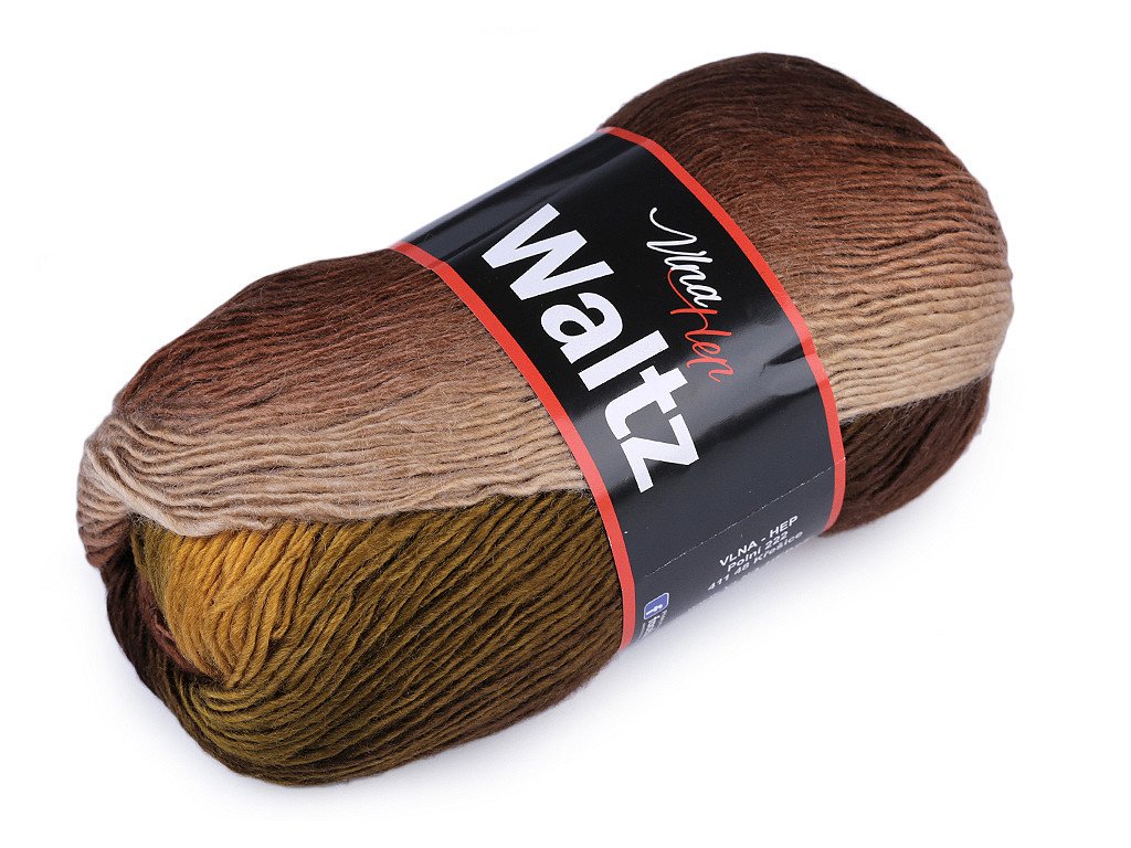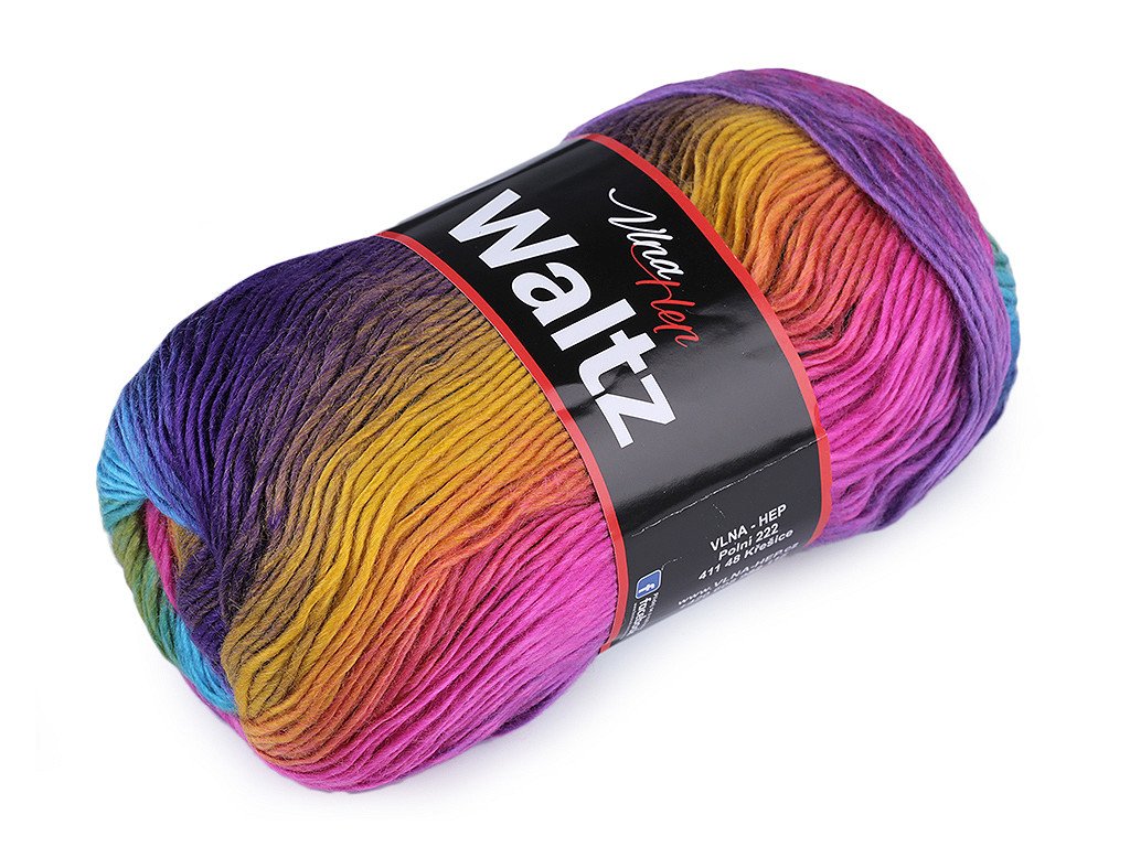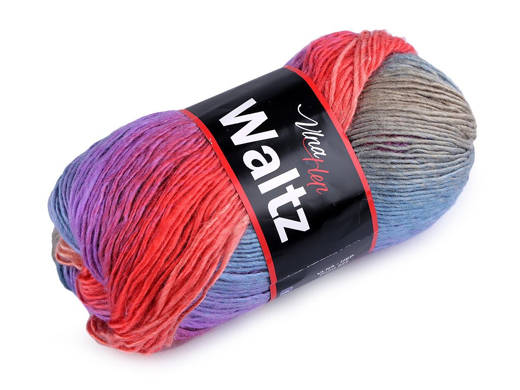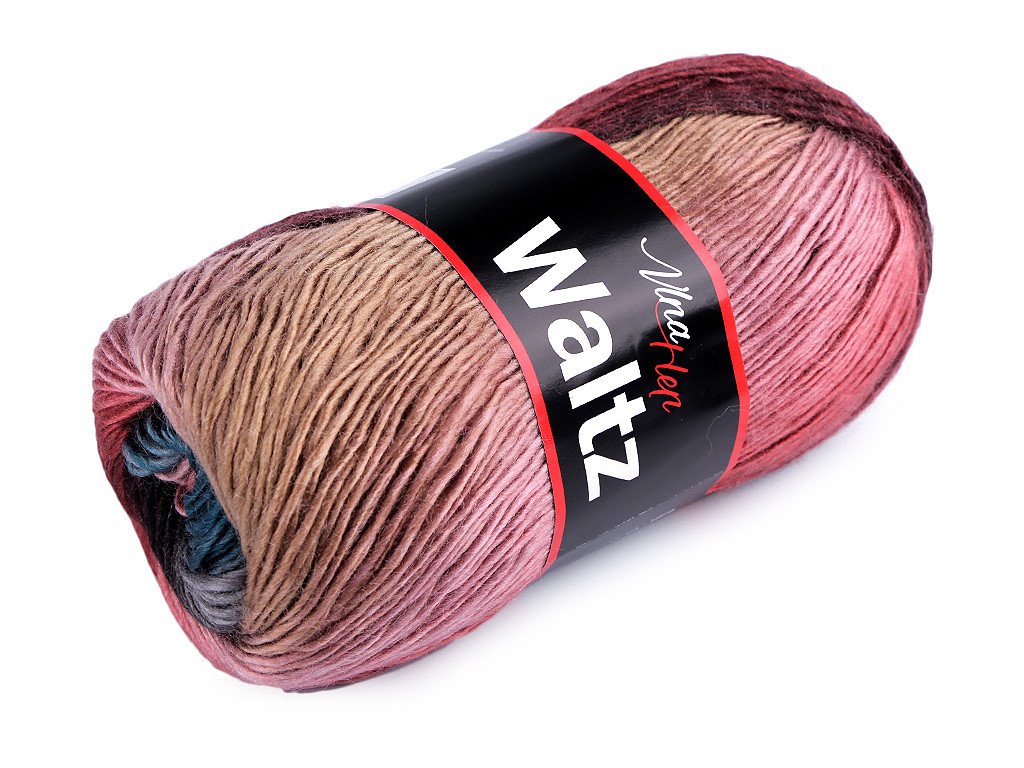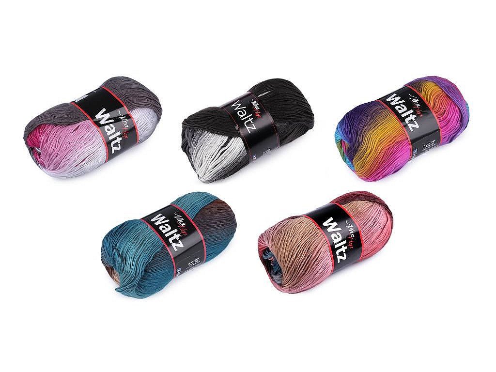 Příze Waltz si vás získá svým barevným efektem. Materiál je velice příjemný a měkký. Z příze můžete uplést či uháčkovat svetry, šály, čepice, rukavice, plédy apod. Velikost jehlic: 4 - 4,5 Velikost háčku: 4 - 4,5 Klubíčka mohou být od výrobce namotaná různě, uvnitř mohou být odlišné barevné odstíny než na povrchu. Vzorek na fotografii (68 x 22cm) byl uháčkován z 1 klubíčka, háčkem č. 4,5.- Hmotnost: 100 g