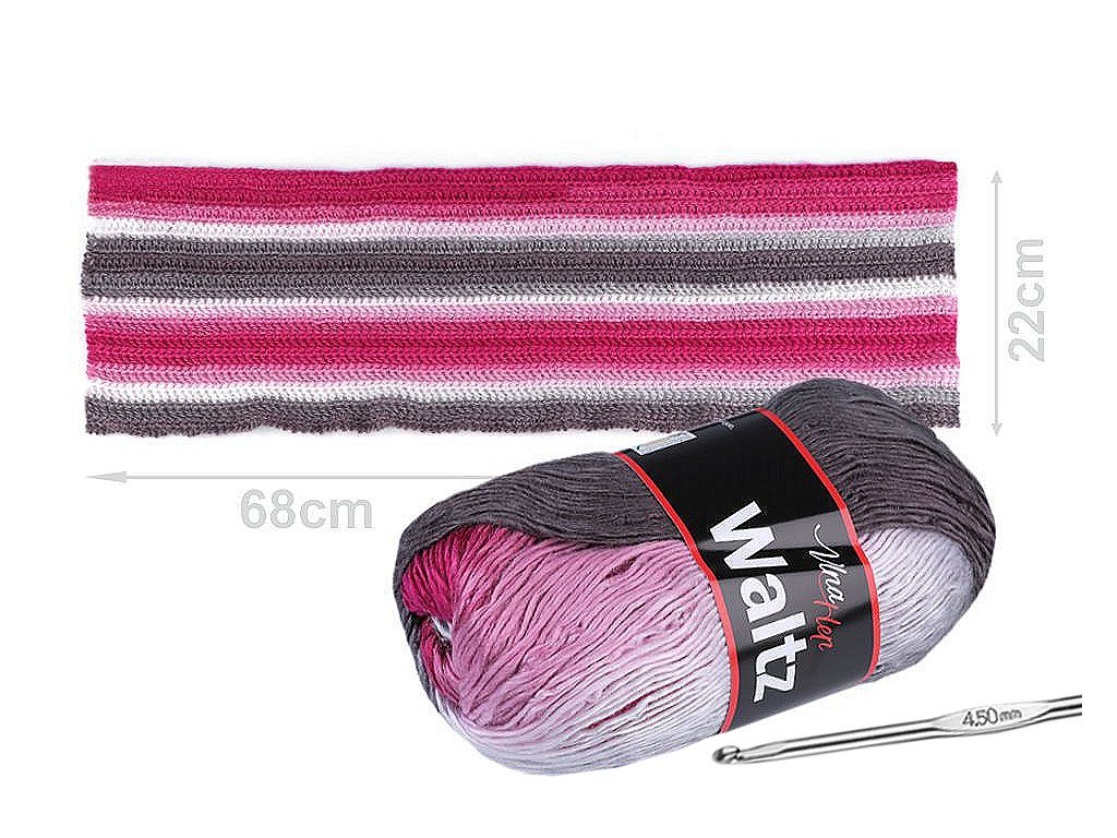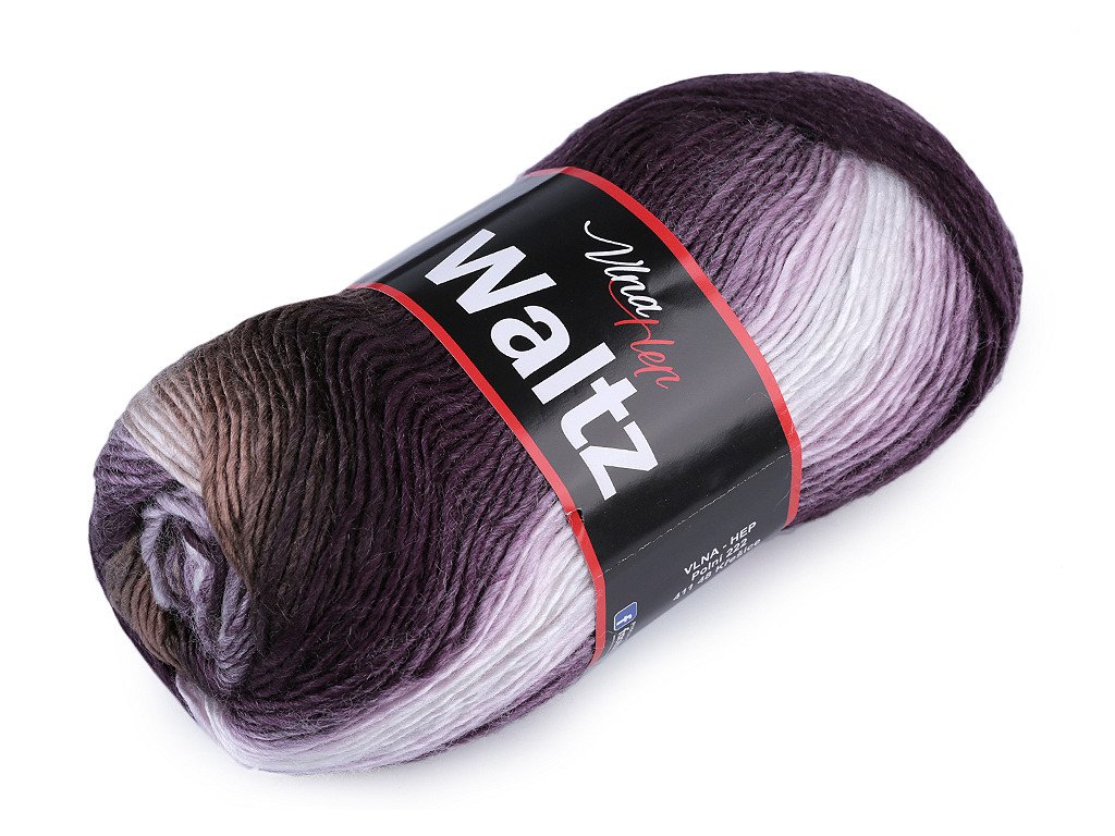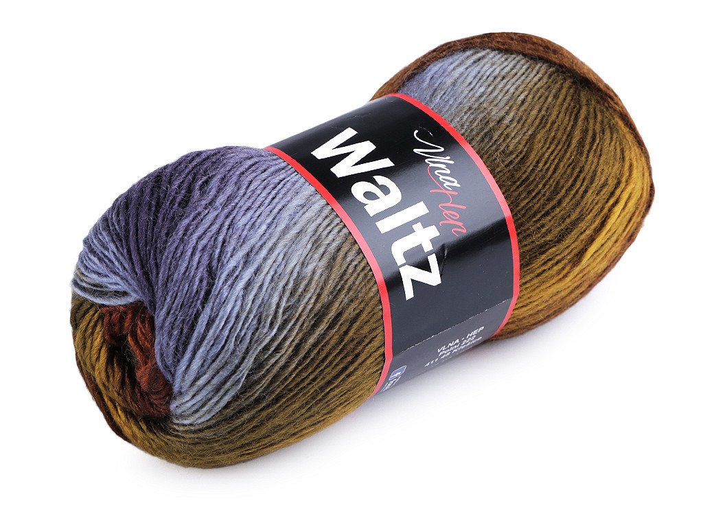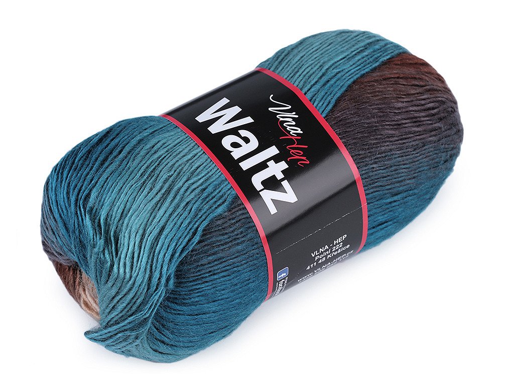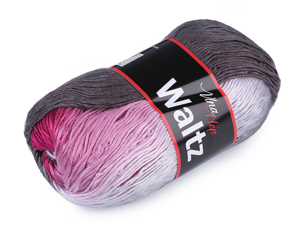 Příze Waltz si vás získá svým barevným efektem. Materiál je velice příjemný a měkký. Z příze můžete uplést či uháčkovat svetry, šály, čepice, rukavice, plédy apod. Velikost jehlic: 4 - 4,5 Velikost háčku: 4 - 4,5 Klubíčka mohou být od výrobce namotaná různě, uvnitř mohou být odlišné barevné odstíny než na povrchu. Vzorek na fotografii (68 x 22cm) byl uháčkován z 1 klubíčka, háčkem č. 4,5.- Hmotnost: 100 g