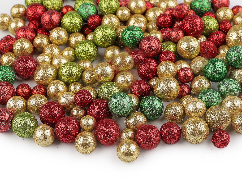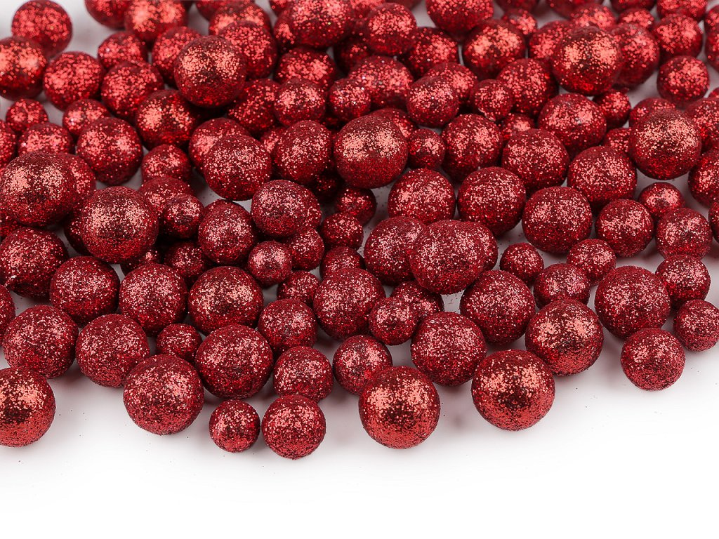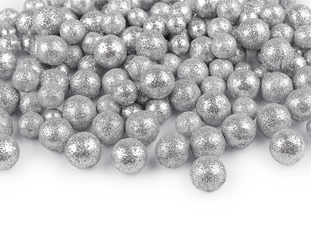 Polystyrenové kuličky s glitry využijete k aranžování i kreativnímu tvoření. Můžete je dekorativně nasypat do průhledné vázy či více menších sklenic a naaranžovat na sváteční tabuli, přilepit je na květiny, rámečky, větvičky ve váze apod. Používají se i na výrobu dekoračních stromečků. Větší polystyrenový kužel se polepí těmito drobnými kuličkami, napíchne se na vhodný kmínek a naaranžuje do květináče.- Průměr: 10; 12; 16 mm