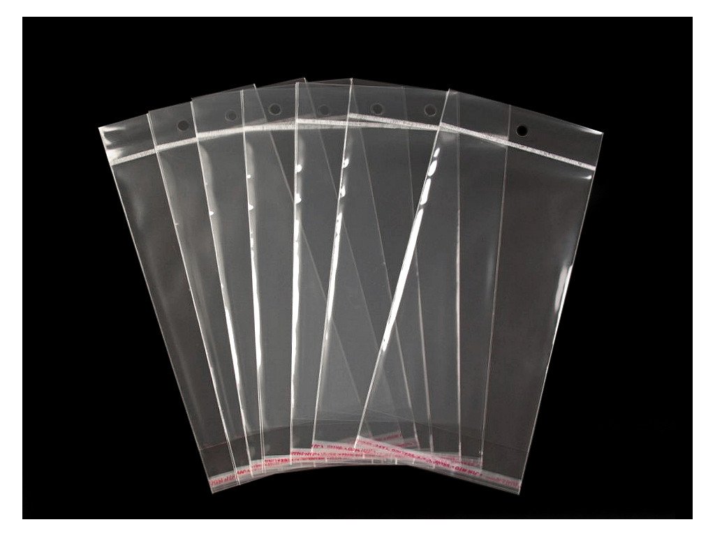 Lesklé sáčky o velikosti 11 x 20 cm jsou vhodné především pro náhrdelníky nebo náramky, ale lze použít i na kompletní sady. Z jedné strany jsou sáčky opatřeny lepicí lištou, díky které je snadno zalepíte i rozlepíte, a z druhé strany závěsem, abyste je mohli snadno zavěsit na viditelné místo.- Rozměry: 11 x 20 cm