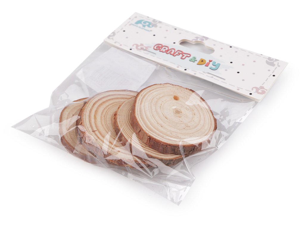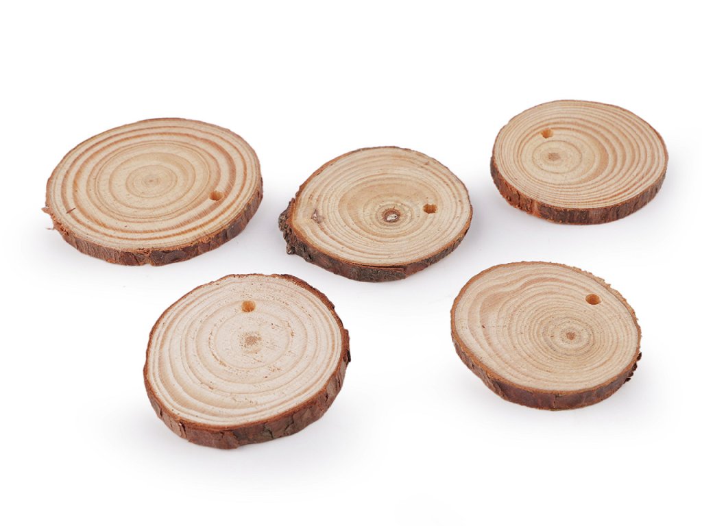 Přírodní dřevěný přívěsek s otvorem na zavěšení se hodí k dalšímu dotvoření. Je z obou stran rovný, po obvodu má kůru. Není barvený ani lakovaný, každý kus se může lišit jak barvou, tak kresbou dřeva. Přívěsky jsou vhodné pro další tvoření, pro výrobu madailí na dětské soutěže a tábory, na výrobu talismanů, visaček - třeba s čísly na adventní kalendář, jmenovek apod. K ozdobení můžete využít techniku malby, decoupage, lakování apod. V jednom sáčku je 5 ks koleček.- Průměr: cca 5 cm