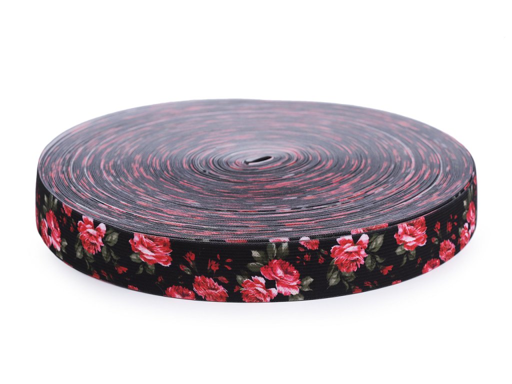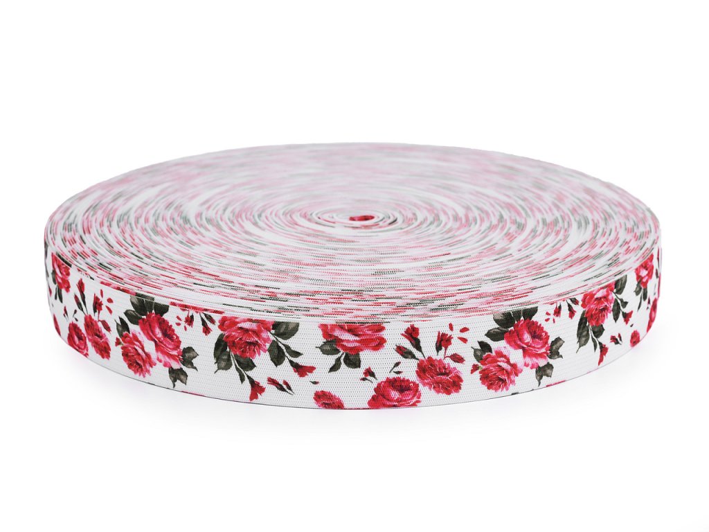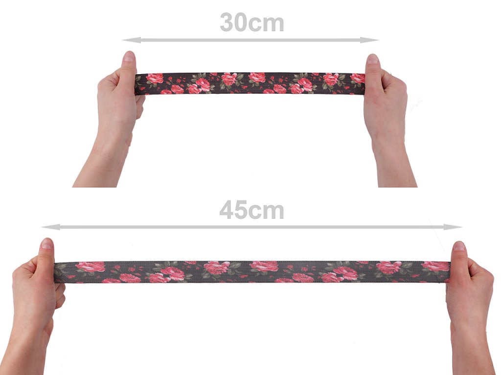 Pruženka s potiskem růží je vhodná do pasu sukní, šatů, kraťasů, halenek i na výrobu šlí. Potisk na pružence je jednostranný. Pruženka je pevná v tahu.- Šíře: 30 mm