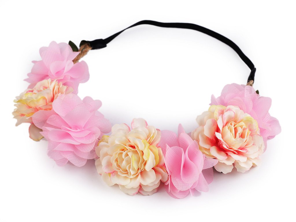 Čelenka s květy je velice romantická, je nádherná v rozpuštěných i zapletených vlasech. Neměla by chybět v účesu žádné družičky. Na spleteném copánku z voskovaných šňůrek jsou připevněné textilní květy. Do copánku je vpletený prýmek s lístečky. Zadní část tvoří pružná guma. Čelenka pevně drží, nepadá, je velice příjemná na nošení. Celkový obvod čelenky je 48 cm v nenataženém stavu.- Obvod: 48 - 65 cm