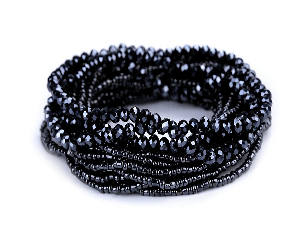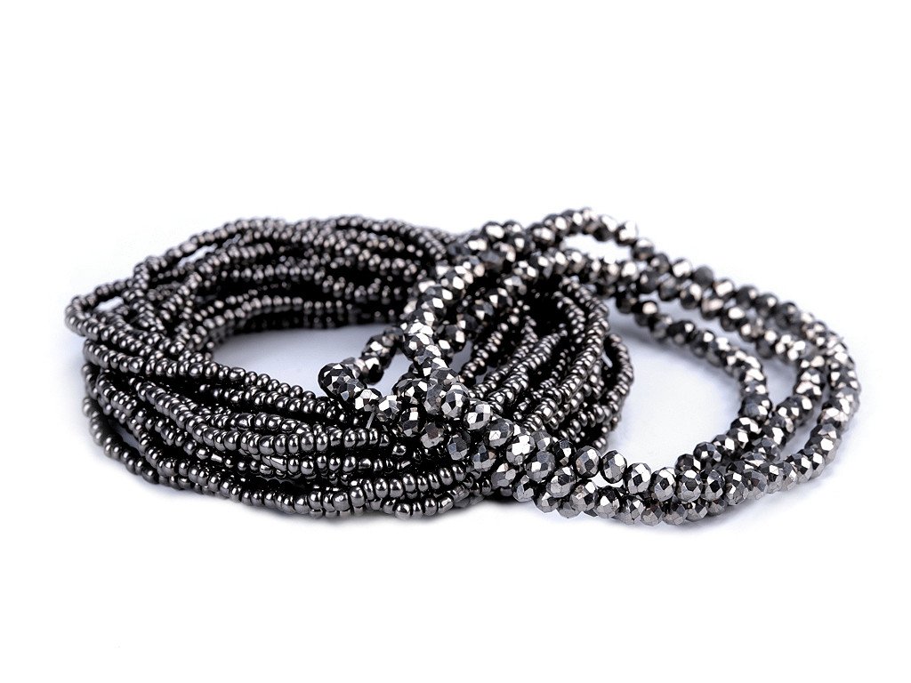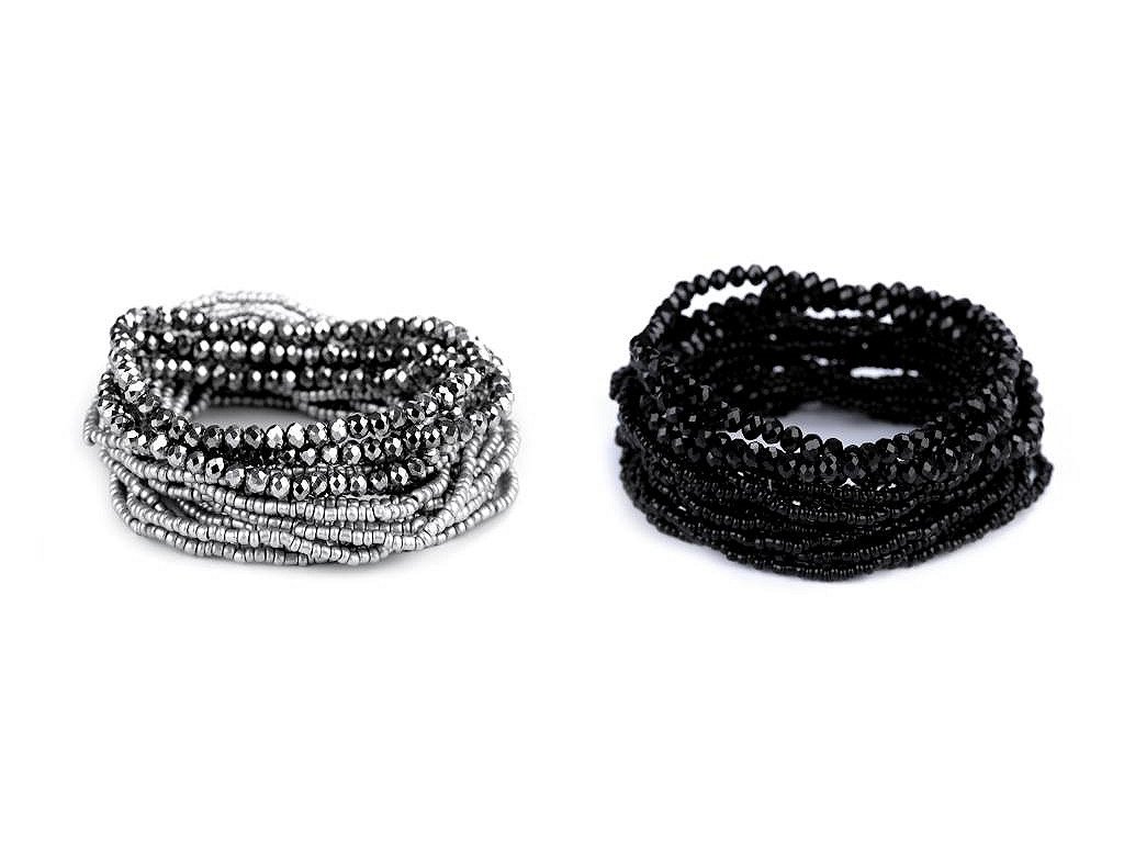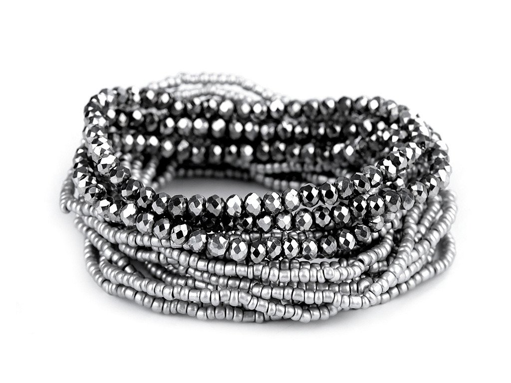 Sada elegantních náramků s kovovým vzhledem. Můžete je nosit všechny najednou nebo je použít samostatně. Náramky jsou pružné, sestavené z broušených korálků a rokajlu, které se lesknou a třpytí. Díky pružence se dobře navlékají na ruku. V jedné sadě je 18 náramků. Šířka celé sady je cca 6 cm. Sada č. 4 - černá - nemá kovový lesk.- Délka: cca 18 - 22 cm