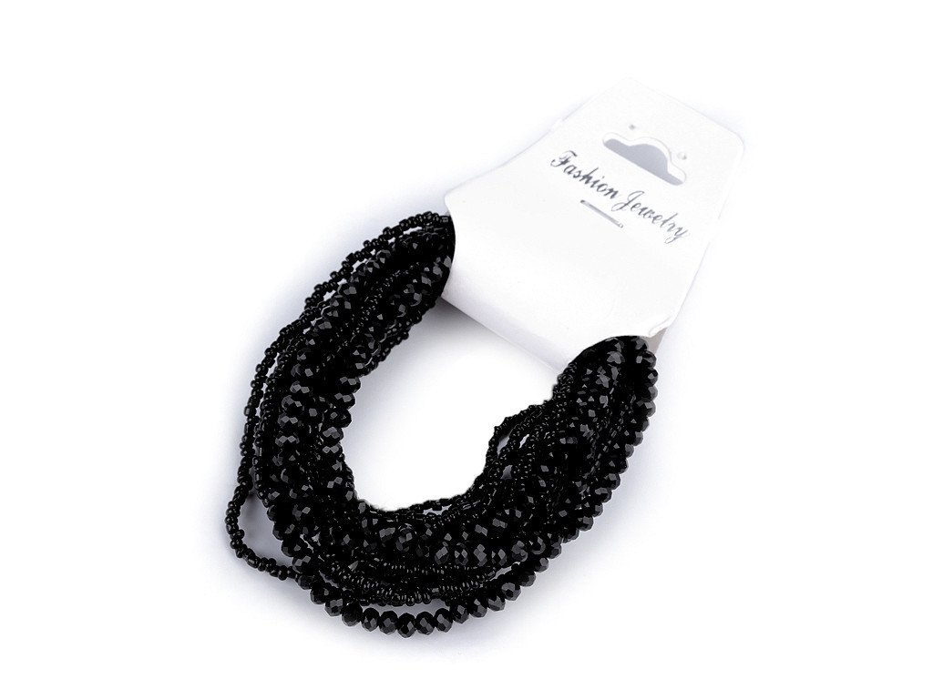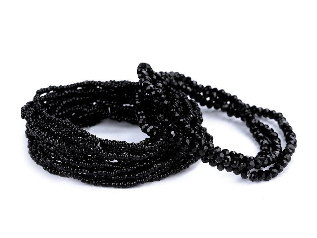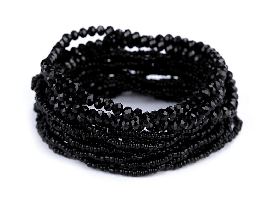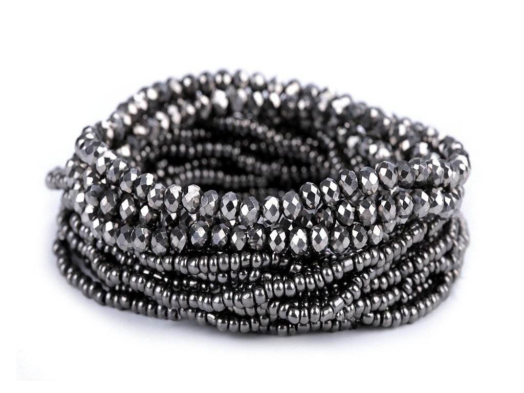 Sada elegantních náramků s kovovým vzhledem. Můžete je nosit všechny najednou nebo je použít samostatně. Náramky jsou pružné, sestavené z broušených korálků a rokajlu, které se lesknou a třpytí. Díky pružence se dobře navlékají na ruku. V jedné sadě je 18 náramků. Šířka celé sady je cca 6 cm. Sada č. 4 - černá - nemá kovový lesk.- Délka: cca 18 - 22 cm