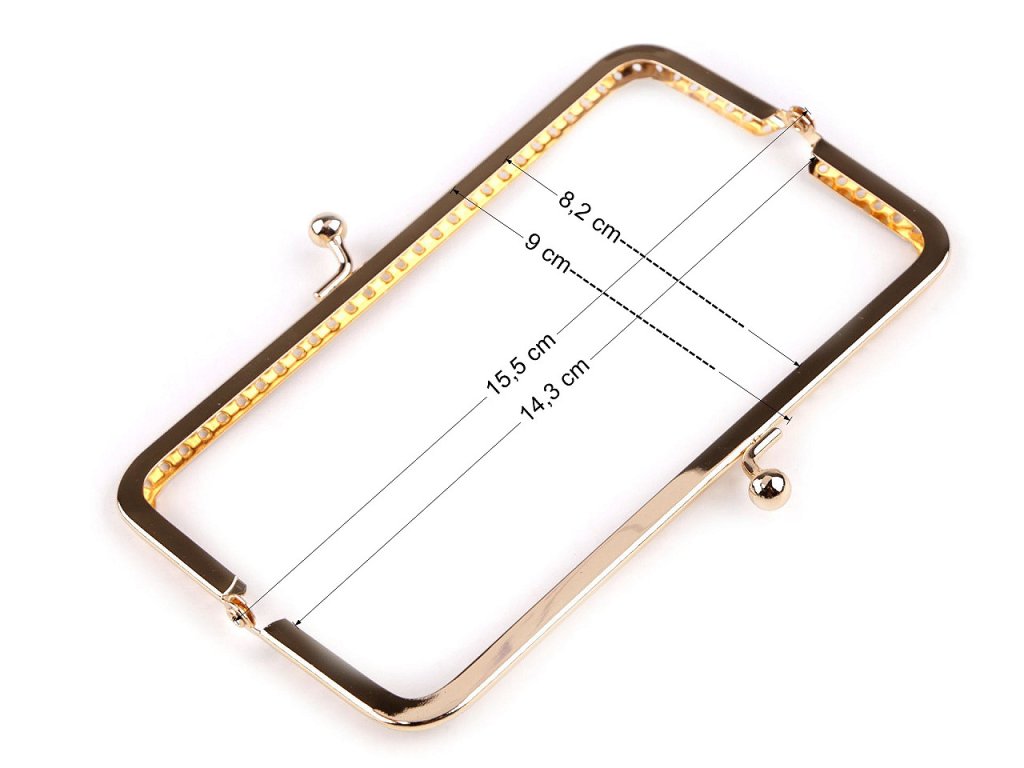 Kovový rámeček je vhodný na výrobu psaníčka nebo malé kabelky. Je určený k našití, kdy se látka dovnitř vloží a ručně přešije přes dírky, jejichž rozpětí je 5 mm. Dírky jsou jen na vnější straně rámečku, která je delší než vnitřní, tudíž je našívání jednodušší. Vnitřní rozměry rozvoru jsou 14,3 x 8,2 cm. Vnější rozměry rozvoru jsou 15,5 x 9 cm. Výška zavřeného rámečku bez zapínání je 5 cm, včetně zapínání je 6,3 cm.- Zavřený rámeček: 15,5 x 5 cm