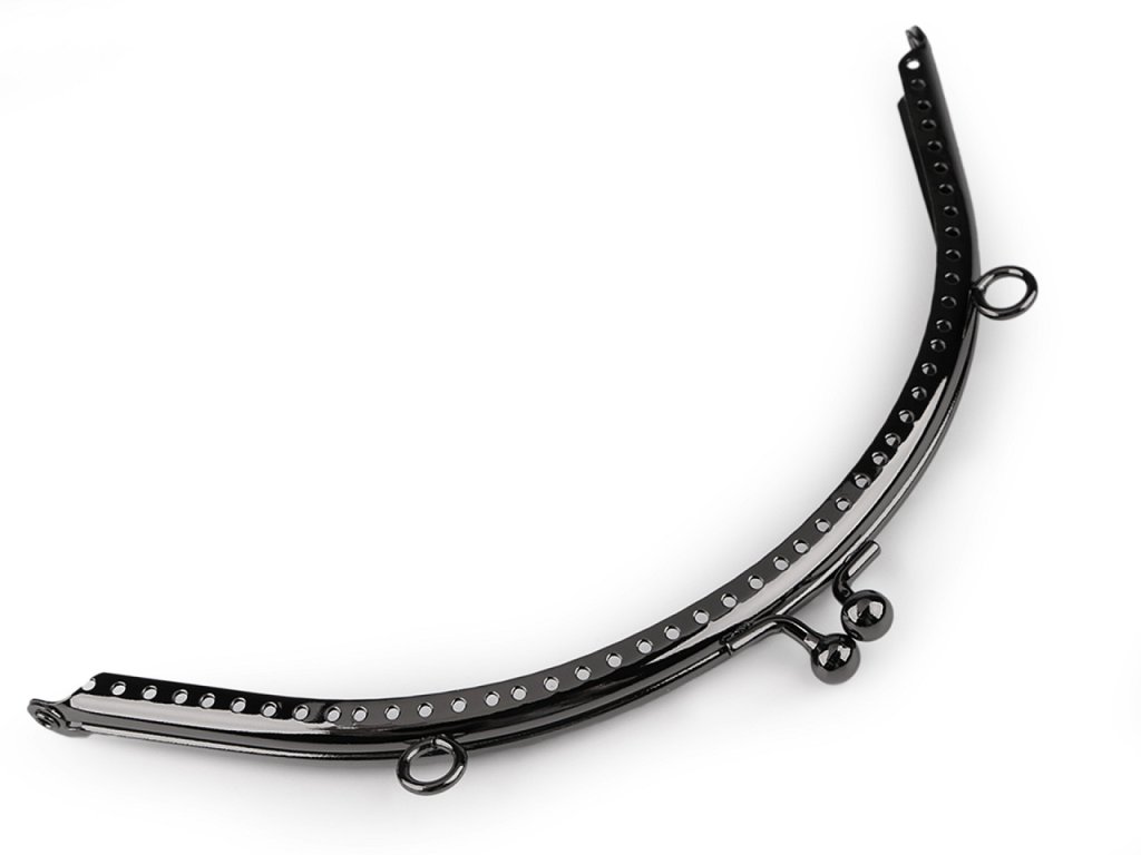 Kovový rámeček se zapínáním na výrobu kabelky. Zapínání má nahoře úchyty na ucha o průměru 1 cm. Rámeček je určený k našití, kdy se látka dovnitř vloží a ručně přešije přes dírky, jejichž rozpětí je 6 mm. Dírky jsou jen na vnější straně rámečku. Tento typ zapínání využijete určitě na jakýkoliv typ kabelky, ať už společenské nebo určené ke všednímu nošení. Vnitřní rozměry rozvoru jsou 17 x 13 cm. Vnější rozměry rozvoru jsou 18,5 x 14 cm. Výška zavřeného rámečku je 8 cm (10 cm včetně zapínání).- Zavřený rámeček: 18,5 x 8 cm
